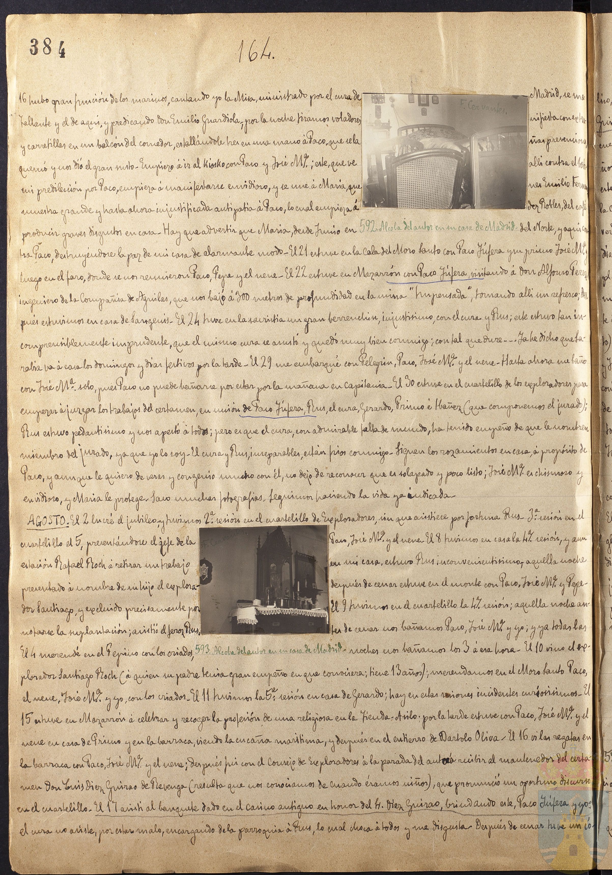 16 hubo gran función de los marinos, cantando yo la Misa, ministrado por el cura de Tallante y de aquí; y predicando don Emilio Guardiola, por la noche tiramos voladores y carretillas en un balcón del comedor, estallándole tres en una mano a Paco, que se la quemó y nos dio el gran susto. Empiezo á ir al kiosco con Paco y José Mª; este, que ve mi predilección por Paco, empieza á manifestarse envidioso, y se une á María, que muestra grande y hasta ahora injustificada antipatía á Paco, lo cual empieza á producir graves disgustos en casa. Hay que advertir que María, desde Junio en Madrid, se manifiesta con extrañas prevenciones allí contra el botones Emilio Fernández Robles, del café del Norte, y aquí contra Paco, destruyéndose la paz de mi casa de alarmante modo. El 21 estuve en la Cala del Moro Santo con Paco Yúfera y su primo José Mª y luego en el faro, donde se nos reunieron Paco, Pepe y el nene. El 22 estuve en Mazarrón con Paco Yúfera, visitando á don Alfonso Pérez, ingeniero de la Compañía de Águilas, que nos bajó á 300 metros de profundidad en la mina "Impensada", tomando allí un refresco; Después estuvimos en casa de Sangenís. El 24 tuve en la sacristía un gran berrenchín injustísimo con el cura y Rus; este estuvo tan incomprensiblemente imprudente que el mismo cura se asustó y quedó muy bien conmigo; con tal que dure... Ya he dicho que Sarabia va á casa los domingos y días festivos por la tarde. El 29 me embarqué con Pelegrín, Paco, José Mª y el nene. Hasta ahora me baño con José Mª solo, pues Paco no puede bañarse por estar por la mañana en Capitanía. El 30 estuve en el cuartelillo de los exploradores para empezar á juzgar los trabajos del certamen, en unión de Paco Yúfera, el cura, Gerardo, Primo é Ibáñez (que componemos el jurado); Rus estuvo pedantísimo y nos apestó a todos; pero es que el cura, con admirable falta de mundo, ha tenido empeño de que le nombren miembro del jurado, ya que yo lo soy. El cura y Rus, inseparables, están fríos conmigo. Siguen los rozamientos en casa; á propósito de Paco, y aunque le quiero de veras y congenio mucho con él, no dejo de reconocer que es solapado y poco listo; José Mª es chismoso y envidioso y María le protege. Saco muchas fotografías. Seguimos haciendo la vida ya indicada.