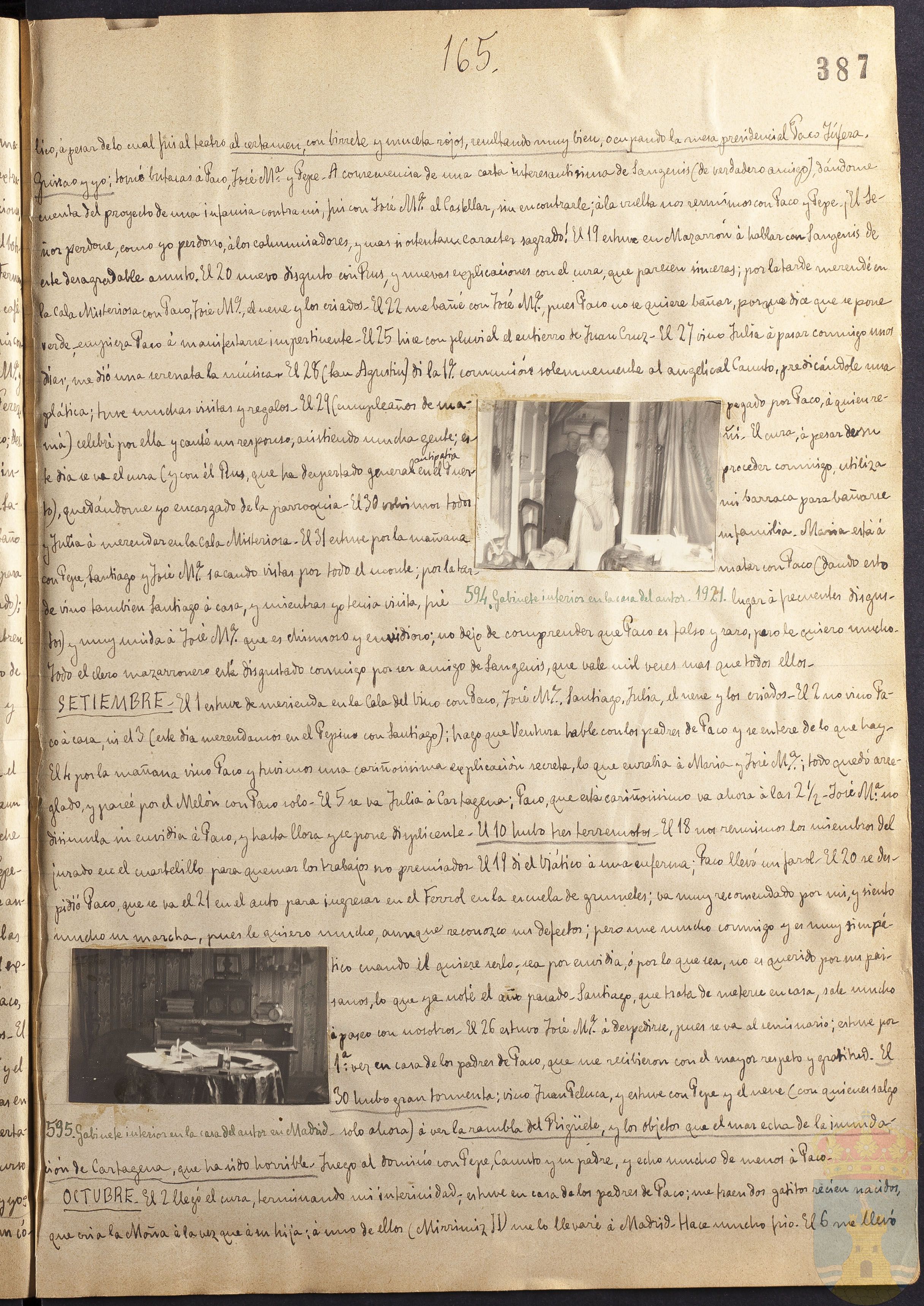 SETIEMBRE. El 1 estuve de merienda en la Cala del Vino con Paco, José Mª, Santiago, el nene y los criados. El 2 no vino Paco á casa, ni el 3 (este día merendamos en el Pepino con Santiago); hago que Ventura hable con los padres de Paco y se entere de lo que hay. El 4 por la mañana vino Paco y tuvimos una cariñosísima explicación secreta, lo que euralia? a María y José Mª; todo quedó arreglado y paseé por el Melón con Paco solo. El 5 se va Julia á Cartagena; Paco, que está cariñosísimo va ahora á las 2 1/2. José Mª no disimula su envidia a Paco, y hasta llora y se pone disciplente. El 20 hubo tres terremotos. El 18 nos reunimos los miembros del jurado en el cuartelillo para quemar los trabajos no premiados. El 19 dí el Viático á una enferma; Paco llevó un farol. El 20 se despidió Paco, que se va el 21 en el auto para ingresar en el Ferrol en la escuela de grumetes, va muy recomendado por mí, y siento mucho su marcha, pues le quiero mucho, aunque reconozco sus defectos; pero une mucho conmigo y es muy simpático cuando él quiere serlo; sea por envidia, ó por lo que sea, no es querido por sus paisanos, lo que ya noté el año pasado. Santiago, que trata de meterse en casa, sale mucho á paseo con nosotros. El 26 estuvo José M! á despedirse, pues se va al seminario; estuve por 1ª vez en casa de los padres de Paco, que me recibieron con el mayor respeto y gratitud. El 30 hubo gran tormenta; vino Juan Peluca, y estuve con Pepe y el nene (con quienes salgo solo ahora) á ver la rambla del Rigüete y los objetos que el mar echa de la inundación de Cartagena, que ha sido horrible. Juego al dominó con Pepe, Canuto y su padre, y echo mucho de menos á Paco.