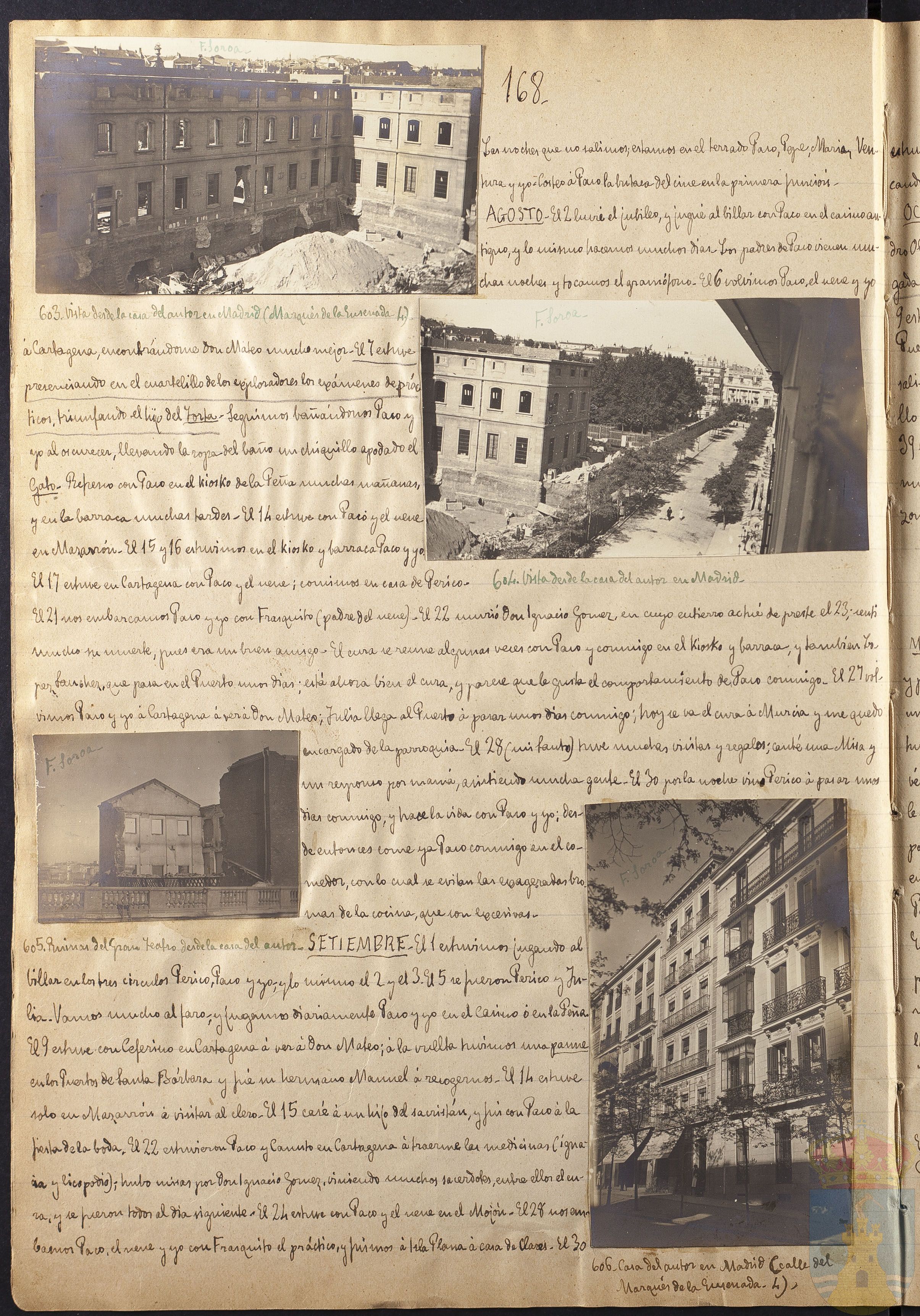 AGOSTO. El 2 lucré el jubileo, y jugué al billar con Paco en el casino antiguo, y lo mismo hacemos muchos días. Los padres de Paco vienen muchas noches y tocamos el gramófono. El 6 volvimos Paco, el nene y yo á Cartagena, encontrándome don Mateo mucho mejor. El 7 estuve presenciando en el cuartelillo de los exploradores los exámenes de prácticos, triunfando el hijo del Torta. Seguimos bañándonos Paco y yo al oscurecer, llevando la ropa del baño un chiquillo apodado el Gato. Refresco con Paco en el kiosco de la Peña muchas mañanas, y en la barraca muchas tardes. El 14 estuve con Paco y el nene en Mazarrón. El 15 y el 16 estuvimos en el kiosco y barraca Paco y yo. El 17 estuve en Cartagena con Paco y yo con Frasquito (padre del nene). El 22 murió don Ignacio Gómez, en cuyo entierro actué de preste el 23; sentí mucho su muerte, pues era un buen amigo. El cura se reúne algunas veces con Paco y conmigo en el kiosco y barraca, y también López Sánchez, que pasa en el Puerto unos días; está ahora bien el cura, y parece que le gusta el comportamiento de Paco conmigo. El 27 volvimos Paco y yo á Cartagena á ver á don Mateo; Julia llega al Puerto á pasar unos días conmigo; hoy se va el cura á Murcia y me quedo encargado de la parroquia. El 28 (mi santo) tuve muchas visitas y regalos; canté una Misa y un responso por mamá, asistiendo mucha gente. El 30 por la noche vino Perico á pasar unos días conmigo, y hace la vida con Paco y yo; desde entonces come ya Paco conmigo en el comedor, con lo cual se evitan las exageradas bromas de la cocina, que son excesivas.