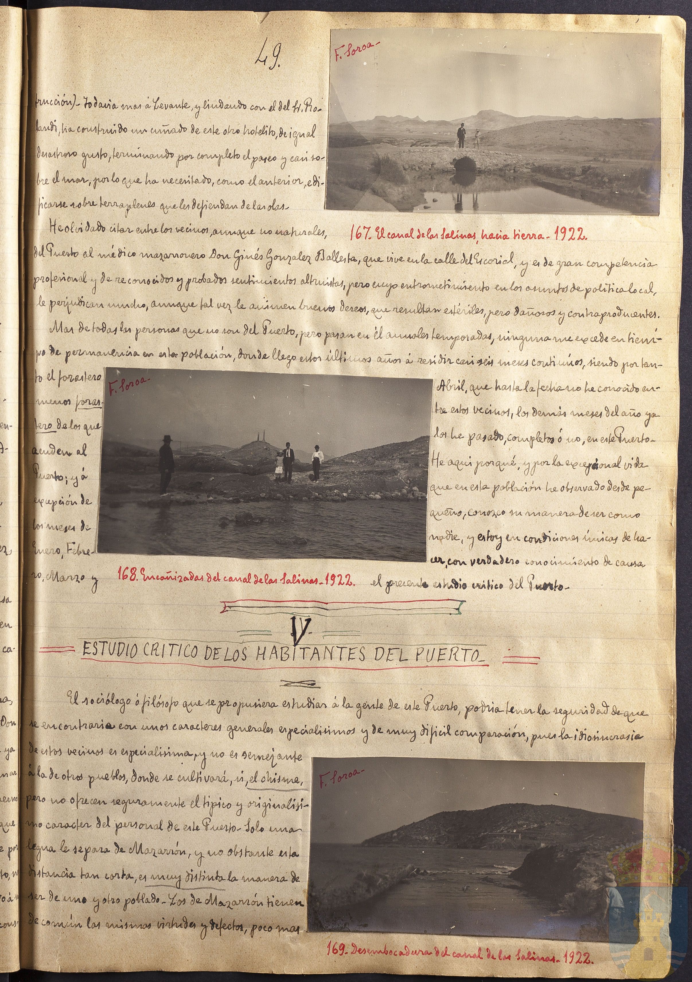 Mas de todas las personas que no son del Puerto, pero pasan en él anuales temporadas, ninguna me excede en tiempo de permanencia en la población, donde llego estos últimos años a residir casi seis maeses continuos, siendo por tanto el forastero de los que acuden al Puerto y a excepción de los meses de enero, febrero, marzo y abril, que hasta la fecha no he conocido entre estos vecinos, los demás meses del año ya los he pasado, completos o no, en este Puerto. He aquí porqué y por la excepcional vida que en esta población he observado desde pequeño, conozco su manera de ser como nadie, y estoy en condiciones únicas de hacer con verdadero conocimiento de causa el presente estudio crítico del Puerto.