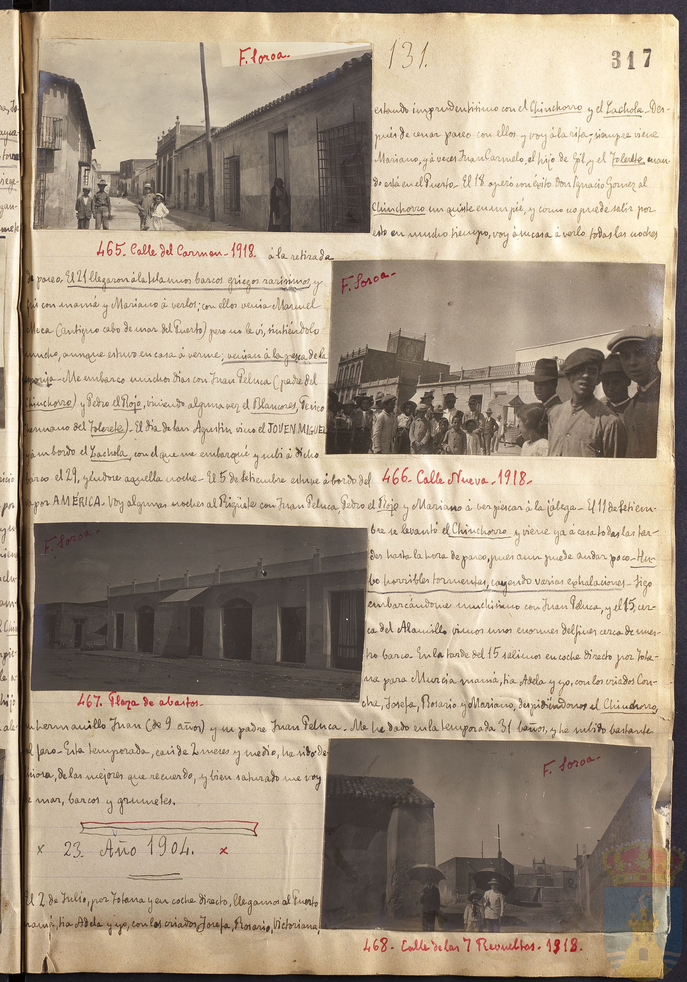 estando imprudentísimo con el Chinchorro y el Lachola. Después de cenar paseo con ellos y voy á la rifa; siempre viene Mariano, y á veces Juan Carmelo, el hijo de Gil, y el Tolorete, cuando está en el Puerto.el 18 operó con éxito Don Ignacio Gómez al Chinchorro un quiste en un pié, y como no puede salir por esto en mucho tiempo, voy á su casa á verlo todas las noches de paseo. El 21 llegaron á la Isla unos barcos griegos rarísimos, y fuí con mamá y Mariano a verlos; con ellos venía Manuel Meca (antiguo cabo de mar del Puerto) pero no lo ví; sintiéndolo mucho, aunque estuvo en casa á verme, venían á la pesca de la esponja. Me embarco muchos días con Juan Peluca (padre del Chinchorro) y Pedro el Rojo, viniendo alguna vez el Blancores, Perico (hermano del Tolorete). El día de San Agustín vino el JOVEN MIGUEL y a su bordo el Lachola, con el que me embarqué y subí a dicho barco el 29, yéndose aquella noche. el 5 de Septiembre estuve á bordo del AMÉRICA. Voy algunas noches al Rihuete con Juan Peluca, Pedro el Rojo y Mariano á ver pescar a la jábega. El 11 de Septiembre se levantó el Chinchorro y viene ya á casa todas las tardes hasta la hora de paseo, pues aun puede andar poco. Hubo horribles tormentas, cayendo varias exhalaciones. Sigo embarcándome muchísimo con Juan Peluca, y el 15, cerca del Alamillo vimos unos enormes delfines cerca de nuestro barco. En la tarde del 15 salimos en coche directo por Totana para Murcia mamá, tía Adela y yo, con los criados Concha, Josefa y Mariano, despidiéndonos el Chinchorro, su hermanillo Juan (de 9 años) y su padre Juan Peluca. Me he dado en la temporada 31 baños y he subido bastante al faro. Esta temporada, de casi 2 meses y medio, ha sido deliciosa, de las mejores que recuerdo, y bien saturado me voy de mar, barcos y grumetes.