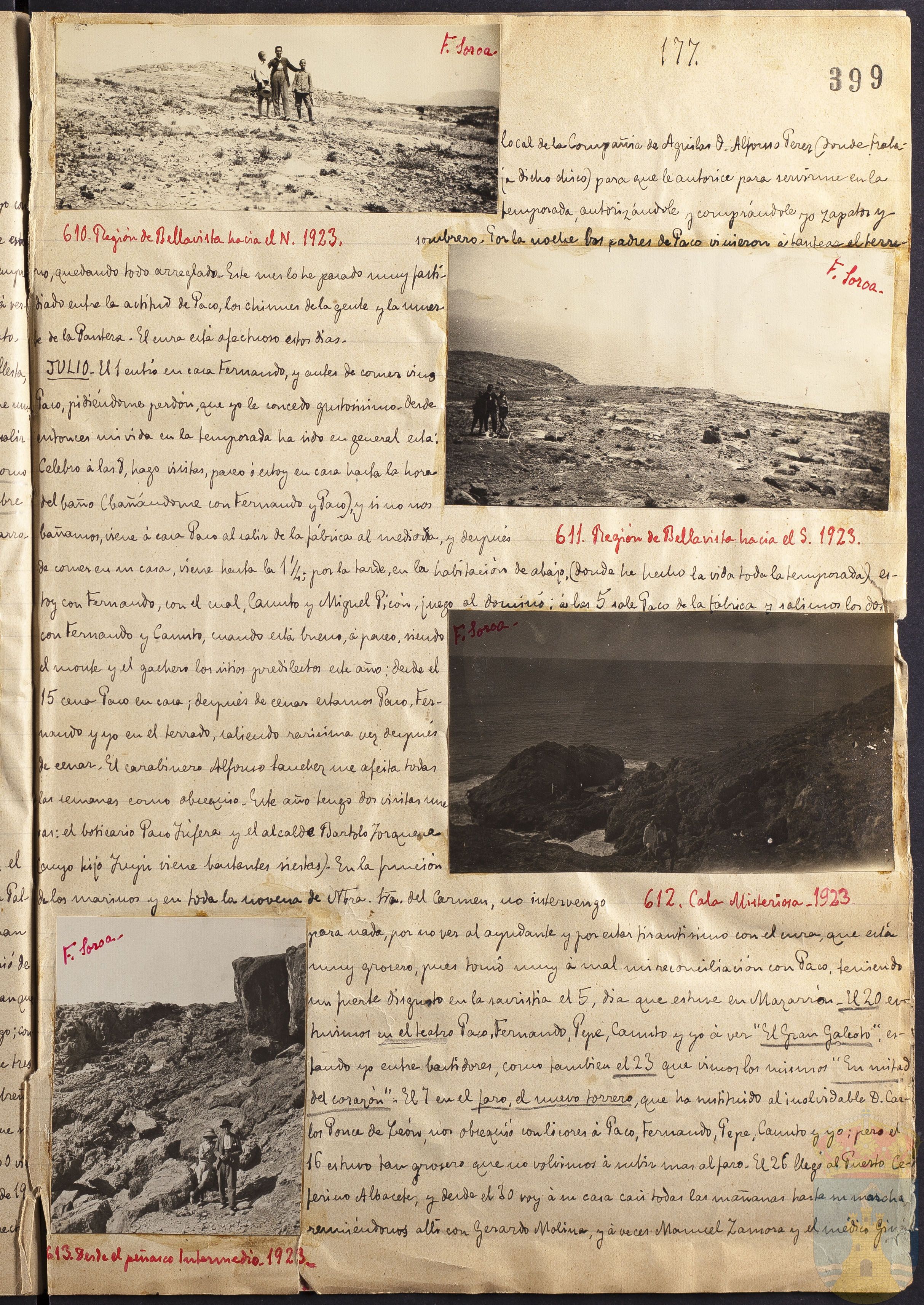 JULIO. El 1 entró en casa Fernando, y antes de comer vino Paco, pidiéndome perdón, que yo le concedo gustosísimo. Desde entonces mi vida en la temporada ha sido en general esta: Celebro á las 8, hago visitas, paseo ó estoy en casa hasta la hora del baño (bañándome con Fernando y Paco) y si no nos bañamos, viene á casa Paco al salir de la fábrica al mediodía, y después de comer en su casa, viene hasta la 1 1/4; por la tarde, en la habitación de abajo (donde he hecho la vida toda la temporada) estoy con Fernando, con el cual, Canuto y Miguel Picón, juego al dominó; á las 5 sale Paco de la fábrica y salimos los dos con Fernando y Canuto, cuando está bueno, á paseo, siendo el monte y el gachero los sitios predilectos este año; desde el 15 cena Paco en casa; después de cenar estamos Paco, Fernando y yo en el terrado, saliendo rarísima vez después de cenar. El carabinero Alfonso Sánchez me afeita todas las semanas como obsequio. Este año tengo dos visitas nuevas: el boticario Paco Yúfera y el alcalde Bartolo Jorquera (cuyo hijo Yuyú viene bastantes siestas). En la función de los marinos y en toda la novena de Ntra. Sra. del Carmen, no intervengo para nada, por no ver al ayudante y por estar tirantísimo con el cura, que está muy grosero, pues tomó muy á mal mi reconciliación con Paco, teniendo un fuerte disgusto en la sacristía el 5, día que estuve en Mazarrón. El 20 estuvimos en el teatro Paco, Fernando, Canuto y yo á ver "El Gran Galeoto¹", estando yo entre bastidores, como también el 23 que vimos "En mitad del corazón²". El 7 en el faro, el nuevo torrero, que ha sustituido al inolvidable D. Carlos Ponce de León, nos obsequió con licores á Paco, Fernando, Pepe, Canuto y yo; pero el 16 estuvo tan grosero que no volvimos á subir más al faro. El 26 llegó al Puerto Ceferino Albacete, y desde el 30 voy á su casa casi todas las mañanas hasta su marcha, reuniéndonos allí con Gerardo Molina y á veces Manuel Zamora y el médico Ginés...