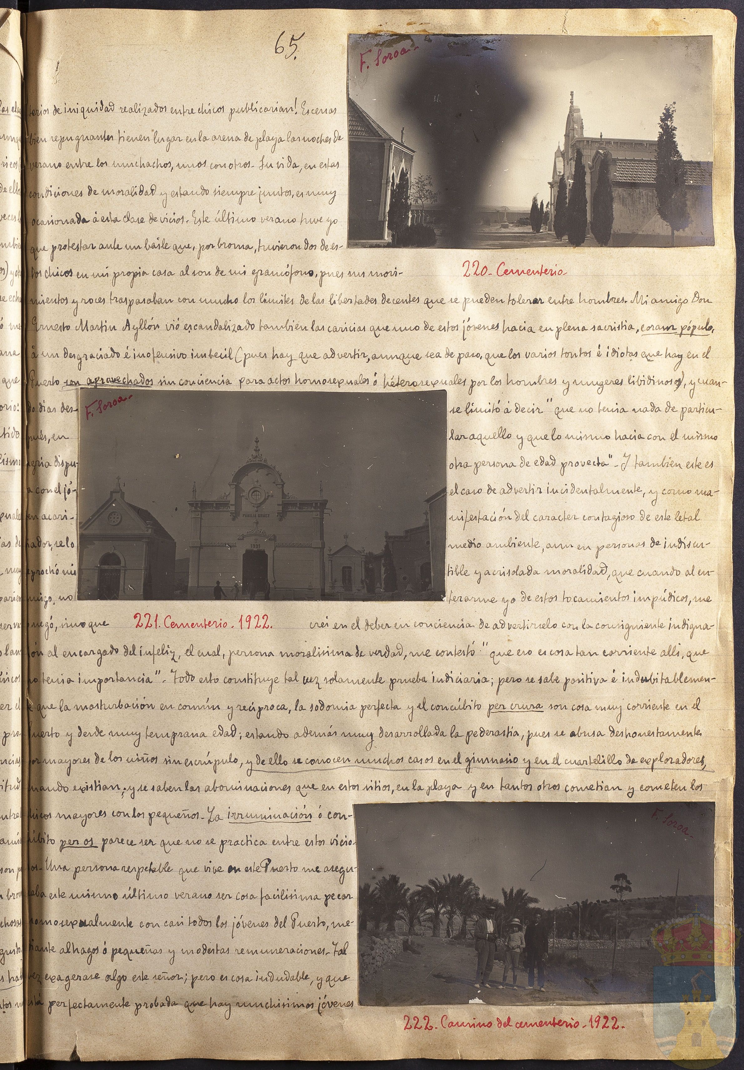 (...) e iniquidad realizados entre chicos publicarían! Escenas bien repugnantes tienen lugar en la arena de playa las noches de verano entre los muchachos, unos con otros. Su vida, en estas condiciones de moralidad y están siempre juntos, es muy ocasionada á esta clase de vicios. Este último verano tuve yo que protestar ante un baile que, por broma, tuvieron dos de estos chicos en mi propia casa al son de mi gramófono, pues sus movimientos y roces traspasaban con mucho los límites de las libertades decentes que se pueden tolerar entre hombres. Mi amigo Don Ernesto Martín Ayllón vió escandalizado también las caricias que uno de estos jóvenes hacía en plena sacristía, coram pópulo, de un desgraciado é inofensivo imbecil (pues hay que advertir, aunque sea de paso, que los varios tontos é idiotas que hay en el Puerto son aprovechados sin conciencia para actos homosexuales: heterosexuales por los hombres y mujeres libidinosos, y cuando días después, en agria disputa con el joven acariciador se lo reprochó mi amigo, no negó sino que se limitó a decir «que no tenía nada de particular aquello y que lo mismo hacía con el mismo otra persona de edad provecta». Y también este es el caso de advertir incidentalmente, y como manifestación del carácter contagioso de este letal medio ambiente, aun en personas de indiscutible y acrisolada moralidad, que cuando al enterarme yo de estos tocamientos impúdicos, me creí en el deber de advertírselo con la consiguiente indignación al encargado del infeliz, el cual, persona moralísima de verdad, me contestó: «que eso es cosa tan corriente allí que no tenía importancia». Todo esto constituye tal vez solamente prueba indiciaria; pero se sabe positiva é indubitablemente que la masturbación es común y recíproca, la sodomia perfecta y el concúbito per cruza? son muy corriente en el Puerto y desde muy temprana edad; estando además muy desarrollada la pederastia, pues se abusa deshonestamente mayores de los niños sin escrúpulo, y de ello se conocen muchos casos en el gimnasio y en el cuartelillo de exploradores cuando existían; y se saben las abominaciones que en estos sitios, en la playa y en tantos otros cometían y cometen los chicos mayores con los pequeños. La irruminación ó concúbito per os parece ser que no se practica entre estos viciosos. Una persona respetable que vive en este Puerto me aseguraba este mismo último verano ser cosa facilísima pecar homosexualmente con casi todos los jóvenes del Puerto, mediante halagos ó pequeñas o modestas remuneraciones. Tal vez exagerase algo este señor; pero es cosa indudable, y que está perfectamente probada que hay muchísimos jóvenes [...]
