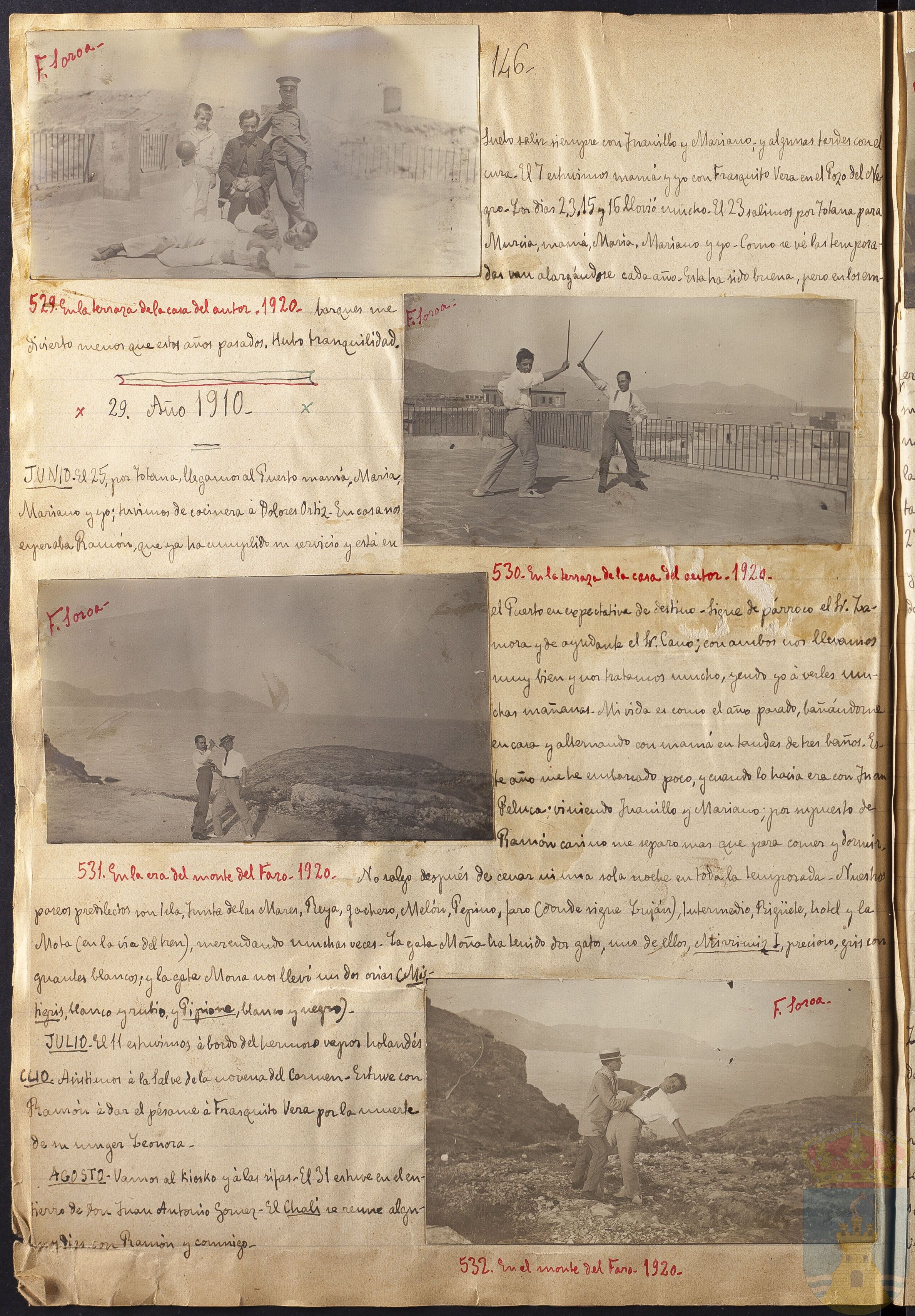 JUNIO. El 25, por Totana, llegamos al Puerto mamá, María, Mariano y yo; tuvimos de cocinera á Dolores Ortiz. En casa nos esperaba Ramón, que ya ha cumplido su servicio y está en el Puerto con expectativa de destino. Sigue de párroco el Sr. Zamora y de ayudante el Sr. Cano; con ambos nos llevamos muy bien y nos tratamos mucho, yendo yo a verles muchas mañanas. Mi vida es como el año pasado, bañándome en casa y alternando con mamá en tandas de tres baños. Este año me he embarcado poco, y cuando lo hacía era con Juan Peluca: viniendo Juanillo y Mariano; por supuesto de Ramón casi no me separo más que para comer y dormir. No salgo después de cenar ni una sola noche en toda la temporada. Nuestros paseos predilectos son Isla, Junta de las Mares, Reya, Gachero, Melón, Pepino, faro (donde sigue Luján), Intermedio, Rihuete, hotel y la Mota (con la vía del tren), merendando muchas veces. La gata Moña ha tenido dos gatos, uno de ellos, Mirrimiz , precioso, gris con tigris, blanco y rubio, y Pipione, blanco y negro.