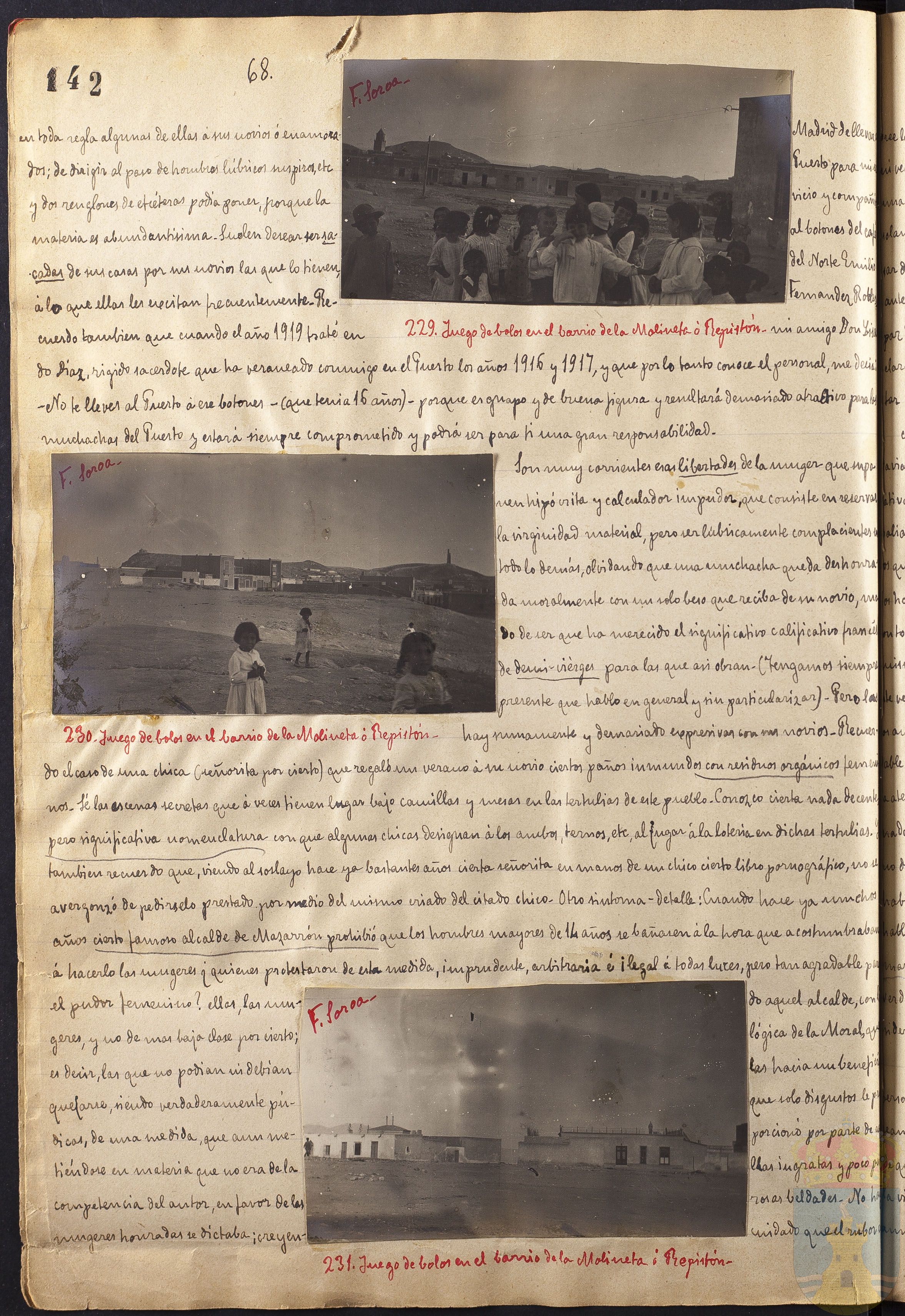 Papel con texto manuscrito a pluma tamaño 22 x31 cm y fotografías monocroma al gelatino-bromuro de plata en diferentes tamaños (indicados en el alcance).