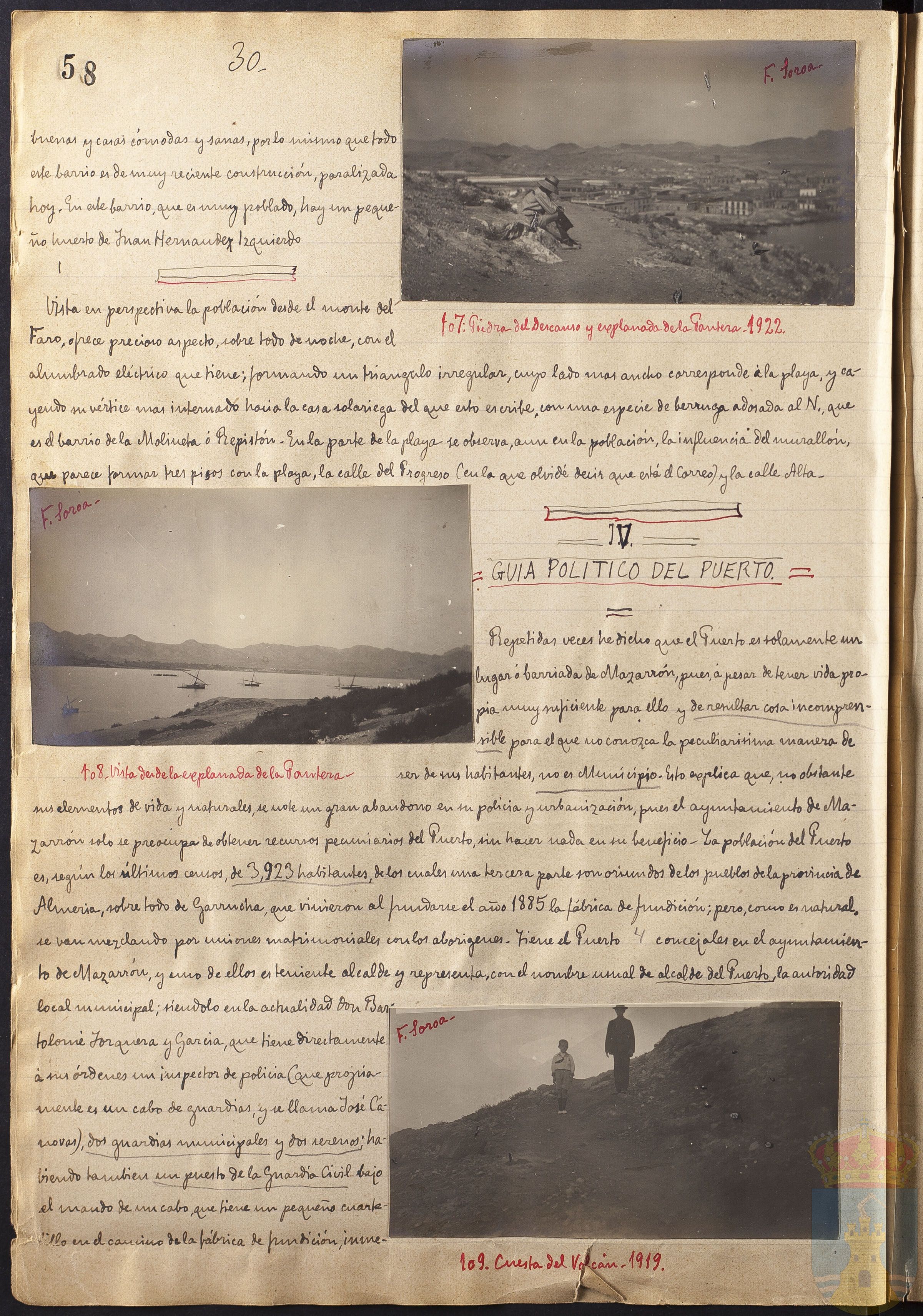 Repetidas veces he dicho que el Puerto es solamente un lugar ó barriada de Mazarrón, pues, á pesar de tener vida propia muy suficiente para ello y de resultar cosa incomprensible para el que no conozca la peculiarísima manera de ser de sus habitantes, no es Municipio. Esto explica que, no obstante sus elementos de vida y naturales, se note un gran abandono en su policía y urbanización, pues el ayuntamiento de Mazarrón solo se preocupa de obtener recursos pecuniarios del Puerto, sin hacer nada en su beneficio. La población del Puerto es, según los últimos censos, de 9.923 habitantes, de los cuales una tercera parte son oriundos de los pueblos de la provincia de almería, sobre todo de Garrucha, que vinieron al fundarse el año 1885 la fábrica de fundición; pero, como es natural, se van mezclando por uniones matrimoniales con los aborígenes. Tiee el Puerto 4 concejales en el Ayuntamiento de Mazarrón, y uno de ellos es teniente alcalde y representa, con el nombre usual de alcalde del Puerto, la autoridad local municipal; siéndolo en la actualidad Don Bartolomé Jorquera y García, que tiene directamente á sus órdenes un inspector de policía (que propiamente es un cabo de guardias, y se llama José Cánovas), dos guardias municipales y dos serenos; habiendo también un puesto de la Guardia Civil bajo el mando de mi cabo que tiene un pequeño cuartelillo en el camino de la fábrica de fundición, inme-