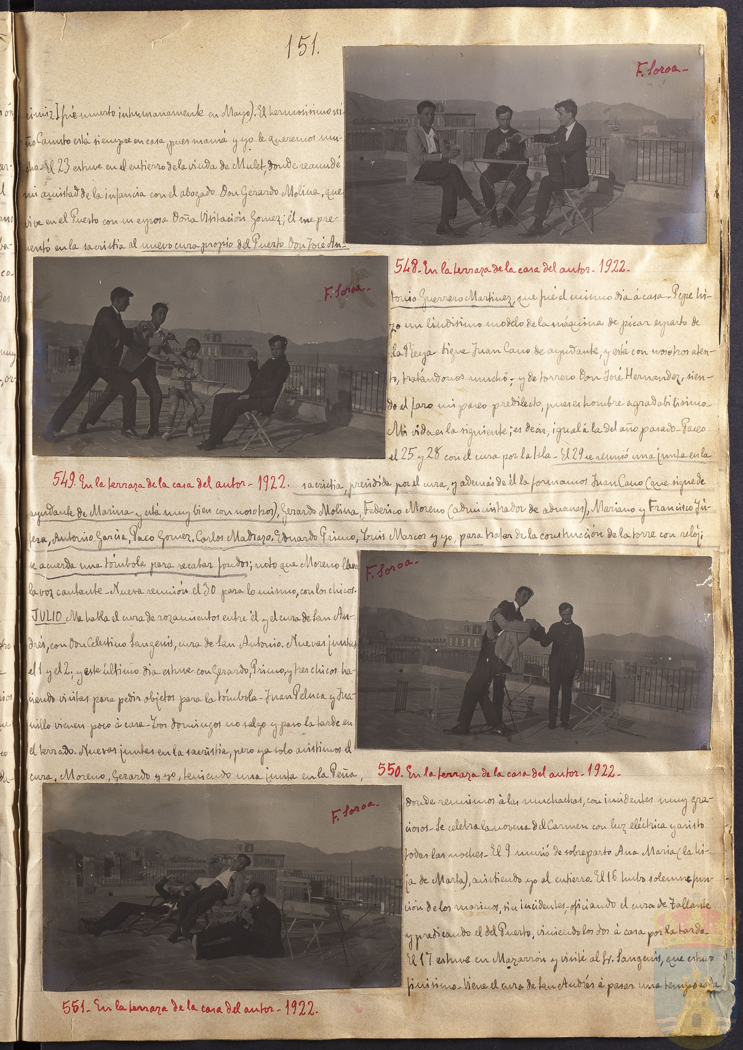 Fotografía 550: En la terraza de la casa del autor. 1922. Firmado a mano por F. Soroa. Tamaño: 6 x 10,6 cm.