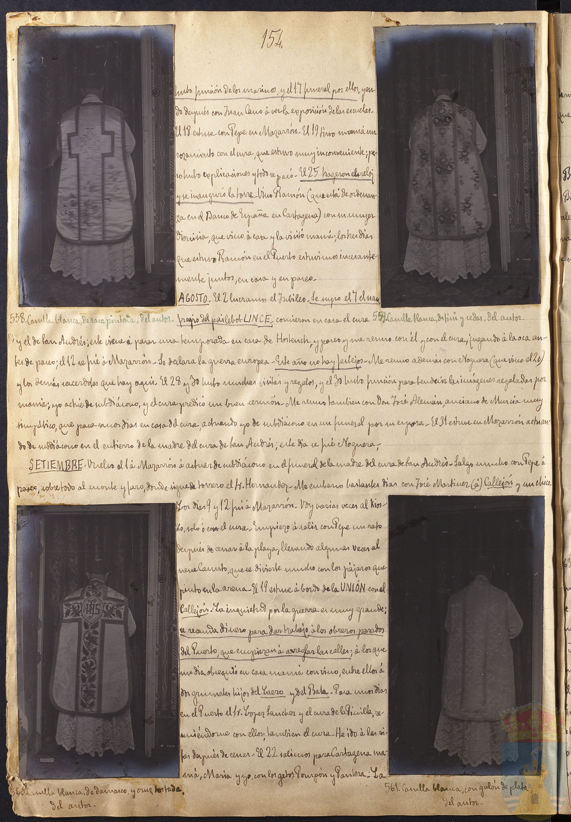 AGOSTO. El 2 lucramos el Jubileo. Se supo el 7 el naufrago del pailebot LINCE, comieron en casa el cura y el de San Andrés; este viene á pasar una temporada en casa de Hostench, y paseo, y me reúno con él y con el cura, jugando á la oca antes del paseo; el 12 se fue á Mazarrón. Se declara la guerra europea. Este año no hay festejos. Me reúno además con Noguera (que vino el 20) y los demás sacerdotes que hay aquí- El 28 y 30 hubo muchas visitas y regalos, y el 30 hubo función para bendecir las imágenes regaladas por mamá; yo actué de subdiácono y el cura predicó un buen sermón. Me reúno también con Don José alemán, anciano de Murcia muy simpático, que pasa unos días en casa el cura , actuando yo de subdiácono en un funeral por su esposa. El 31 estuve en Mazarrón actuando de subdiácono en el entierro de la madre del cura de San Andrés; este día se fue Noguera.
