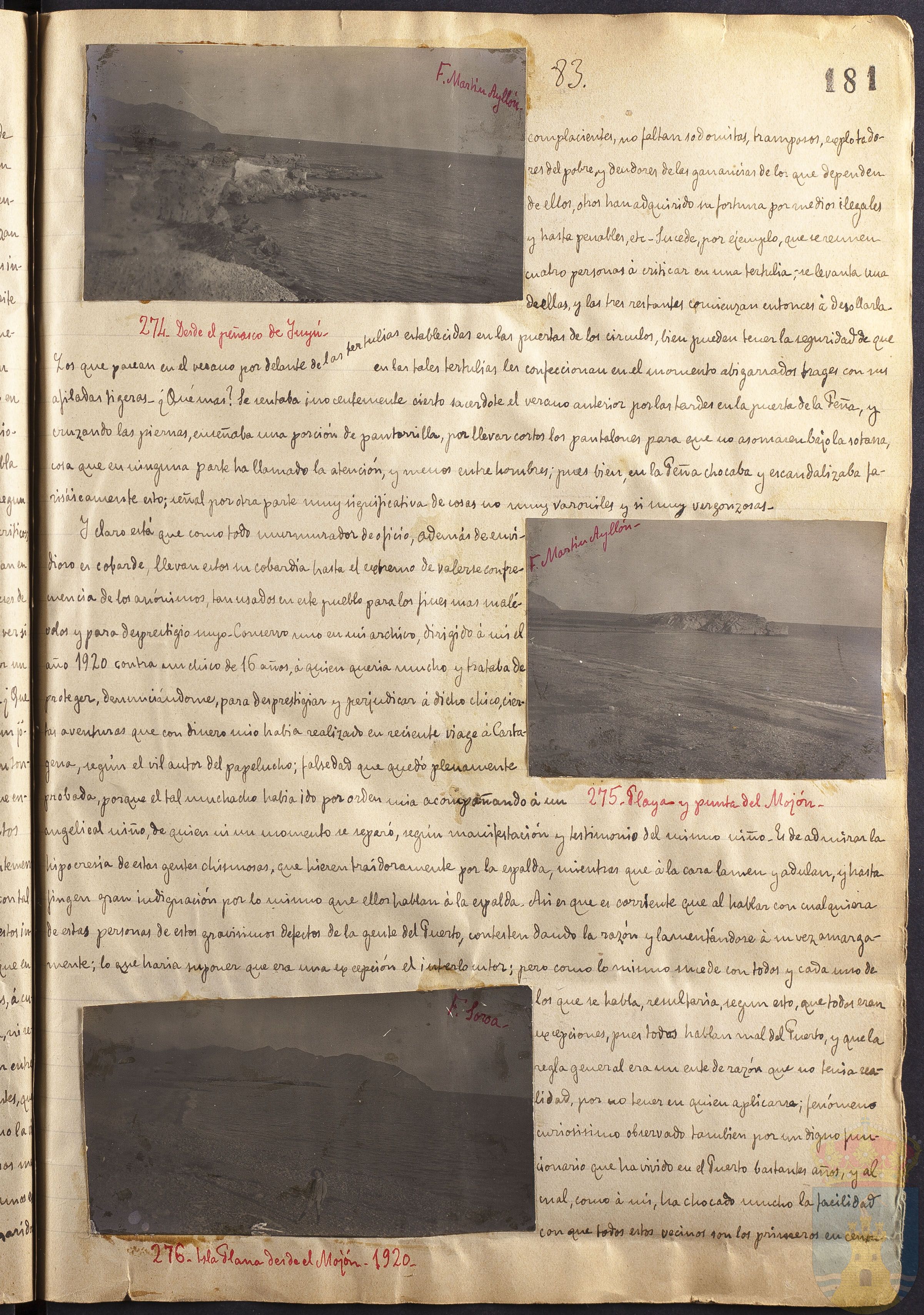 Y claro está que como todo murmurador de oficio, además de envidioso es cobarde, llevan estos su cobardía hasta el extremo de valerse con frecuencia de los anónimos, tan usados en este pueblo para los fines más malévolos y para desprestigio suyo. Conservo uno en mi archivo, dirigido a mí el año 1920 contra un chico de 16 años, á quien quería mucho y trataba de proteger, denunciándome para desprestigiar y perjudicar a dicho chico, ciertas aventuras que con dinero mío había realizado en reciente viaje a Cartagena, según el vil autor del papelucho; falsedad que quedó plenamente probada porque el tal muchacho había ido por orden mía acompañando á un angelical niño, de quien ni un momento se separó, según manifestación y testimonio del mismo niño. Es de admirar la hipocresía de estas gentes chismosas, que hieren traidoramente por la espalda, mientras que á la cara lamen y adulan, y hasta fingen gran indignación por lo mismo que ellos hablan á la espalda. así es que es corriente que al hablar con cualquiera de estas personas de estos gravísimos defectos de la gente del Puerto, contesten dando la razón y lamentándose á su vez amargadamente; lo que haría suponer que era una excepción el interlocutor; pero como lo mismo sucede con todos y cada uno de los que se habla, resultaría, según esto, que todos eran excepciones, pues todos hablan mal del Puerto y que la regla general era un ente de razón que no tenía realidad, por no tener ni quien aplicase?; fenómeno curiosísimo observado también por un digno funcionario que ha vivido en el Puerto bastantes años, y al mal, como á mí, ha chocado mucho la facilidad con que todos estos vecinos son los primeros en cen?...