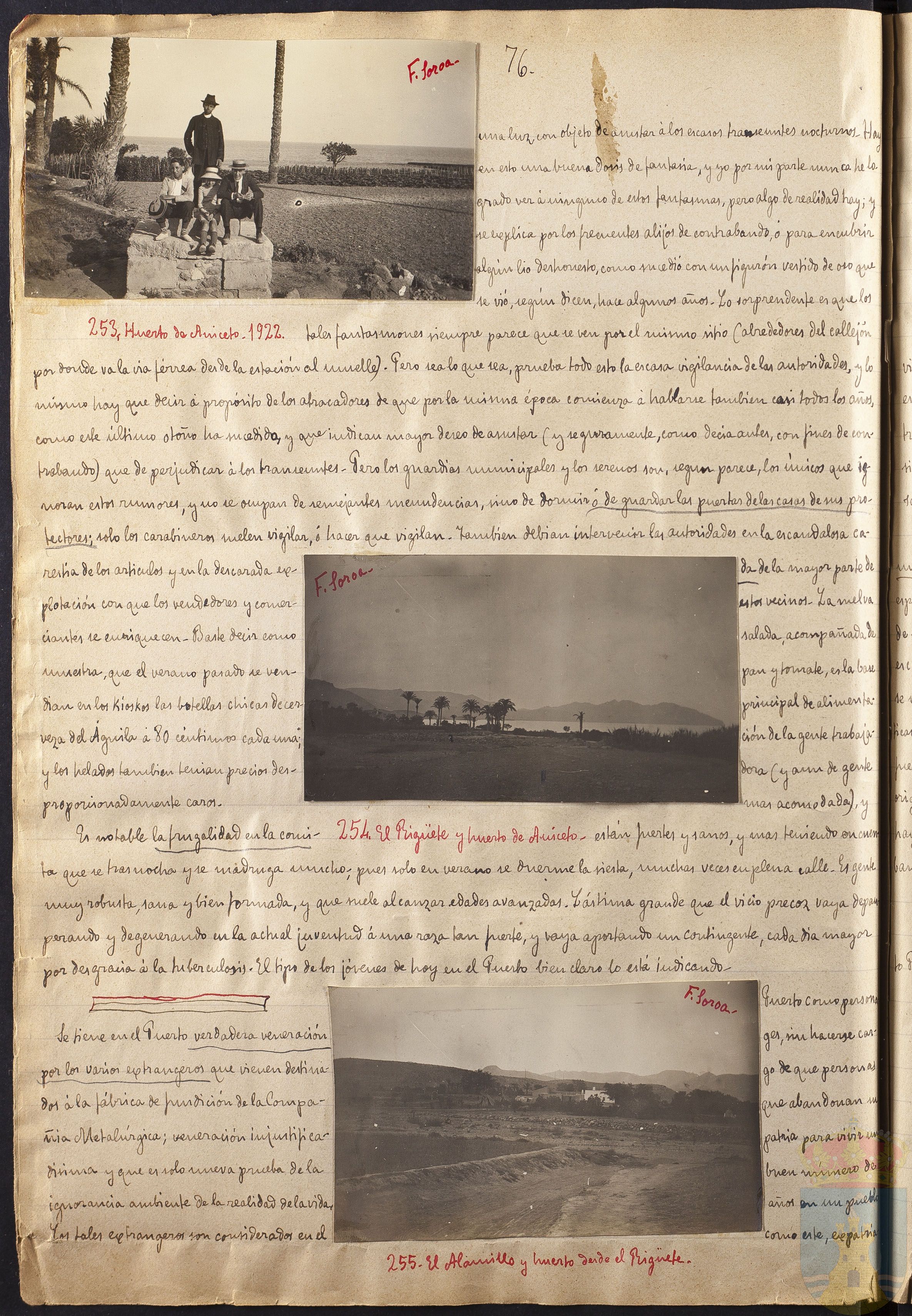 Es notable la frugalidad en la comida de la mayor parte de estos vecinos. La melva salada, acompañada de pan y tomate, es la base principal de alimentación de la gente trabajadora (y aun de gente más acomodada) y están fuertes y sanos, y mas teniendo en cuenta que se trasnocha y se madruga mucho, pues solo en verano se duerme la siesta, muchas veces en plena calle. Es gente muy robusta, sana y bien formada y que suele alcanzar edades avanzadas. Lástima grande que el vicio precoz vaya (...) t degenerando en la actual juventud á una raza tan fuerte, y vaya aportando un contingente, cada día mayor por desgracia á la tuberculosis. El tipo de los jóvenes de hoy en el Puerto bien claro lo está indicando.
