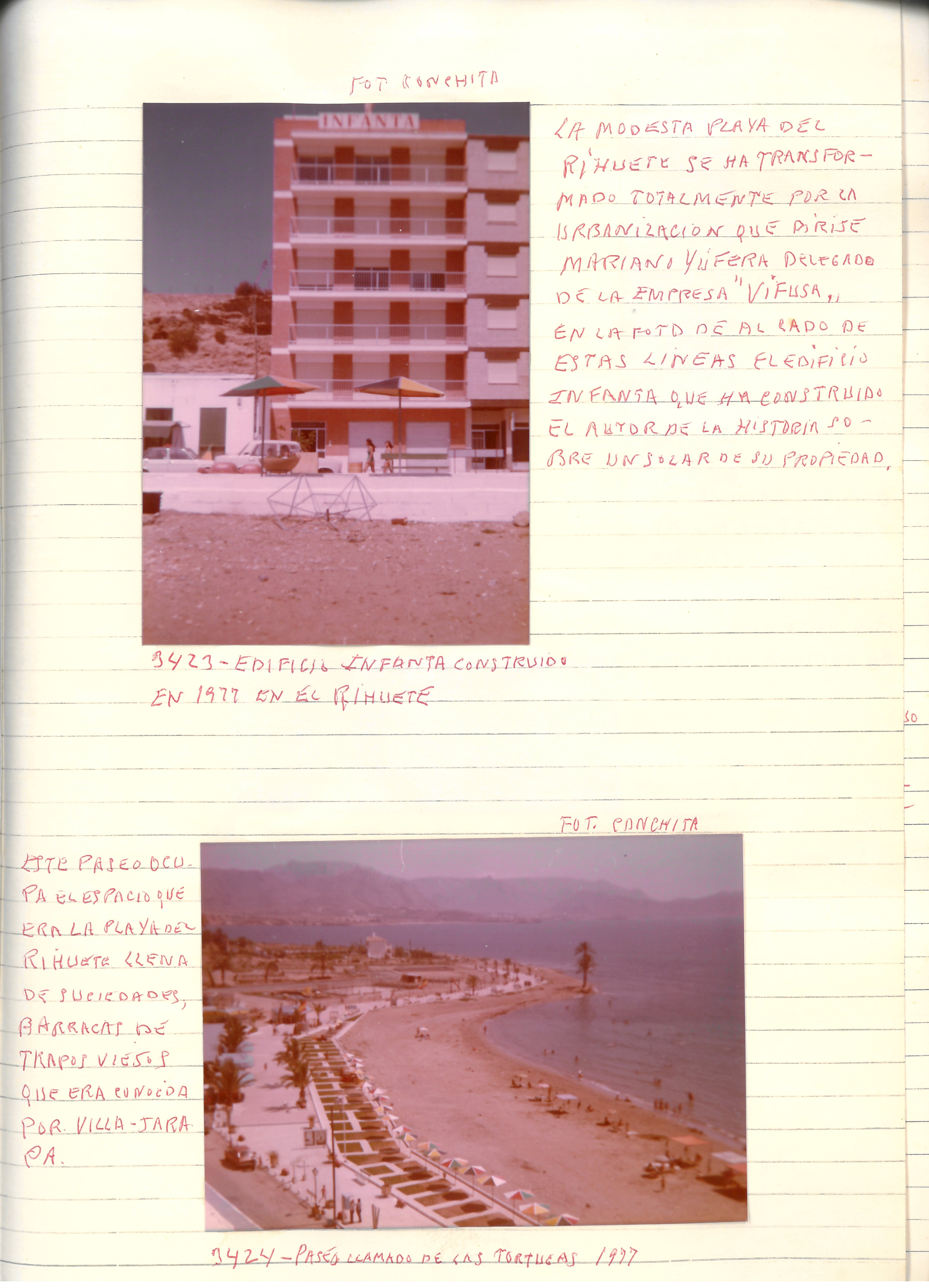 Comentario de la fotografía 3423: LA MODESTA PLAYA DEL RIHUETE SE HA TRANSFORMADO TOTALMENTE POR LA URBANIZACIÓN QUE DIRIJE (sic) MARIANO YÚFERA, DELEGADO DE LA EMPRESA "VIFUSA", EN LA FOTO DE AL LADO DE ESTAS LÍNEAS EL EDIFICIO INFANTA QUE HA CONSTRUIDO EL AUTOR DE LA HISTORIA SOBRE UN SOLAR DE SU PROPIETAD.