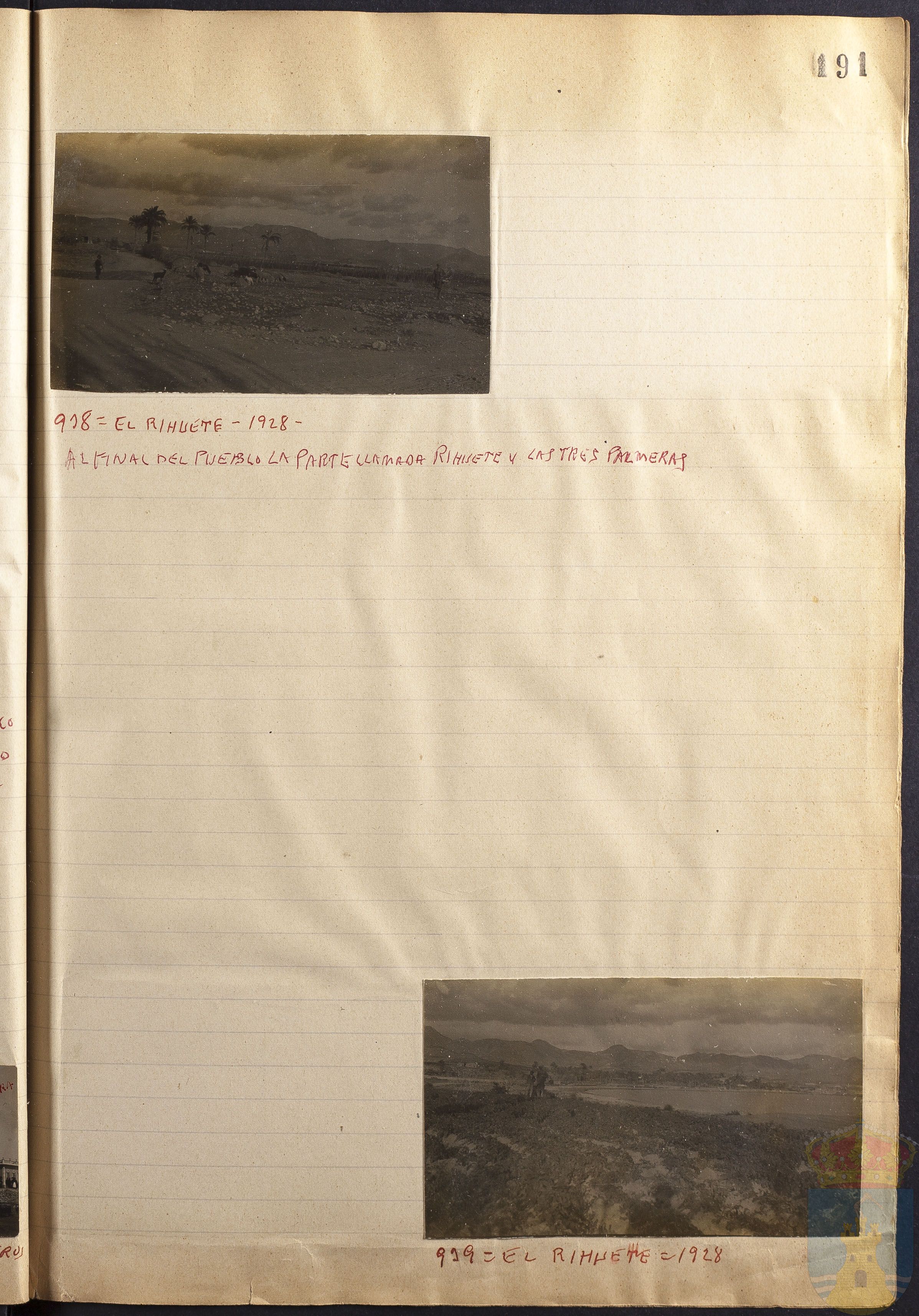 Fotografía 938: EL RIHUETE - 1928. Tamaño: 6,2 x 10,5 cm. Texto inferior: AL FINAL DEL PUEBLO LA PARTE LLAMADA RIHUETE Y LAS TRES PALMERAS.