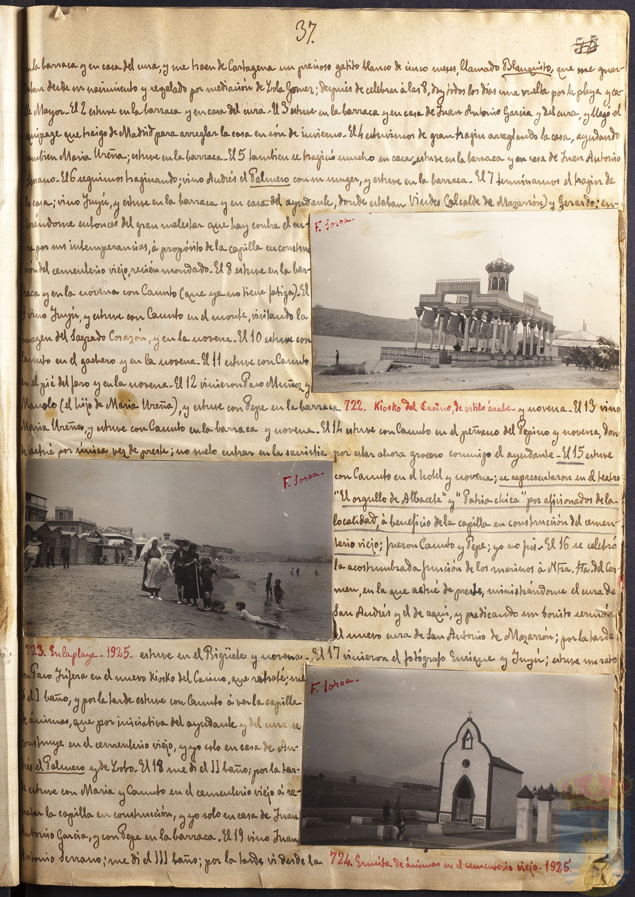 en la barraca y en casa del cura, y me traen de Cartagena un precioso gatito blanco de cinco meses, llamado lanquito, que me guardaban desde su nacimiento y regalado por mediación de Lola Gómez; después de celebrar á las 8, doy todos los días una vuelta por la playa y Calle Mayor. El 2 estuve en la barraca y en casa del cura. El 3 estuve en la barraca y en casa de Juan Antonio García y del cura, y llegó el equipage que traigo de Madrid para arreglar la casa en són de invierno. El 4 estuvimos de gran tragin arreglando la casa, ayudando también María Ureña; estuve en la barraca. El 5 también se traginó mucho en casa; estuve en la barraca y en casa de Juan Antonio Serrano. El 6 seguimos traginando; vino Andrés el Palmero con su muger, y estuve en la barraca. El 7 terminamos el tragín de la casa, vino Yuyú y estuve en la barraca y en casa del ayudante, donde estaban Viudes (alcalde de Mazarrón) y Gerardo; enterándome entonces del gran malestar que hay contra el cura por sus intemperancias, á propósito de la capilla en construcción del cementerio viejo, recién mandado. El 8 estuve en la barraca y en la novena con Canuto (que ya no tiene fatiga). El 9 vino Yuyú u estuve con Canuto en el monte, visitando la imagen del Sagrado Corazón, y en la novena. El 10 estuve con Canuto en el gachero y en la novena. El 11 estuve con Canuto en el pié del faro y en la novena. El 12 vinieron Paco Muñoz y Manolo (el hijo de María Ureña) y estuve con Pepe en la barraca y novena. El 13 vino María Ureña, y estuve con Canuto en la barraca y novena. El 14 estuve con Canuto en el peñasco del Pepino y novena, donde actué por única vez de preste; no suelo entrar en la sacristía por estar ahora grosero conmigo el ayudante. El 15 estuve con Canuto en el hotel y novena; se representaron en el teatro "El orgullo de Albacete" y "Patria chica" por aficionados de la localidad á beneficio de la capilla en construcción del cementerio viejo; fueron Canuto y Pepe, yo no fui. El 16 se celebró la acostumbrada función de los marinos á Ntra. Sra. del Carmen, en la que actué de preste, ministrándome el cura de San Andrés y el de aquí, y predicando un bonito sermón el nuevo cura de San Antonio de Mazarrón; por la tarde estuve en el Rigüete y novena. El 17 vinieron el fotógrafo Enrique y Yuyú; estuve un rato con Paco Yúfera en el nuevo kiosko del Casino, que retraté; me dí el I baño, y por la tarde estuve con Canuto á ver la capilla de ánimas, que por iniciativa del ayudante y del cura se construye en el cementerio viejo, y yo solo en casa de Andrés el Palmero y de Lobo. El 18 me di el II baño; por la tarde estuve con María y Canuto en el cementerio viejo á retratar la capilla en construcción, y yo solo en casa de Juan Antonio García, y con Pepe en la barraca. El 19 vino Juan Antonio Serrano; me di el III baño; por la tarde vi desde las...