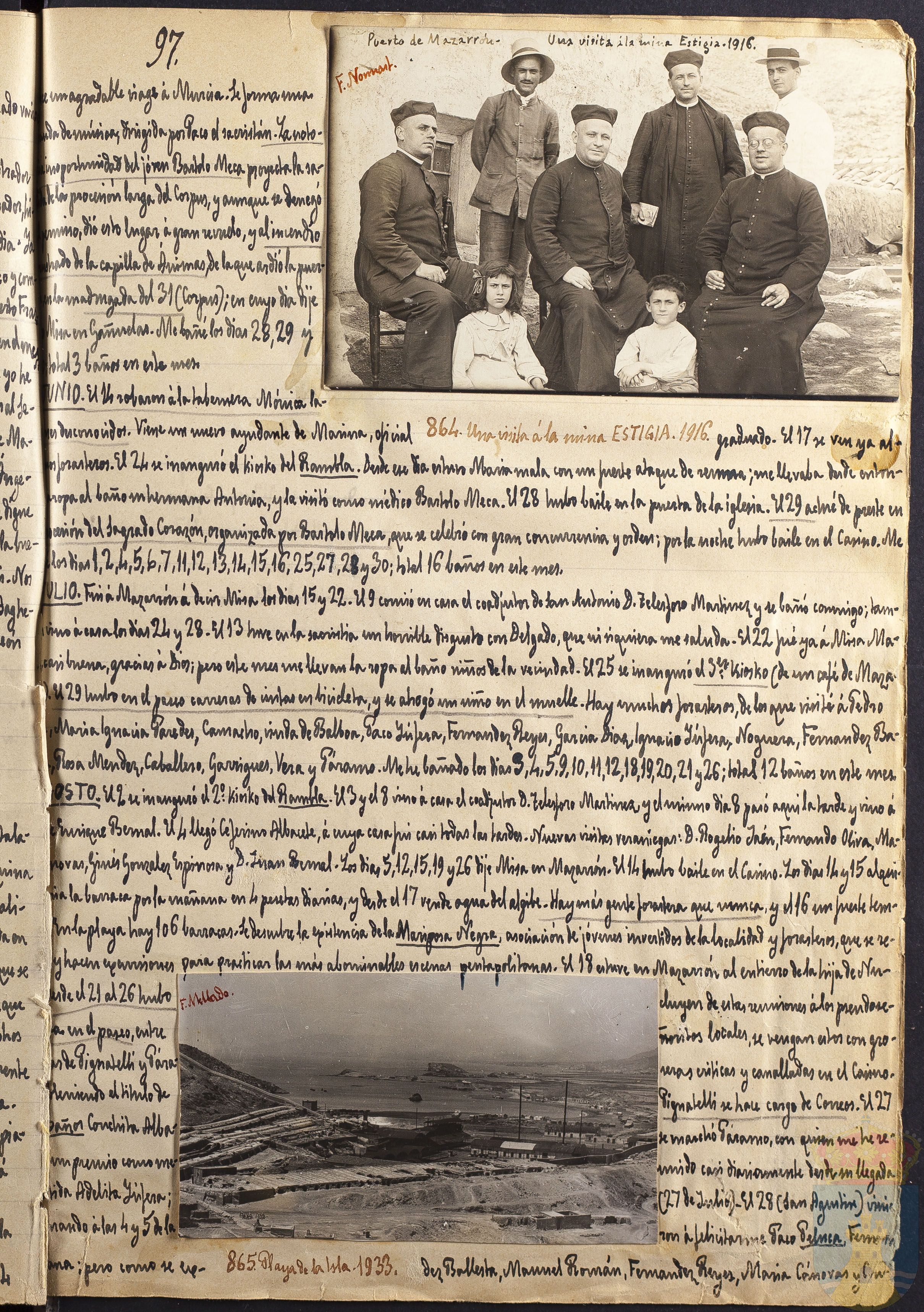 JULIO. Fuí á Mazarrón á decir Misa los días 15 y 22. El 9 comió en casa el coadjutor de San Antonio D. Telesforo Martínez y se bañó conmigo; también vino á casa los días 24 y 28. El 13 tuve en la sacristía con horrible disgusto de Delgado, que ni siquiera me saluda. El 22 fué ya á Misa María casi buena, gracias á Dios; pero este mes me llevan la ropa al baño niños de la vecindad. El 25 se inauguró el 3º kiosko (de un café de Mazarrón). El 29 hubo en el paseo carreras de cintas en bicicleta, y se ahogó un niño en el muelle. Hay muchos forasteros, de los que visité á Pedro Roth, María Ignacia Paredes, Camacho, viuda de Balboa, Paco Yúfera, Fernández Reyes, García Díaz y el mismo día 8 pasó aquí la tarde y vino á verme Enrique Bernal. El 4 llegó Ceferino Albacete, á cuya casa fui casi todas las tardes. Nuevas visitas veraniegas: D. Rogelio Jaén, Fernando Oliva, María Cánovas,Ginés González Espinosa y D. Juan Bernal. Los días 5, 12, 15, 19 y 26 dije Misa en Mazarrón. El 14 hubo baile en el Casino. Los días 14 y 15 alquiló María la barraca por la mañana en 4 pesetas diarias, y desde el 17 vende agua del algibe. Hay más gente forastera que nunca, y el 16 un fuerte temporal. En la playa hay 106 barracas. Se descubre la existencia de la Mariposa Negra, asociación de jóvenes invertidos de la localidad y forasteros, que se reúnen y hacen excursiones para practicar las más abominables escenas pentapolitanas?. El 18 estuve en Mazarrón al entierro de la hija de Núñez. Desde el 21 al 26 hubo verbena en el paseo, entre las casas de Pignatelli y Páramo, obtenendo el título de miss Baños Conchita Albacete, y un premio como mejor vestida Adelita Yúfera; terminando á las 4 y 5 de la mañana; pero como se excluyen de estas reuniones á los pseudoseñoritos locales, se vengan estos con groseras críticas y canalladas en el Casino. Pignatelli se hace cargo de Correos. El 27 se marchó Páramo, con quien me he reunido casi diariamente desde su llegada (27 de Julio). El 28 (San Agustín) vinieron á felicitarme Paco Peluca, Fernández Ballesta, Manuel Román, Fernández Reyes, María Cánovas y Cu...