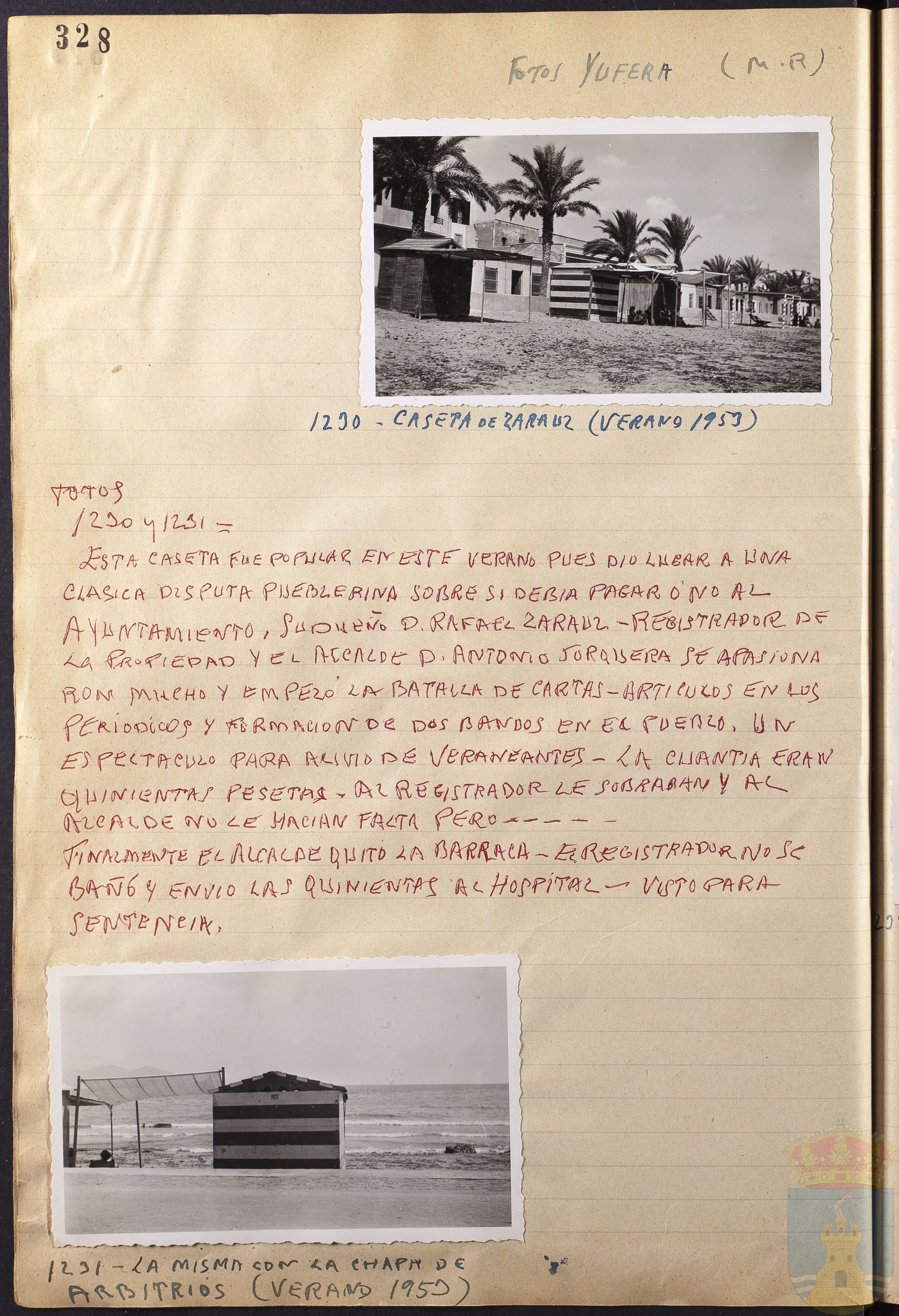 Comentario de las fotografías 1230 y 1231: ESTA CASETA FUE POPULAR EN ESTE VERANO PUES DIO LUGAR A UNA CLÁSICA DISPUTA PUEBLERINA SOBRE SI DEBÍA PAGAR O NO AL AYUNTAMIENTO, SU DUEÑO D. RAFAEL ZARAUZ - REGISTRADOR DE LA PROPIEDAD Y EL ALCALDE D. ANTONIO JORQUERA SE APASIONARON MUCHO Y EMPEZÓ LA BATALLA DE CARTAS-ARTÍCULOS EN LOS PERIÓDICOS PARA ALIVIO DE VERANEANTES. LA CUANTÍIA ERAN QUINIENTAS PESETAS. AL REGISTRADOR LE SOBRABAN Y AL ALCALDE NO LE HACÍAN FALTA PERO-----