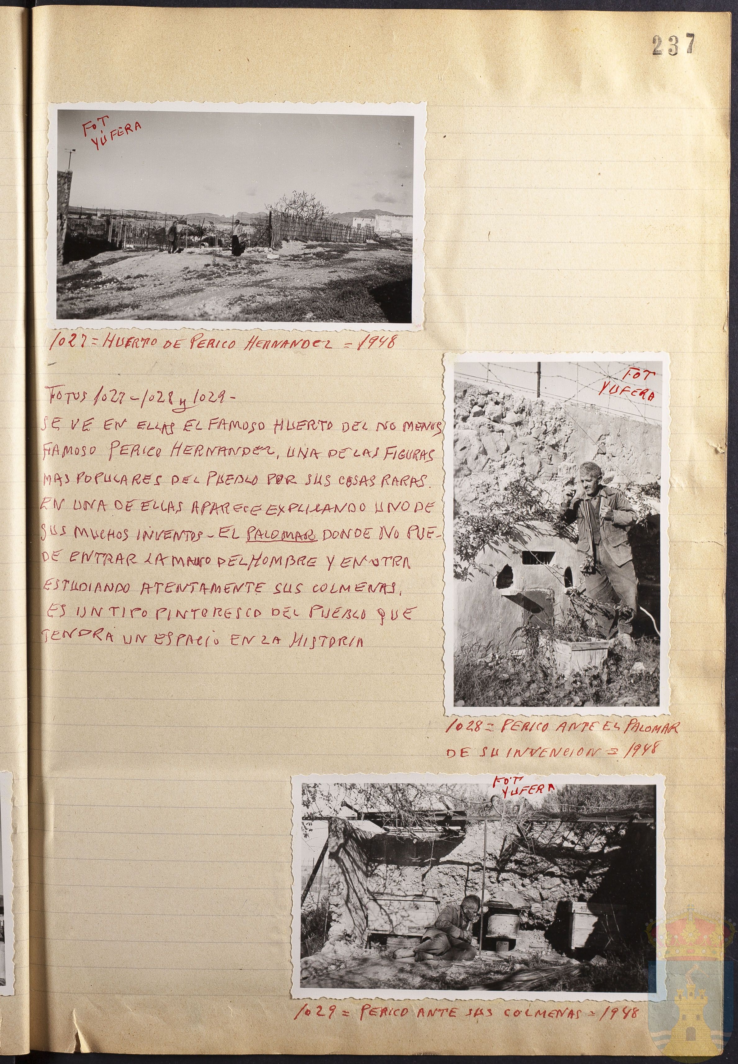 Comentario de las fotografías 1027, 1028 y 1029: SE VE EN ELLAS EL FAMOSO HUERTO DEL NO MENOS FAMOSO PERICO HERNÁNDEZ, UNA DE LAS FIGURAS MÁS POPULARES DEL PUEBLO POR SUS COSAS RARAS. EN UNA DE ELLAS APARECE EXPLICANDO UNO DE SUS MUCHOS INVENTOS. EL PALOMAR DONDE NO PUEDE ENTRAR LA MANO DEL HOMBRE Y EN OTRA ESTUDIANDO ATENTAMENTE SUS COLMENAS, ES UN TIPO PINTORESCTO DEL PUEBLO QUE TENDRÁ UN ESPACIO EN LA HISTORIA.