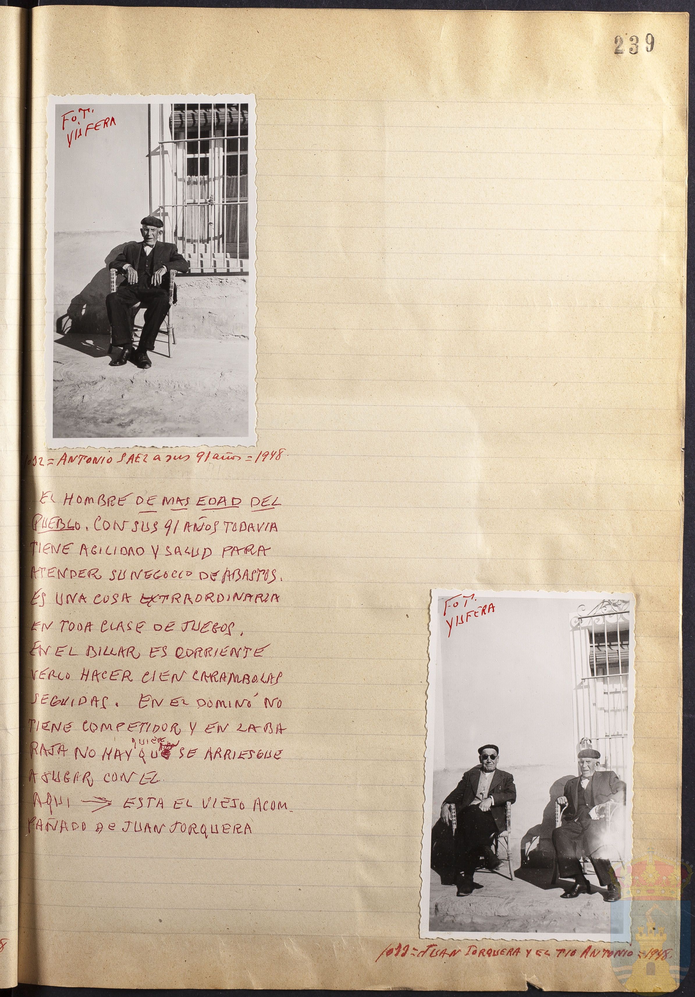 Comentario de las fotografías 1032 y 1033: EL HOMBRE DE MÁS EDAD DEL PUEBLO. CON SUS 91 AÑOS TODAVÍA TIENE AGILDIAD Y SALUD PARA ATENDER SU NEGOCIO DE ABASTOS. ES UNA COSA EXTRAORDINARIA EN TODA CLASE DE JUEGOS. EN EL BILLAR ES CORRIENTE VERLO HACER CIEN CARAMBALAS SEGUIDAS. EN EL DOMINÓ NO TIENE COMPETIDOS, Y EN LA BARAJA NO HAY QUIEN SE ARRIESGUE A JUGAR CON ÉL.