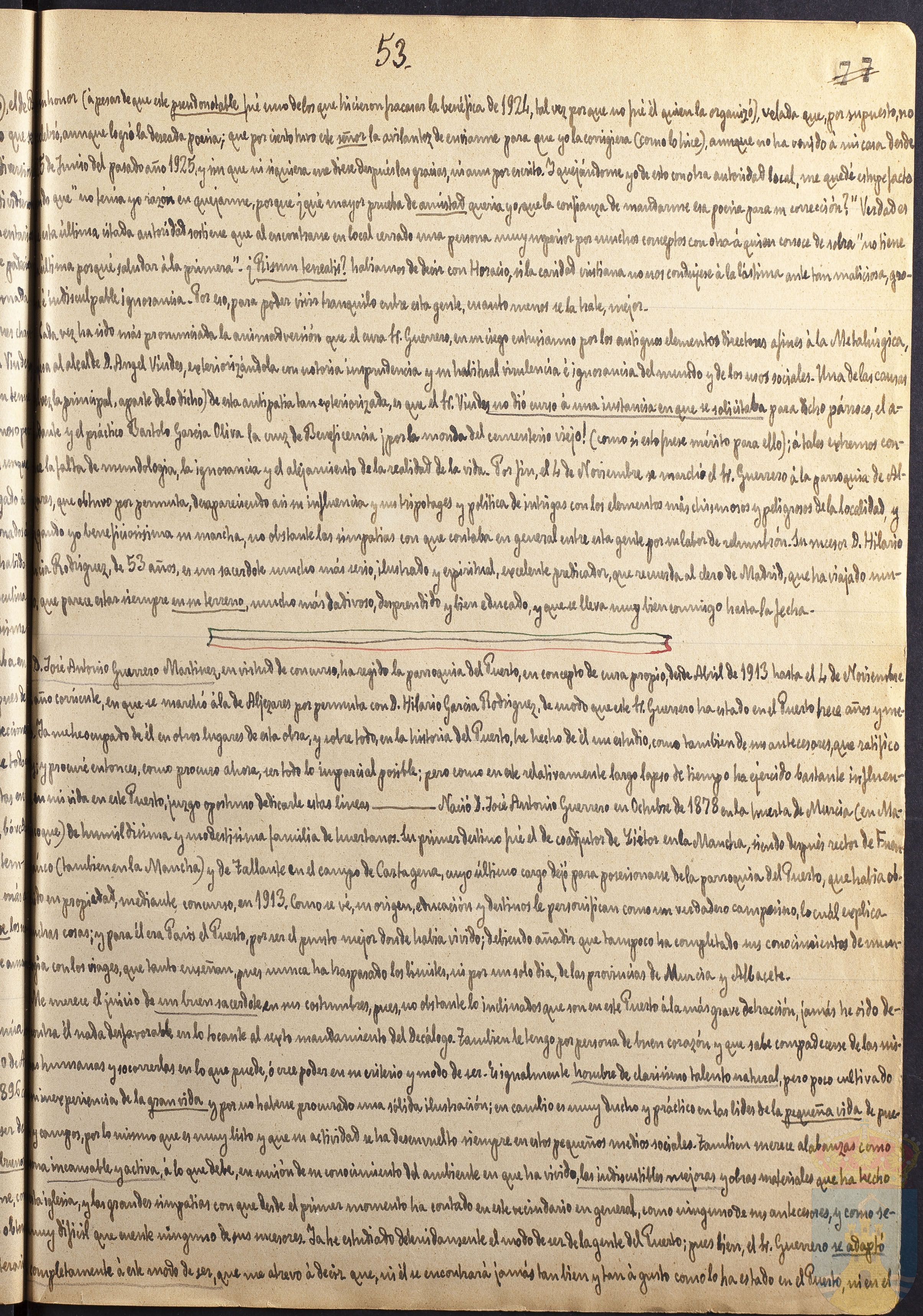 Me merece el juicio de buen sacerdote, en sus costumbres, pues, no obstante los inclinados que son en este Puerto á la más grave detracción, jamás he sido de... contra él nada desfavorable en lo tocante al sexto mandamiento del Decálogo. También le tengo por persona de buen corazón y que sabe compadecerse de las mis? humanas y socorrerlas en lo que puede, ó... poder en su criterio y modo de ser. Es igualmente hombre de clarísimo talento natural, pero poco cultivado y con inexperiencia de la gran vida y por no haberse procurado una sólida ilustración; en cambio es muy ducho y práctico en las lides de la pequeña vida de pueblo y amigos, por lo mismo que es muy listo y que su actividad se ha desenvuelto siempre en estos pequeños medios sociales. También merece alabanzas como... incansable y activa, á lo que debe, en misión de su conocimiento del ambiente en que ha vivido, las indiscutibles mejores y obras materiales que ha hecho... iglesia, y las grandes simpatías con que desde el primer momento ha contado en este vecindario en general, como ninguno de sus antecesores, y como... muy difícil que cuente ninguno de sus sucesores. Ya he estudiado detenidamente el modo de ser de la gente del Puerto; pues bien, el Sr. Guerrero se adaptó completamente á este modo de ser, que me atrevo á decir que, ni él se encontrará jamás tan bien y tan á gusto como lo ha estado en el Puerto, ni en el...