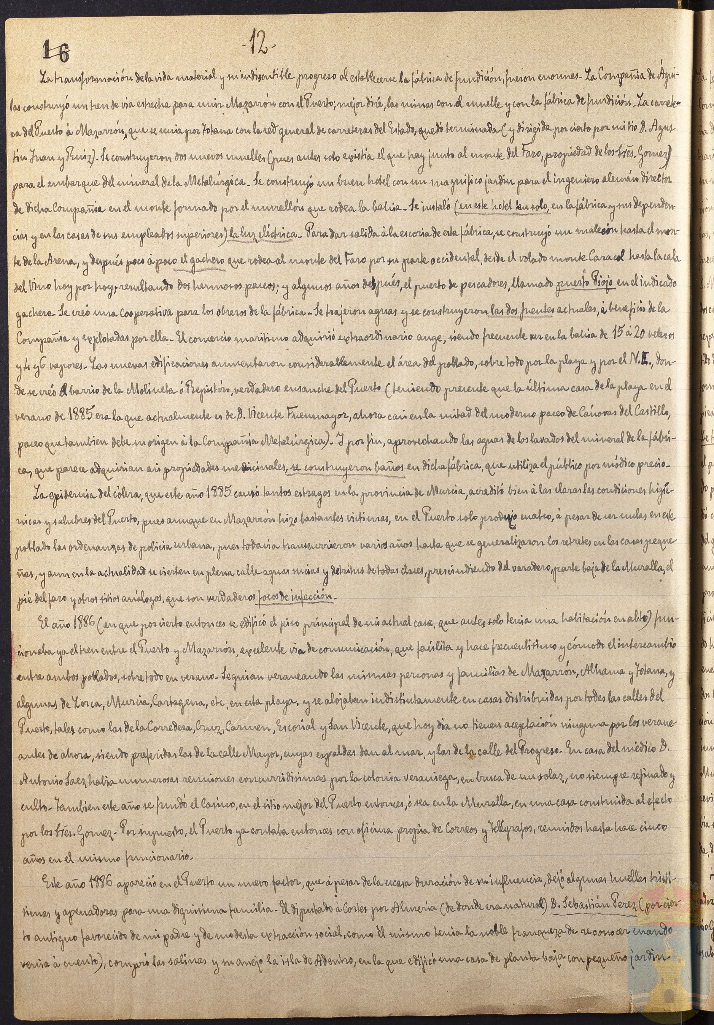 La transformación de la vida material y su indiscutible progreso al establecerse la fábrica de fundición fueron enormes. La Compañía de Águilas construyó un tren de vía estrecha para unir Mazarrón con el Puerto, mejor diré las minas con el muelle y con la fábrica de fundición. La carretera del Puerto á Mazarrón, que se unía por Totana con la red general de carreteras del Estado, quedó terminada (y dirigida por mi tío D. Agustín Juan y Ruíz). Se construyeron dos nuevos muelles (pues antes solo existía el que hay junto al monte del Faro, propiedad de los Sres. Gómez) para el embarque del mineral de la Metalúrgica. Se construyó un buen hotel con un magnífico jardín para el ingeniero alemán director de dicha Compañía en el monte formado por el murallón que rodea la bahía. Se instaló (en este hotel tan solo, en la fábrica y sus dependencias y en las casas de sus empleados superiores) la luz eléctrica. Para dar salida á la escoria de esta fábrica, se construyó un malecón hasta el monte de la Arena, y después poco á poco el gachero que rodea al monte del Faro por su parte occidental, desde el volado monte Caracol hasta la cala del Vino hoy poy hoy, resultando dos hermosos paseos; y algunos años después, el puerto de pescadores, llamado Puerto Piojo en el indicado gachero. Se creó una Cooperativa para los obreros de la fábrica. Se trajeron aguas y se construyeron las dos fuentes actuales, á beneficio de la Compañía y explotadas por ella. El comercio marítimo adquirió extraordinario auge, siendo frecuente ver en la bahía de 15 á 20 veleros y 4 y 6 vapores. Las nuevas edificaciones aumentaron considerablemente el área del poblado, sobre todo por la playa y por el N.E., donde se creó el barrio de la Molineta ó Repistón, verdadero ensanche del Puerto (teniendo presente que la última casa de la playa en el verano de 1885 era la que actualmente es de D. Vicente Fuenmayor, ahora casi en la mitad del moderno paseo de Cánovas del Castillo, paseo que también debe su origen á la Compañía Metalúrgica). Y por fin, aprovechando las aguas de los lavados del mineral de la fábrica que parece adquirían así propiedades medicinales, se construyeron baños en dicha fábrica, que utiliza el público por módico precio.