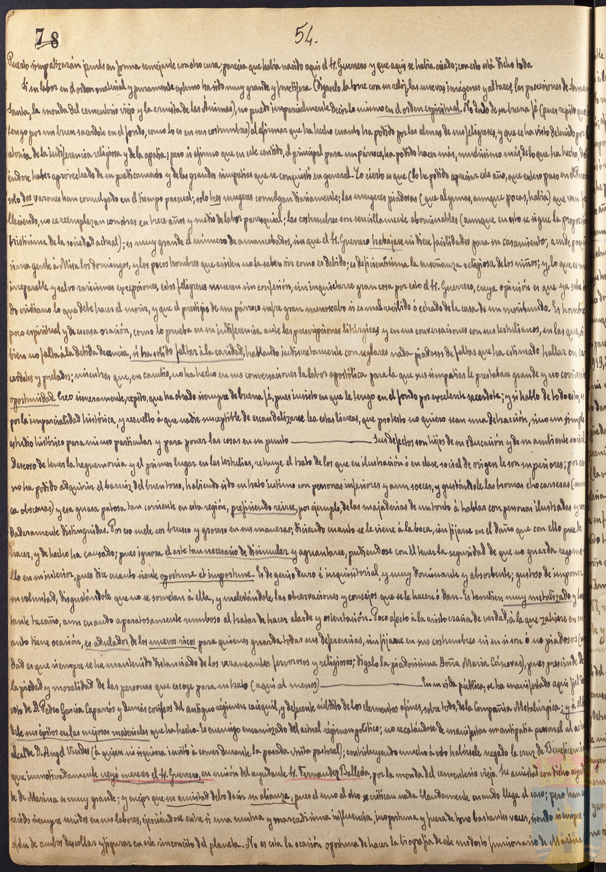 Si su labor en el orden material y puramente externo ha sido muy grande y fructífera (...la torre con su reloj, las nuevas imágenes y altares, las procesiones de Semana Santa, la monda del cementerio viejo y la ermita de las Ánimas), no puedo imparcialmente decir lo mismo en el orden espiritual. No dado de su buena fé (pues repito que tengo por un buen sacerdote en el fondo, como lo es en sus costumbres)al afirmar que ha hecho cuanto ha podido por las almas de sus feligreses, y que se ha visto detenido por... de la indiferencia religiosa y de la apatía; pero sí afirmo que en este sentido, el principal para un párroco, ha podido hacer más, muchísimo más, de lo que ha hecho ...haber aprovechado de su predicamento y de las grandes simpatías que se conquistó en general. Lo cierto es que (lo he podido apreciar este año, que entero paso en el Puerto), solo dos varones han comulgado en el tiempo pascual; solo tres mugeres comulgan diariamente; las mayores piadosas (que algunas, aunque pocas, había) que van falleciendo, no se reemplazan con otras en trece años y medio de labor parroquial; las costumbres son sencillamente abominables (aunque en esto se sigue la proporción tristísima de la sociedad actual); es muy grande el número de amancebados, sin que el Sr. Guerrero trabajase ni diese facilidades para el casamiento, acude poquísima gente á Misa los Domingos; y los pocos hombres que asisten no la saben oír como es debido; es deficientísima la enseñanza religiosa de los niños; y, lo que es irreparable y salvo rarísimas excepciones, estos feligreses mueren sin confesión, sin inquietarse gran cosa por esto el Sr. Guerrero, cuya opinión es que ya solo... cristiano lo que debe hacer al morir, y que el prestigio de un párroco sufre gran menoscabo si es mal recibido ó echado de la casa de un moribundo. Es hombre de bien no falta á la debida decencia, sí ha solido faltar á la caridad, hablando indiscretamente con reglares nada piadosos de faltas que ha estimado hallar en sacerdotes y prelados; mientras que, en cambio, no ha hecho en sus conversaciones la labor apostólica para la que sus simpatías le prestaban grande y no... oportunidad. Creo sinceramente, repito, que ha obrado siempre de buena fé, pues insisto en que le tengo en el fondo por excelente sacerdote; y si hablo de todo esto, es por la imparcialidad histórica, y resuelto á que nadie susceptible de escandalizarse lea estas líneas, que protesto no quiero sean una detracción, sino un simple estudio histórico para mismo particular y para poner las cosas en su punto. sus defectos son hijos de su educación y de su ambiente social. Deseoso de tener la hegemonía y el primer lugar en las tertulias, rehúye el trato de los que en ilustración ó en clase social de origen le son superiores; por eso no ha podido adquirir el barniz? del buen tono, habiendo sudo su trato íntimo con personas inferiores y aun soeces, y gustándole las bromas chocarreras(...obscenas) y esa guasa patosa tan corriente en esta región, prefiriendo reírse, por ejemplo, de las majaderías de un tonto á hablar con personas ilustradas y verdaderamente distinguidas. Por eso suele ser brusco y grosero en sus maneras; diciendo cuanto se le viene á la boca, sin fijarse en el daño que con ello puede hacer, y de hecho ha causado; pues ignora el arte tan necesario de disimular y aguantarse, pudiéndose con él tener la seguridad de que no guarda regomello en su interior, pues dice cuanto siente opportune et importune. Es de genio duro é inquisitorial, y muy dominante y absorbente; gustoso de imponer su voluntad, disgustándole que no se sometan á ella, y molestándole las observaciones y consejos que se le hacen ó dan. Es también muy metalizado? y bastante tacaño, aun cuando aparatosamente rumboso al tratar de hacer alarde y ostentación. Poco afecto á la aristocracia de verdad, á la que ... en cuanto tiene ocasión, es adulador de los nuevos ricos para quienes guarda todas deferencias, sin fijarse en sus costumbres ni en si son ó no piadosos (verdad es que siempre se ha mantenido distanciado de los veraneantes fervorosos y religiosos; dígalo la piadosísima Doña María Cánovas) pues prescinde de la piedad y moralidad de las personas que escoge para un trato (aquí al menos). En su vida pública, se ha manifestado aquí fiel devoto de D. Pedro García Caparrós y demás corifeos del antiguo régimen caciquil, y deferente súbdito de los elementos afines, sobre todo, de la Compañía Metalúrgica; y á ellos debe sus éxitos en las mejoras materiales que ha hecho. Es enemigo encarnizado del actual régimen político; no recatándose de manifestar su antipatía personal al actual alcalde D. Ángel Vindes (á quien ni siquiera invitó á comer durante la pasada visita pastoral); contribuyendo mucho á esto habérsele negado la cruz de Beneficencia que inmotivadamente creyó merecer el Sr. Guerrero, en misión del ayudante Sr. Fernández Ballesta, por la monda del cementerio viejo. Su amistad con dicho ayudante de Marina es muy grande, y mejor que su amistad debo decir su alianza, pues el uno al otro se critican nada blandamente cuando llega el caso; pero ... siempre unidos en sus labores, ejerciéndose entre sí una mutua y marcadísima influencia, inoportuna y fuera de tono bastantes veces, siendo siempre... de ambos... y figurar en este rinconcito del planeta. No es esta la ocasión oportuna de hacer la biografía de este modesto funcionario de Marina...