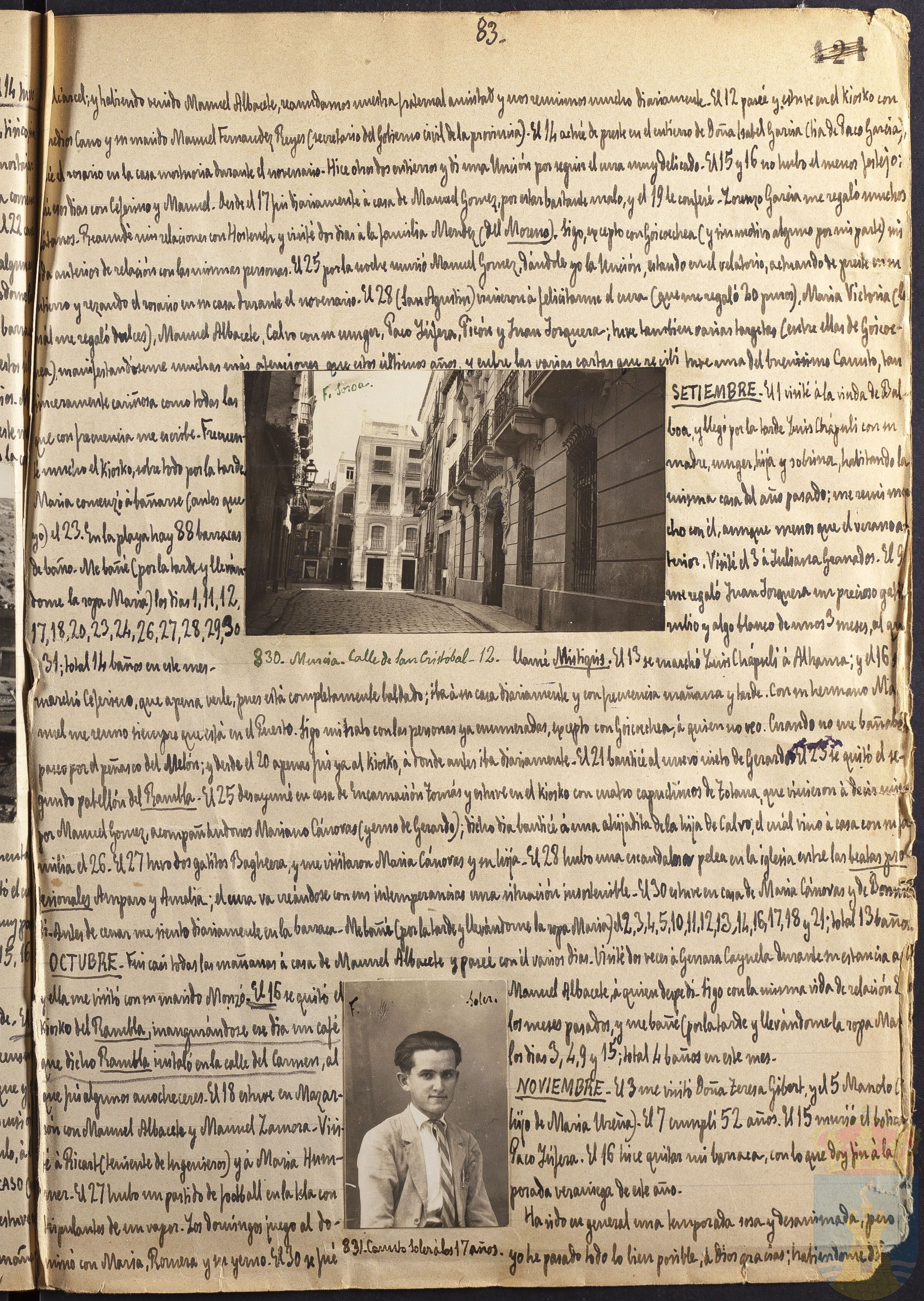 Valcárcel; y habiendo venido Manuel Albacete, recaudamos nuestra fraternal amistad y nos reunimos mucho diariamente. El 12 paseé y estuve en el kiosko con Remedios Cano y su marido Manuel Fernández Reyes (secretaría del Gobierno civil de la provincia). El 14 actué de preste en el entierro de Doña Isabel García (tía de Paco García) y recé el rosario en la casa mortuoria durante el novenario. Hice otros dos entierros y di una Unción por seguir el cura muy delicado. El 15 y 16 no hubo el menor festejo; paseé unos días con Ceferino y Manuel. Desde el 17 fui diariamente á casa de Manuel Gómez, por estar bastante malo, y el 19 le confesé. Lorenzo García me regaló muchos plátanos. Reanudé mis relaciones con Hostench y visité dos días á la familia Méndez (del Moreno). Sigo, excepto con Goicoechea (y sin motivo alguno por mi parte) mi vida anterior de relación con las mismas personas. El 25 por la noche murió Manuel Gómez, dándole yo la Unción, estando en el velatorio, actuando de preste en su entierro y rezando el rosario en su casa durante el novenario. El 28 (San Agustín) vinieron á felicitarme el cura (que me regaló 20 puros), María Victoria (la cual me regaló dulces), Manuel Albacete, Calvo con su muger, Paco Yúfera, Picón y Juan Jorquera; tuve también varias targetas (entre ellas de Goicoechea) manifestándome muchas más atenciones que en estos últimos años, y entre las varias cartas que recibí tuve una del buenísimo Canuto, tan sinceramente cariñosa como todas las que con frecuencia me escribe. Frecuento mucho el kisoko, sobre todo por la tarde. María comenzó á bañarse (antes que yo) el 23. En la playa hay 88 barracas de baño. Me bañé (por la tarde y llevándome la ropa María) los días 1, 11, 12, 17, 18, 20, 23, 24, 26, 27, 28, 29, 30 y 31; total 14 baños en este mes.