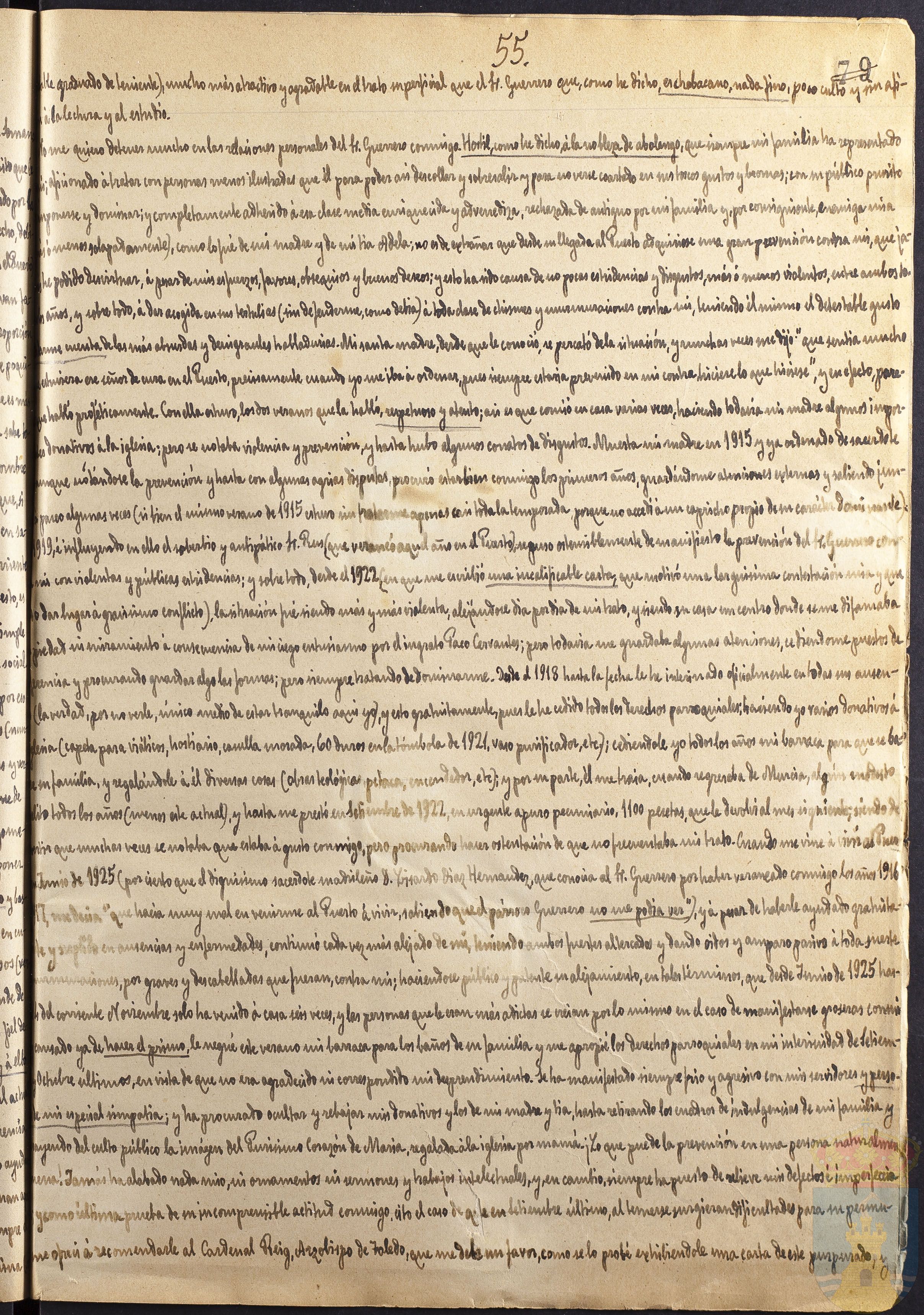 No me quiero detener mucho en las relaciones personales del Sr. Guerrero conmigo hostil, como he dicho, á la nobleza de abolengo, que siempre mi familia ha representado... aficionado á tratar con personas menos ilustradas que él para pdoer así descollar? y sobresalir y para no verse coartado en sus trucos?, gustos y bromas; con su público ... y dominar; y completamente adherido á esa clase media enriquecida y advenediza, rechazada de antiguo por mi familia y, por consiguiente, enemiga mía (más ó menos solapadamente), como lo fué de mi madre y de mi tía Adela; no es de extrañar que desde su llegada al Puerto adquiriese una gran prevencón contra mí, que... he podido desvirtuar, á pesar de mis esfuerzos, favores, obsequios y buenos deseos; y esto ha sido causa de no pocas estridencias y disgustos, más o menos violentos, entre ambos... años,, y sobre todo, á dar acogida a tertulias (sin defenderse, como decía) á toda clase de chismes y murmuraciones contra mí, teniendo él mismo el detestable gusto...cuenta de las más absurdas y denigradas habladurías. Mi santa madre, desde que le conoció, se percató de la situación, y muchas veces me dijo "que sentía mucho que estuviera ese señor de cura en el Puerto, precisamente cuando yo me iba á ordenar, pues siempre estaría prevenido en mi contra hiciese lo que hiciese" y en efecto, parece que habló proféticamente. Con ella estuvo los dos veranos que la habló, respetuoso y atento; así es que comió en casa varias veces, haciendo todavía mi madre algunos inoportunos donativos á la iglesia; pero se notaba violencia y prevención, y hasta hubo algunos conatos de disgustos. Muerta mi madre en 1915 y ya ordenado de sacerdote, aunque notándose la prevención y hasta con algunas agrias disputas, procuró estar bien conmigo los primeros años, guardándome atenciones externas y saliendo juntos de paseo algunas veces (si bien el mismo verano de 1915 sin tratarme apenas casi toda la temporada, porque no accedí a un capricho propio de su carácter dominante). En 1919 é influyendo en ello el sobervio y antipático Sr. Rus (que veraneó aquel año en el Puerto) supuso ostensiblemente de manifiesto la prevención del Sr. Guerrero con... con violentas y públicas estridencias; y sobre todo, desde el 1922 (en que me escribió una incalificable carta, que motivó una larguísima contestación mía y que... dar lugar á gravísimo conflicto), la situación fué siendo más y más violenta, alejándose día por día de mi trato, y siendo su casa un centro donde se me difamaba sin piedad ni miramiento á consecuencia de mi ciego entusiasmo por el ingrato de Paco Cervantes; pero todavía me guardaba algunas atenciones, cediéndome puestos de... y procurando guardar algo las formas; pero siempre tratando de dominarme. Desde el 1918 hasta la fecha le he... oficialmente en todas mi... (la verdad, por no verle, único medio de estar tranquilo aquí yo) y esto gratuitamente, pues le he cedido todos los derechos parroquiales, haciendo yo varios donativos á la iglesia (capeta? para viáticos, hostiario, casulla morada, 60 duros en la tómbola de 1921, vaso purificador, etc); cediéndole yo todos los años mi barraca para que se bañe su familia y regalándole a él diversas cosas (obras teológicas, petaca, encendedor, etc); y por su parte me traía, cuando regresaba de Murcia, algún... todos los años (menos este acutal) y hasta me prestó en Setiembre de 1922, en urgente apuro pecunario, 1100 pesetas, que le devolví al mes siguiente; siendo de... que muchas veces se notaba que estaba á gusto conmigo, pero procurando hacer ostentación de que no frecuentaba mi trato. Cuando me vine á vivir al Puerto en Junio de 1925 (por cierto que el dignísimo sacerdote madrileño D. Lisardo Díaz Hernández, que conocía al Sr. Guerrero por haber veraneado conmigo los años 1916 y 1917, me decía "que hacía muy mal en venirme al Puerto á vivir, sabiendo que el párroco Guerrero no me podía ver"), y á pesar de haberle ayudado gratuitamente y suplido en ausencias y enfermedades, continuó cada vez más alejado de mí, teniendo ambos fuertes altercados y dando ? y amparo pasivo á toda suerte de murmuraciones, por graves y descabelladas que fueran contra mí; haciéndose público y patente su alejamiento, en tales términos, que desde Junio de 1925 hasta... del corriente Noviembre solo ha venido á casa seis veces, y las personas que le eran más adictas se creían por lo mismo en el caso de manifestarse groseras conmigo, cansado ya de hacer el primo, le negué este verano mi barraca para los baños de su familia y me apropié los derechos parroquiales en mi interinidad de Setiembre y Octubre últimos, en vista de que no era agradecido ni correspondido mi desprendimiento. Se ha manifestado siempre frío y agresivo con mis servidores y personas de mi especial simpatía; y ha procurado ocultar y rebajar mis donativos y los de mi madre y tía, hasta retirando los cuadros de indulgencias de mi familia y... del culto público la imagen del Purísimo Corazón de María, regalada á la iglesia por mamá. ¡Lo que puede la prevención en una persona naturalmente buena! Jamás ha alabado nada mío, ni ornamentos ni sermones y trabajos intelectuales y, en cambio, siempre ha puesto de relieve mis defectos é imperfecciones y como última prueba de su incomprensible actitud conmigo, cito e caso de que en Setiembre último, al temerse surgieran dificultades para su permuta ofrecí á recomendarle al Cardenal Reig, Arzobispo de Toledo, que me debe un favor, como se lo probé exhibiéndole una carta de este purpurado, y...