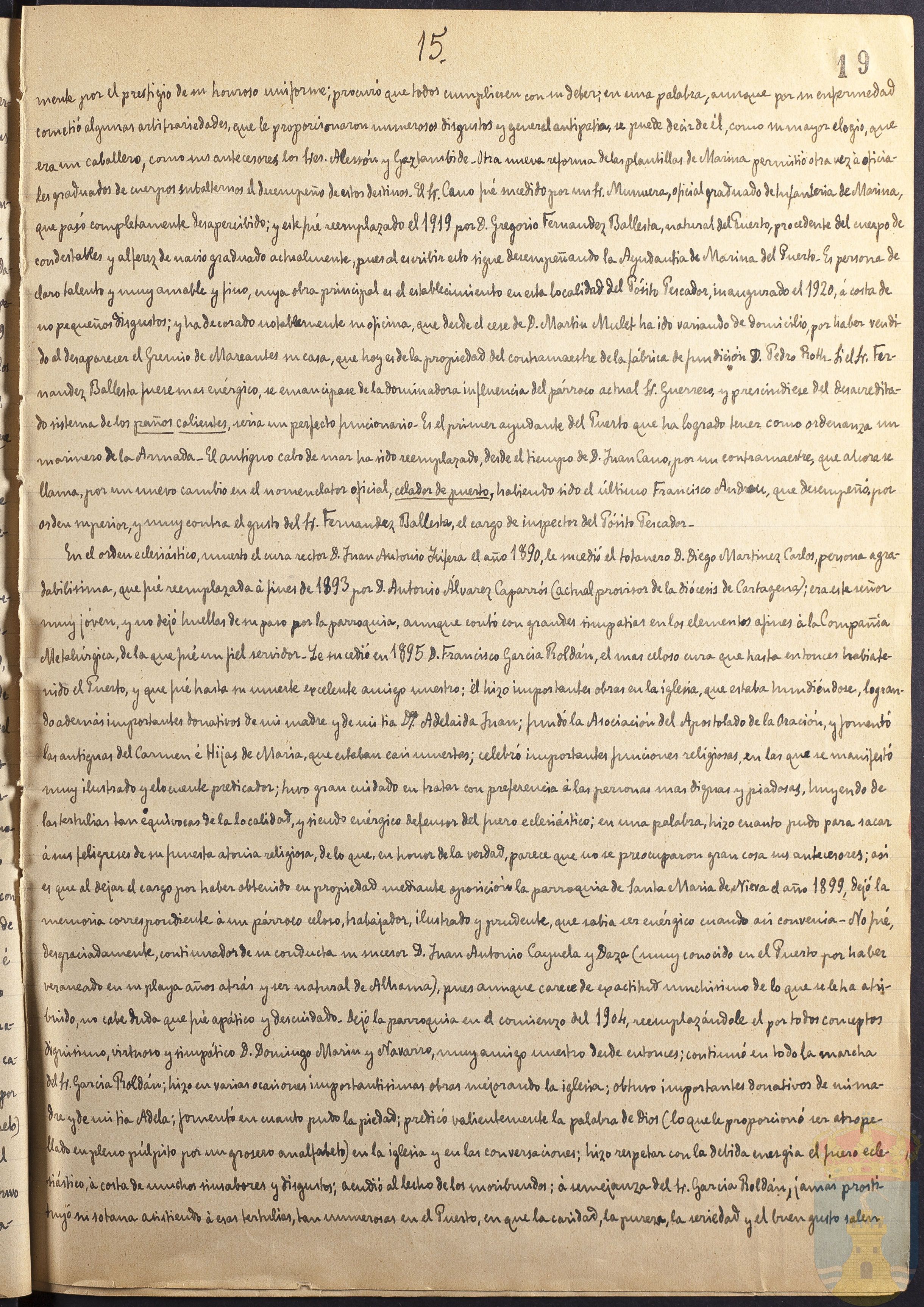 En el orden eclesiástico, muerto el cura rector D. Juan Antonio Yúfera el año 1890, le sucedió el totanero D. Diego Martínez Carlos, persona agradabilísima, que fué reemplazada a fines de 1893 por D. Antonio Álvarez Caparrós (Actual provisor de la diocésis de Cartagena); era este señor muy joven, y no dejó huellas de su paso por la parroquia, aunque contó con grandes simpatías en los elementos afines á la Compañía Metalúrgica, de la que fué un fiel servidor. Le sucedió en 1895 D. Francisco García Roldán, el más celoso cura que hasta entonces había tenido el Puerto y que fué hasta su muerte excelente amigo nuestro; él hizo importantes obras en la iglesia, que estaba hundiéndose, logrando además importantes donativos de mi madre y de mi tía Dª Adelaida Juan; fundó la Asociación del Apostolado de la Oración, y fomentó las antiguas del Carmen é Hijas de María que estaban casi muertas; celebró importantes funciones religiosas en las que se manifestó muy ilustrado y elocuente predicador; tuvo gran cuidado en tratar con preferencia á las personas más dignas y piadosas, huyendo de las tertulias tan equívocas de la localidad, y siendo enérgico defensor del fuero eclesiástico; en una palabra, hizo cuanto pudo para sacar á sus feligreses de su funesta atonia religiosa, de lo que, en honor a la verdad, parece que no se preocupan gran cosas sus antecesores; así es que al dejar el cargo por haber obtenido en propiedad mediante oposición la parroquia de Santa María de Nieva el año 1899, dejó la memoria correspondiente á un párroco celoso, trabajador, ilustrado y prudente, que sabía ser enérgico cuando así convenía. No fué, desgraciadamente, continuador de su conducta su sucesor D. Juan Antonio Cayuela y Daza? (muy conocido en el Puerto por haber veraneado en su playa años atrás y ser natural de Alhama) pues aunque carece de exactitud muchísimo de lo que se le ha atribuido, no cabe duda que fué apático y descuidado. Dejó la parroquia en el comienzo del 1904, reemplazándole el por todos conceptos dignísimo, virtuoso y simpático D. Domingo Marín y Navarro, muy amigo nuestro ese entonces; continuó en todo la marcha del Sr. García Roldán; hizo en varias ocasiones importantísimas obras mejorando la iglesia; obtuvo importantes donativos de mi madre y de mi tía Adela; fomentó en cuanto pudo la piedad; practicó valientemente la palabra de dios (lo que le proporcionó ser atropellado en pleno púlpito por un grosero analfabeto) en la iglesia y en las conversaciones; hizo respetar con la debida energía el fuero eclesiástico, á costa de muchos sinsabores y disgustos; acudió al lecho de los moribundos; a semejanza del Sr. García Roldán, jamás prostituyó su sotana asistiendo á esas tertulias, tan numerosas en el Puerto, en que la caridad, la pureza, la seriedad y el buen gusto salen...