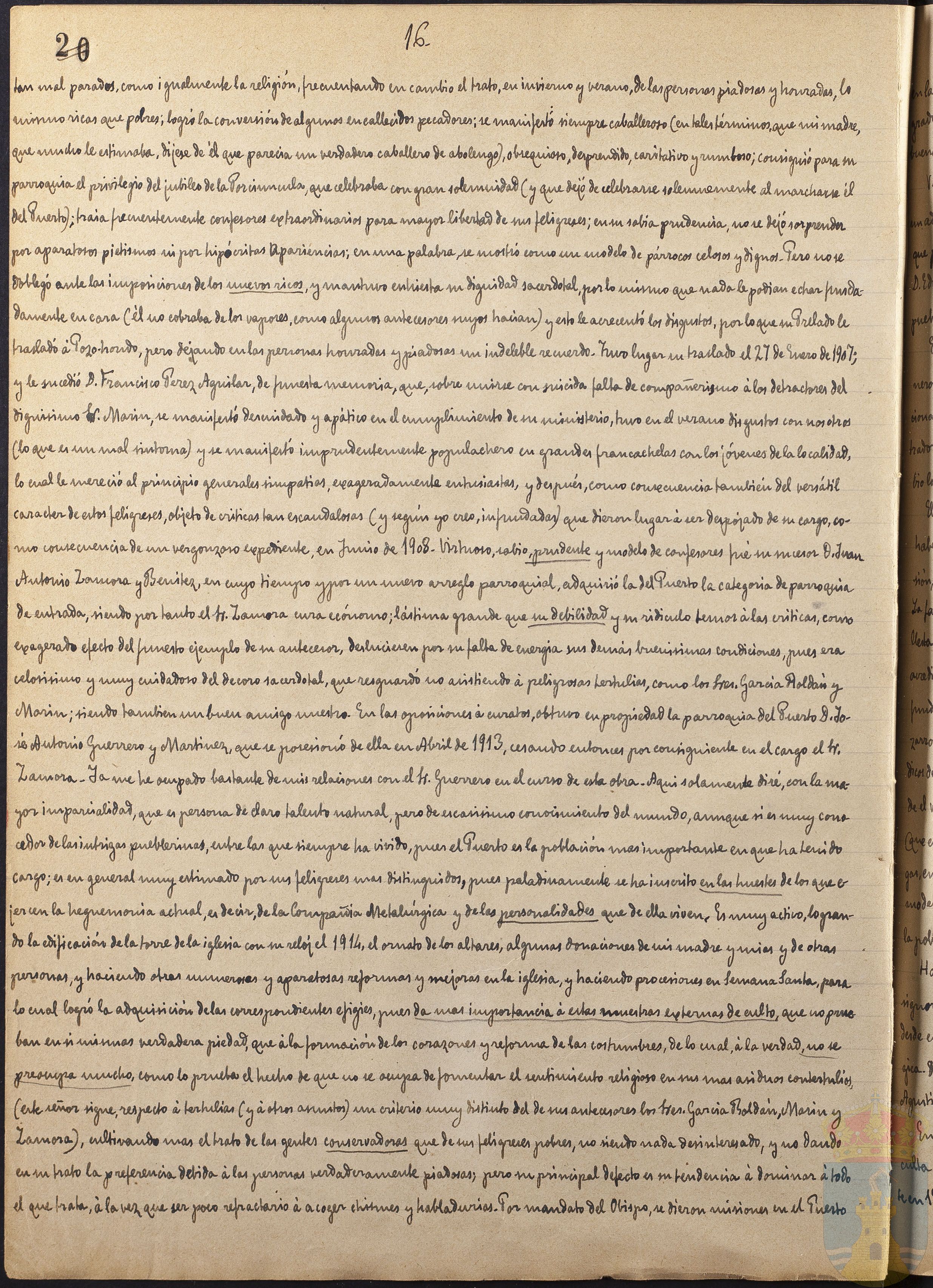 tan mal parados, como igualmente la religión, frecuentando en cambio el trato, en invierno y verano, de las personas piadosas y honradas, lo mismo ricas que pobres; logró la conversión de algunos encallecidos pecadores; se manifestó siempre caballeroso (en tales términos que mi madre que mucho le estimaba, dijese de él que parecía un verdadero caballero de abolengo), obsequioso, desprendido, caritativo y rumboso; consiguió para su parroquia el privilegio del jubileo de la Porciúncula, que celebraba con gran solemnidad (y que dejó de celebrarse solemnemente al marcharse él del Puerto); traía frecuentemente confesores extraordinarios para mayor libertad de sus feligreses; en su sabia prudencia, no se dejó sorprender por aparatosos pietismos ni por hipócritas apariencias; en una palabra, se mostró como un modelo de párrocos celosos y dignos. Pero no se doblegó ante las imposiciones de los nuevos ricos y mantuvo entusiasta su dignidad sacerdotal, por lo mismo que nada le podían echar fundadamente en cara (él no cobraba de los vapores, como algunos antecesores hacían) y esto le acrecentó los disgustos, por lo que un Prelado no trasladó a Pozo-hondo, pero dejando con las personas honradas y piadosas un indeleble recuerdo. Tuvo lugar su traslado el 27 de Enero de 1907; y le sucedió D. Francisco Pérez Aguilar, de funesta memoria, que, sobre unirse con suicida falta de compañerismo á los detractores del dignísimo Sr. Marín, se manifestó descuidado y apático en el cumplimiento de su ministerio, tuvo en el verano disgustos con nosotros (lo que es un mal síntoma) y se manifestó imprudentemente populachero en grandes francachelas con los jóvenes de la localidad, lo cual le mereció al principio generales simpatías, exageradamente entusiastas y después, como consecuencia también del versátil carácter de estos feligreses, objeto de críticas tan escandalosas (y según yo creo, infundadas) que dieron lugar á ser despojado de su cargo, como consecuencia de un vergonzoso expediente, en Junio de 1908. Virtuoso, sabio, prudente y modelo de confesores fué su sucesor D. Juan Antonio Zamora y Benítez, en cuyo tiempo y por un nuevo arreglo parroquial, adquirió la del Puerto la categoría de parroquia de entrada, siendo por tanto el Sr. Zamora cura (...); lástima grande que su debilidad y su ridículo terror á las críticas, como exagerado efecto del funesto ejemplo de su antecesor, desluciesen por su falta de energía sus demás buenísimas condiciones, pues era celosísimo y muy cuidadoso del decoro sacerdotal, que resguardó no asistiendo á peligrosas tertulias, como los Sres. García Roldán y Marín, siendo también un buen amigo nuestro. En las oposiciones á curatos, obtuvo en propiedad la parroquia del Puerto D. José Antonio Guerrero y Martínez, que se posesionó de ella en Abril de 1913, cesando entonces por consiguiente en el cargo el Sr. Zamora. Ya me he ocupado de mis relaciones con el Sr. Guerrero en el curso de esta otra. Aquí solamente diré, con la mayor imparcialidad, que es persona de claro talento natural, pero de escasísimo conocimiento del mundo, aunque si es muy conocedor de las intrigas pueblerinas, entre las que siempre ha vivido, pues el Puerto es la población más importante en que ha tenido cargo; en general muy estimado por sus feligreses más distinguidos, pues paladinamente se ha inscrito en las huestes de los que ejercen la hegemonía actual, es decir, de la Compañía Metalúrgica y de las personalidades que de ella viven. Es muy activo, logrando la edificación de la torre de la iglesia con su reloj el 1914, el ornato de los altares, algunas donaciones de mi madre y mías y de otras personas, y haciendo otras numerosas y aparatosas reformas y mejoras en la iglesia, y haciendo procesiones en Semana Santa, para lo cual logró la adquisición de las correspondientes efigies, pues da más importancia á estas muestras externas de culto que no pone bien en sí mismas verdadera piedad, que á la formación de los corazones y reforma de las costumbres, de lo cual, á la verdad, no se preocupa mucho como lo prueba el hecho de que no se ocupa de fomentar el sentimiento religioso en sus más asiduas contertulias (este señor sigue, respecto á tertulias (y á otros asuntos) un criterio muy distinto del de sus antecesores los Sres. García Roldán, Marín y Zamora), cultiva más el trato de las gentes conservadoras que de sus feligreses pobres, no siendo nada desinteresado, y no dando en su trato la preferencia debida á las personas verdaderamente piadosas; pero su principal defecto es su tendencia á dominar á todo el que trata, á la vez que ser poco refractario á acoger chismes y habladurías. Por mandato del Obispo, se dieron misiones en el Puerto...