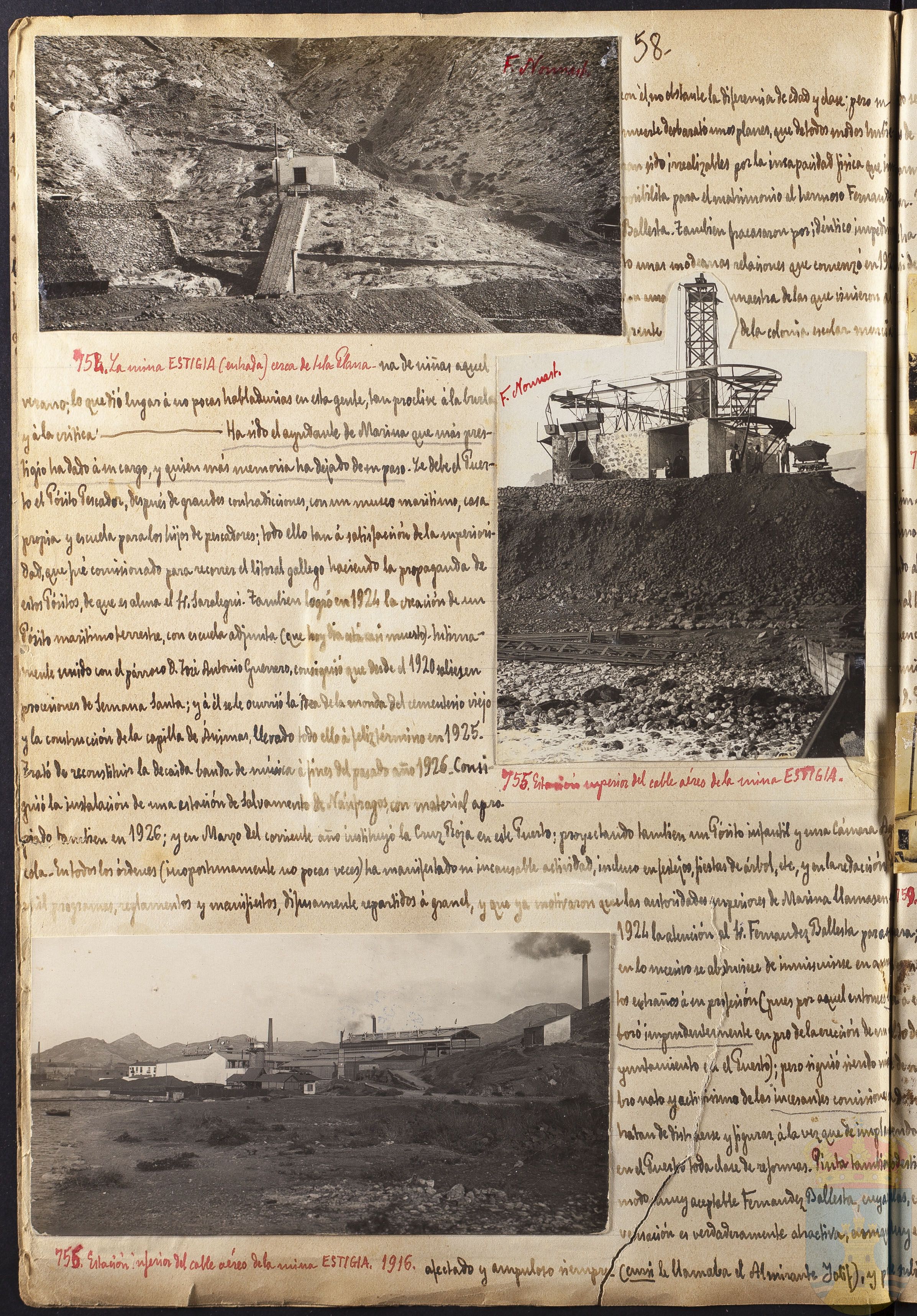 con él no obstante la diferencia de edad y clase; pero...desbarató unos planes, que de todos modos hubiesen sido irrealizables, por la incapacidad... para el matrimonio el hermoso Fernández Ballesta. También fracasaron por idéntico impedimento unas ... relaciones que comenzó en 19... maestra de las que vinieron... de la colonia escolar...de niñas aquel verano; lo que dió lugar á no pocas habladurías en esta gente, tan proclive á la burla y á la crítica. Ha sido el ayudante de Marina que más prestigio ha dado á su cargo, y quien más memoria ha dejado de su paso. Le debe el Puerto el Pósito Pescador, después de grandes contradicciones, con un museo marítimo, casa propia y escuela para los hijos de pescadores; todo ello tan á satisfacción de la superioridad que fué comisionado para recorrer el literal gallego haciendo propaganda de estos Pósitos, de que es alma el Sr. Saralegui. También logró en 1924 la creación de un Pósito marítimo terrestre, con escuela adjunta (que hoy día está...muerto). Íntimamente unido con el párroco D. José Antonio Guerrero, consiguió que desde el 1920 saliesen procesiones de Semana Santa; y á él se le ocurrió la idea de la monda del cementerio viejo y la construcción de la capilla de Ánimas, llevado todo ello á feliz término en 1925. Trató de reconstituir la decaída banda de música á fines del pasado año 1926. Consiguió la instalación de una estación de Salvamento de Náufragos, con material apropiado también en 1926; y en Marzo del corriente año instituyó la Cruz Roja en este Puerto; proyectando también un Pósito infantil y una Cámara de... En todos los órdenes (inoportunamente no pocas veces) ha manifestado su incansable actividad, incluso en festejos, fiestas de árbol, etc, y en la redacción... y manifiestos, difusamente, repartidos á granel, y que ya... que las autoridades superiores de Marina llamasen... 1924 la atención al Sr. Fernández Ballesta para... en lo sucesivo se abstuviese de inmiscuirse en asuntos extraños á su profesión (pues por aquel entonces colaboró imprudentemente en pro de la erección de un ayuntamiento en el Puerto); pero siguió siendo... nato y activismo de las incesantes... y figurar, á la vez que de... en el Puerto toda clase de reformas. Pinta también... muy aceptable Fernández Ballesta,... es verdaderamente atractiva... afectado y... siempre (...le llamaba el Almirante Yolif?), y...