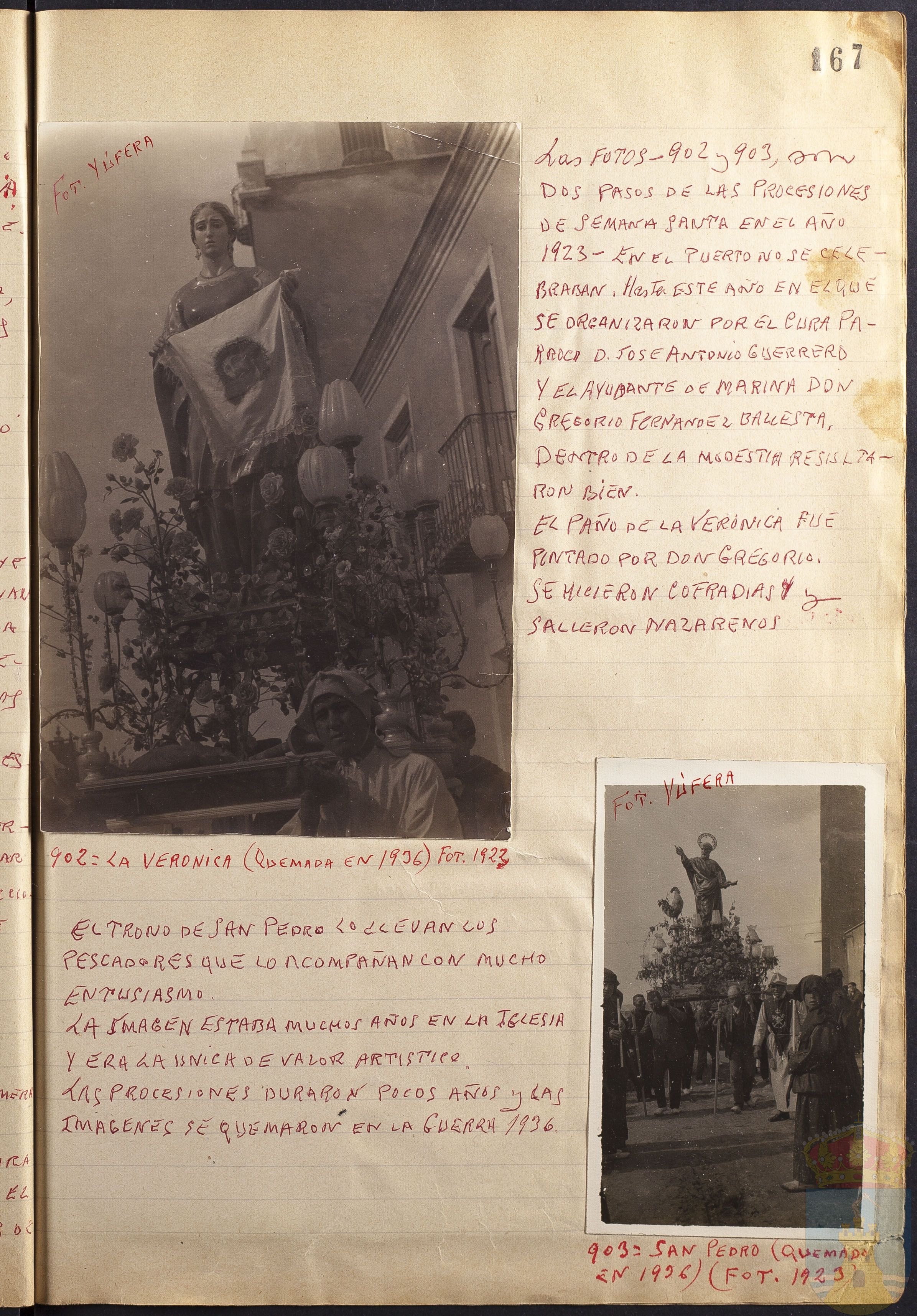 LAS FOTOS 902 Y 903 SON DOS PASOS DE LAS PROCESIONES DE SEMANA SANTA EN EL AÑO 1923. EN EL PUERTO NO SE CELEBRABAN. HASTA ESTE AÑO EN EL QUE SE ORGANIZARON POR EL CURA PÁRROCO D. JOSÉ ANTONIO GUERRERO Y EL AYUDANTE DE MARINA DON GREGORIO FERNÁNDEZ BALLESTA. DENTRO DE LA MODESTIA RESULTARON BIEN. EL PAÑO DE LA VERÓNICA FUE PINTADO POR DON GREGORIO. SE HICIERON COFRADÍAS Y SALIERON NAZARENOS.
