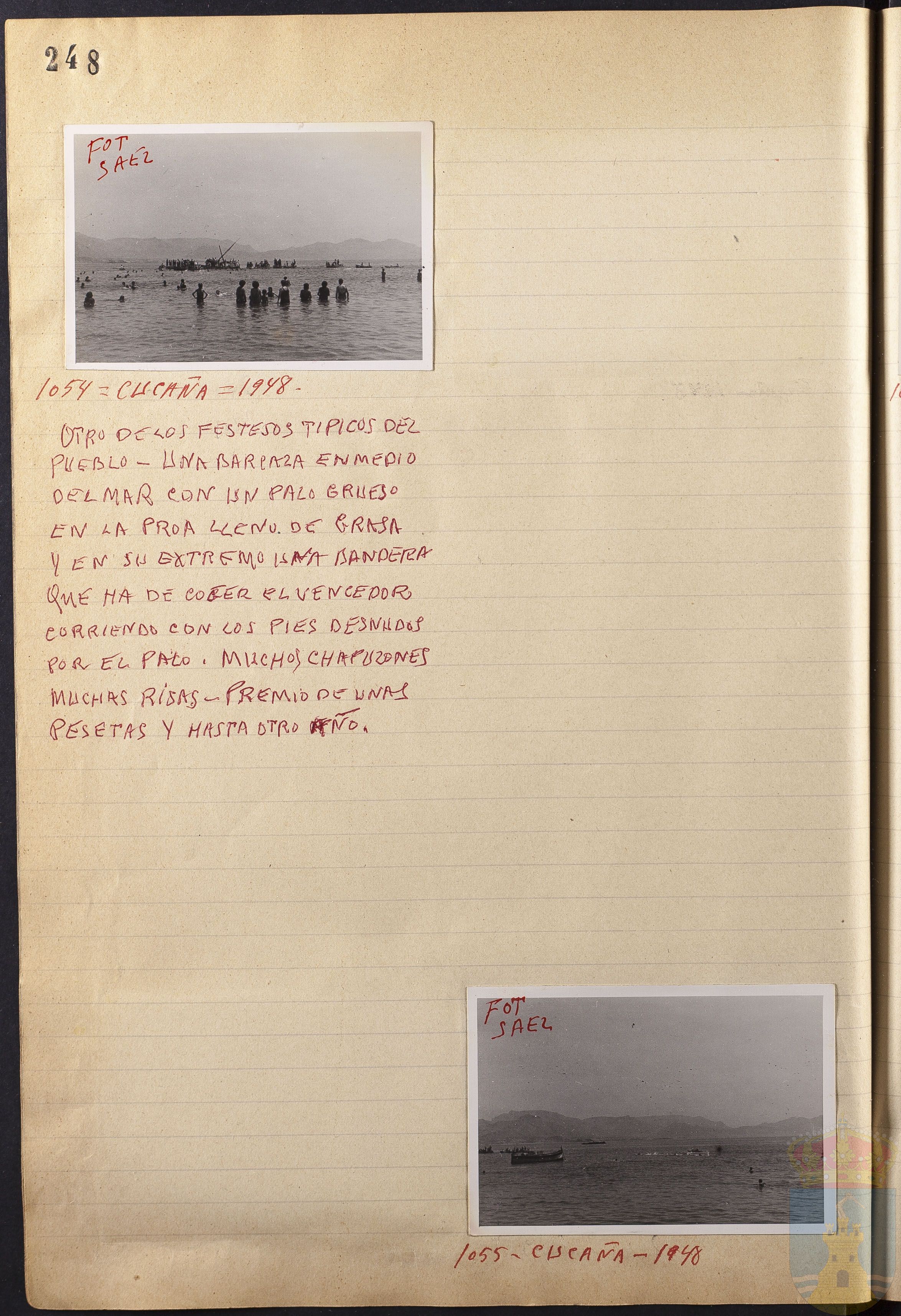 Comentario de la fotografía 1054: OTRO DE LOS FESTEJOS TÍPICOS DEL PUEBLO - UNA BARRACA EN MEDIO DEL MAR CON UN PALO GRUESO EN LA PROA LLENO DE GRASA Y EN SU EXTREMO UNA BANDERA QUE HA DE COGER EL VENCEDOR CORRIENDO CON LOS PIES DESNUDOS POR EL PALO. MUCHOS CAPUZONES MUCHAS RISAS - PREMIO DE UNAS PESETAS Y HASTA OTRO AÑO.