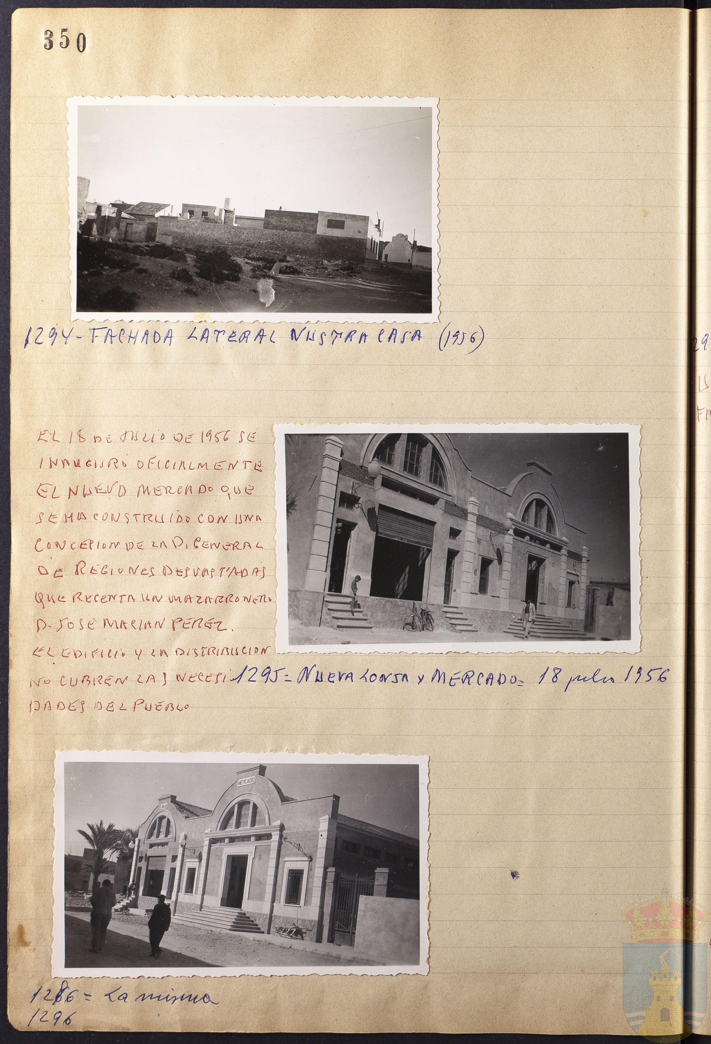 Comentario de la fotografía 1295: EL 18 DE JULIO DE 1956 SE INAUGURÓ OFICIALMENTE EL NUEVO MERCADO QUE SE HA CONSTRUIDO CON UNA CONCEPCIÓN DE LA D. GENERAL DE REGIONES DEVASTADAS QUE REGENTE UN MAZARRONERO D. JOSÉ MACÍAN? PÉREZ. EL EDIFICIO Y LA DISTRIBUCIÓN NO CUBREN LAS NECESIDADES DEL PUEBLO.