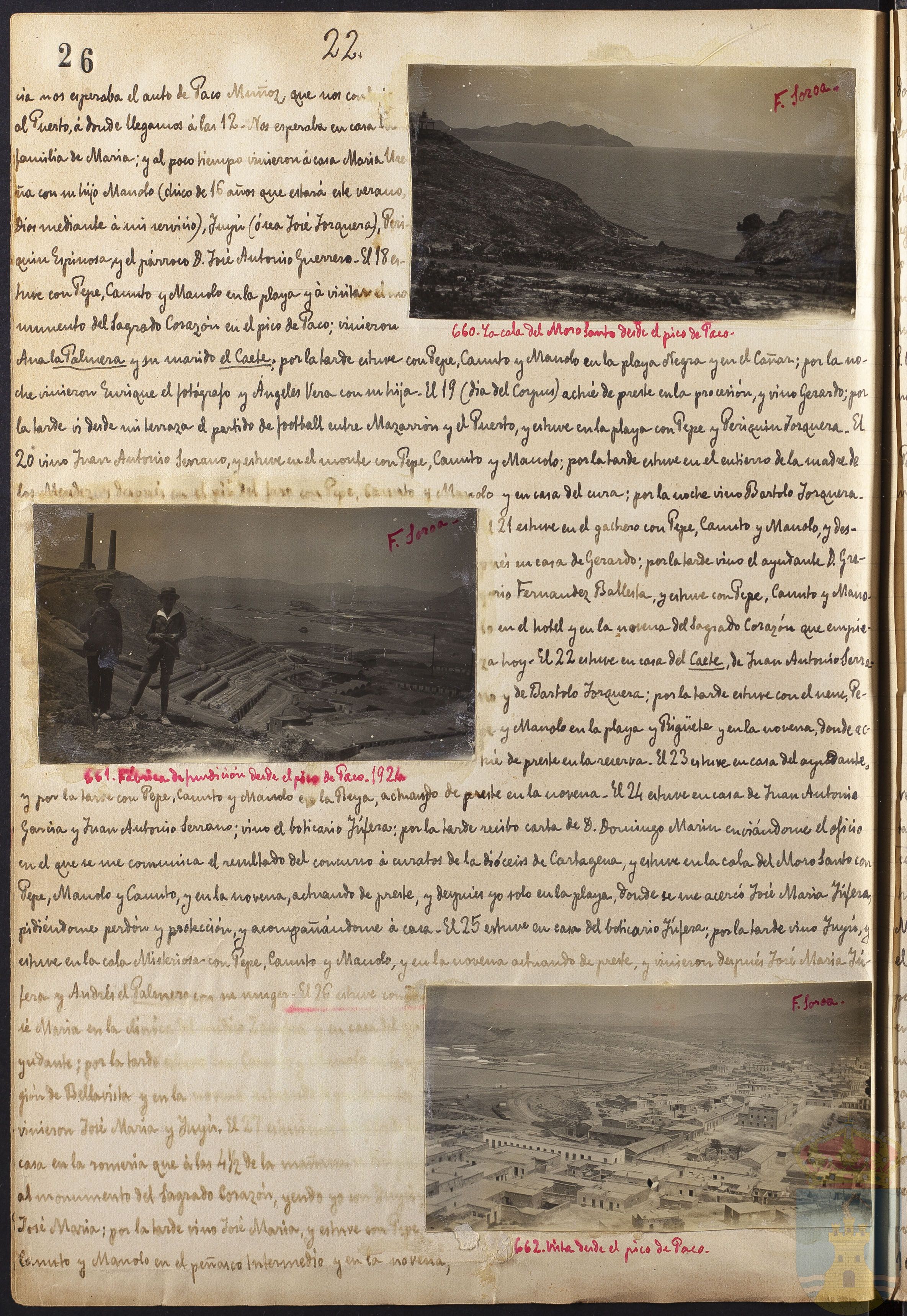 nos esperaba el auto de Paco Muñoz, que nos... al Puerto, á donde llegamos á las 12. Nos esperaba en casa la familia de María; y al poco tiempo vinieron á casa María Ureña con su hijo Manolo (chico de 16 años que estará este verano, Dios mediante á mi servicio), Yuyú (ó sea José Jorquera), Peroquín Espinosa y el párroco D. José Antonio Guerrero. El 18 estuve con Pepe, Canuto y Manolo en la playa y á visitar el monumento del Sagrado Corazón en el pico de Paco; vinieron Ana la Palmera y su marido el Caete; por la tarde estuve con Pepe, Canuto y Manolo en la playa Negra y en el Cañar; por la noche vinieron Enrique el fotógrafo y Ángeles Vera con su hija. El 19 (día del Corpus) actué de preste en la procesión, y vino Gerardo; por la tarde vi desde mi terraza el partido de football entre Mazarrón y el Puerto, y estuve en la playa con Pepe y Periquín Jorquera. El 20 vino Juan Antonio Serrano, y estuve en el monte con Pepe, Canuto y Manolo; por la tarde estuve en el entierro de la madre de los... con Pepe, Canuto y Manolo y en casa del cura; por la noche vino Bartolo Jorquera. El 21 estuve en el gachero con Pepe, Canuto y Manolo, y después en cas de Gerardo; por la tarde vino el ayudante D. Gregorio Fernández Ballesta y estuve con Pepe, Canuto y Manolo en el hotel y en la novena del Sagrado Corazón que empieza hoy. El 22 estuve en casa de Caete, de Juan Antonio Serrano y de Bartolo Jorquera; por la tarde estuve con el nene, Pepe y Manolo en la playa y Rigüete y en la novena, donde actué de preste en la reserva. El 23 estuve en casa del ayudante y por la tarde con Pepe, Canuto y Manolo en la Reya, actuando de preste en la novena. El 24 estuve en casa de Juan Antonio García y Juan Antonio Serrano; vino el boticario Yúfera; por la tarde recibo carta de D. Domingo Marín enviándome el oficio en el que se me comunica el resultado del concurso á curados de la diócesis de Cartagena, y estuve en la cala del Moro Santo con Pepe, Manolo y Canuto, y en la novena, actuando de preste, y después yo solo en la playa, donde se me acercó José María Yúfera pidiéndome perdón y protección y acompañándome á casa. El 25 estuve en casa del boticario Yúfera; por la tarde vino Yuyú y estuve en la cala Misteriosa con Pepe, Canuto y Manolo y en la novena actuando de preste, y vinieron después José María Yúfera y Andrés el Palmero con su muger. El 26 estuve con José María en la... ayudante; por la tarde... de Bellavista y en la... vinieron José María y Yuyú. El 27... casa en la romería que á las 4 1/2 de la mañana... al monumento del Sagrado Corazón, yendo yo... José María; por la tarde vino José María y estuve con Pepe, Canuto y Manolo en el peñasco Intermedio y en la novena,...