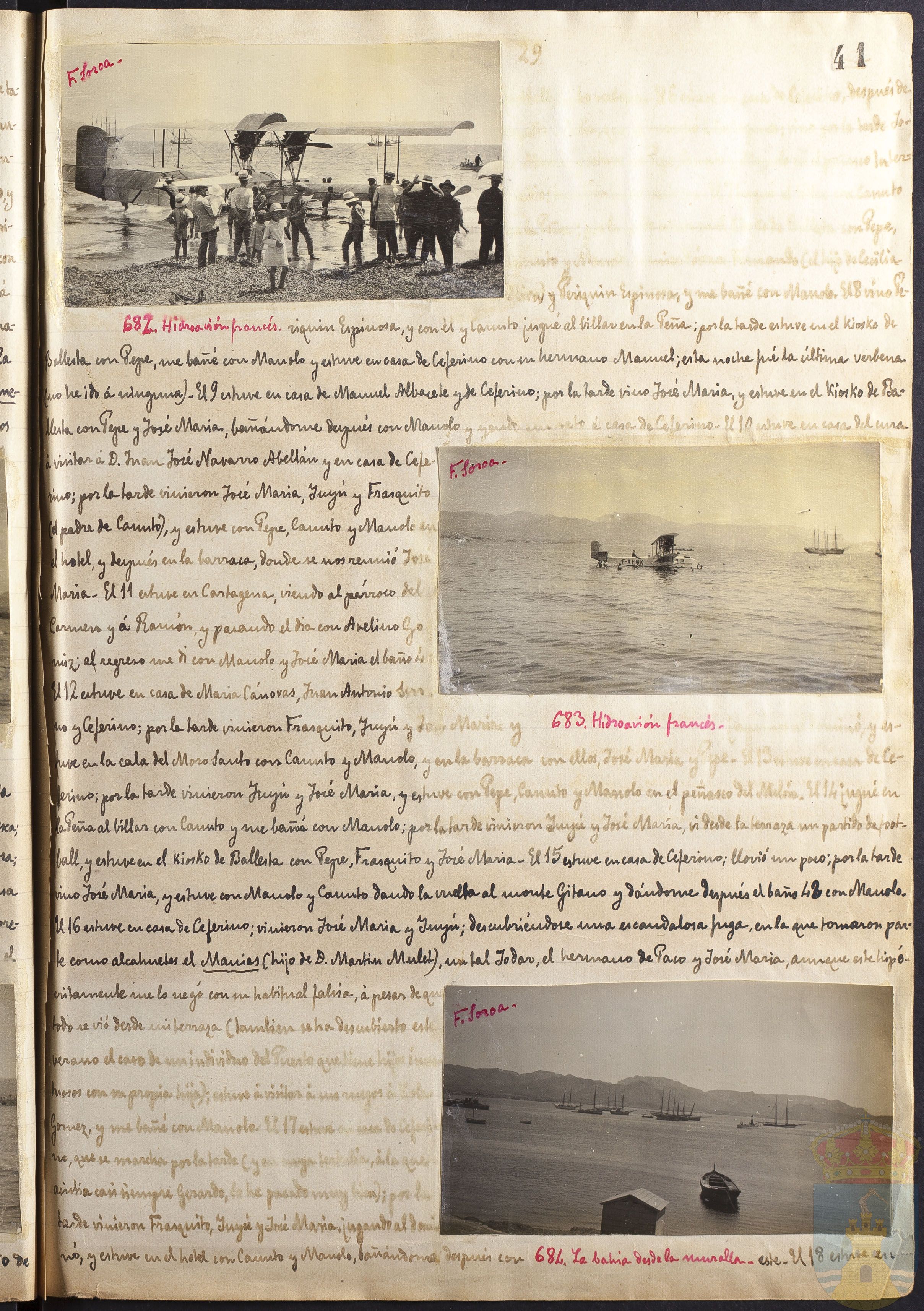 ...y Periquín Espinosa, y me bañé con Manolo. El 8 vino Periquín Espinosa, y con él y Canuto jugué al billar en la Peña; por la tarde estuve en el kiosko de Ballesta con Pepe, me bañé con Manolo y estuve en casa de Ceferino con su hermano Manuel; esta noche fué la última verbena (no he ido a ninguna). El 9 estuve en casa de Manuel Albacete y de Ceferino; por la tarde vino José María y estuve en el kiosko de Ballesta con Pepe y José María, bañándome después con Manolo y yendo... á casa de Ceferino. El 11 estuve en casa del cura á visitar á D. Juan José Navarro Abellán y en casa de Ceferino; por la tarde vinieron José María, Yuyú y Frasquito (el padre de Canuto), y estuve con Pepe, Canuto y Manolo en el hotel, y después en la barraca, donde se nos reunió José María. El 11 estuve en Cartagena, viendo al párroco del Carmen y á Ramón, y pasando el día con Avelino Gómiz; al regreso me di con Manolo y José María el baño 4... El 12 estuve en casa de María Cánovas, Juan Antonio... y Ceferino; por la tarde vinieron Frasquito, Yuyú y José María y... estuve en la cala del Moro Santo con Canuto y Manolo, y en la barraca con ellos, José María y... El 13... de Ceferino; por la tarde vinieron Yuyú y José María, y estuve con Pepe, Canuto y Manolo en el peñasco del Melón. El 14 jugué en la Peña al billar con Canuto y me bañé con Manolo; por la tarde vinieron Yuyú y José María, vi desde la terraza un partido de football y estuve en el kiosko de Ballesta con Pepe, Frasquito y José María. El 15 estuve en casa de Ceferino; llovió un poco; por la tarde vino José María, y estuve con Manolo y Canuto dando la vuelta al monte Gitano y dándome después el baño 43 con Manolo. El 16 estuve en casa de Ceferino, vinieron José María y Yuyú; descubriéndose una escandalosa fuga, en la que tomaron parte como alcahuetos el Manías (hijo de D. Martín Mulet), un tal Jodar?, el hermano de Paco y José María, aunque este hipócritamente me lo negó con su habitual..., á pesar de que todo se vió desde mi terraza (también se ha descubierto este verano el caso de un individuo del... con su propia hija)... estuve á visitar á sus... Gómiz, y me bañé con Manolo. El 17 estuve... que se marcha por la tarde... asistía casi siempre Gerardo, lo he pasado muy bien); por la tarde vinieron Frasquito, Yuyú y José María, jugando al dominó, y estuve en el hotel con Canuto y Manolo, bañándome después con... El 18 estuve en...