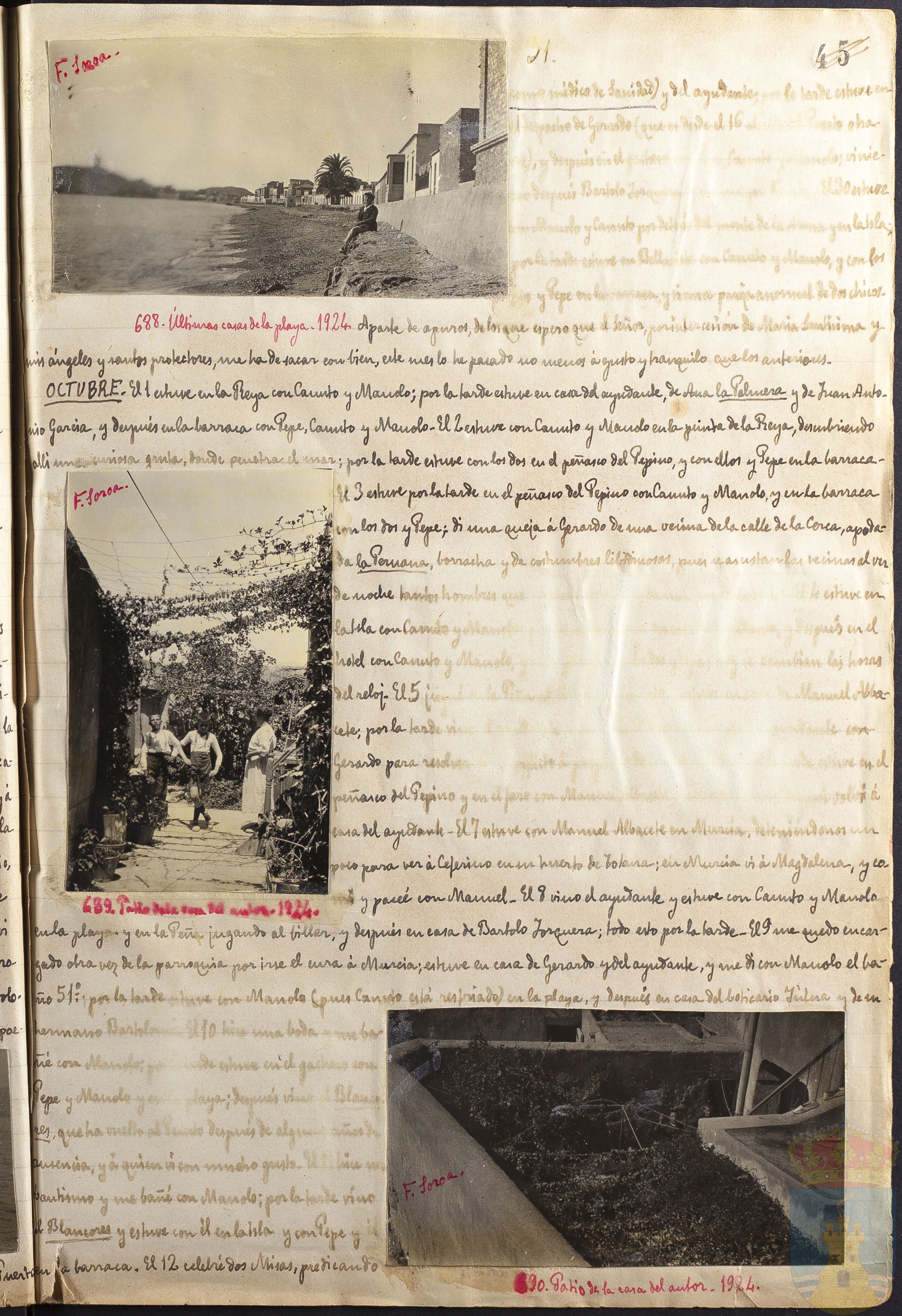 OCTUBRE. El 1 estuve en la Reya con Canuto y Manolo; por la tarde estuve en casa del ayudante, de Ana la Palmera y de Juan Antonio García, y después en la barraca con Pepe, Canuto y Manolo. El 2 estuve con Canuto y Manolo en la punta de la Reya, descubriendo allí una curiosa gruta, donde penetra el mar; por la tarde estuve con los dos en el peñasco del Pepino, y con ellos y Pepe en la barraca. El 3 estuve por la tarde en el peñasco del Pepino con Canuto y Manolo, y en esta barraca con los dos y Pepe; di una queja á Gerardo de una vecina de la calle de la Cerca, apodada la Pernana?, borracha y de costumbres libidinosas, pues... al ver de noche tantos hombres... estuve en la Isla con Canuto y... en el hotel con Canuto y Manolo... del reloj. El 5..., por la tarde..., Gerardo para..., peñasco del Pepino y en el faro..., casa del ayudante. El 7 estuve con Manuel Albacete en Murcia, ..., para ver á Ceferino en un huerto de Totana; en Murcia ví á Magdalena, y... paseé con Manuel. El 8 vino el ayudante y estuve con Canuto y Manolo en la playa y en la Peña jugando al billar, y después en casa de Bartolo Jorquera; todo esto por la tarde. El 9 me quedo encargado otra vez de la parroquia por irse el cura á Murcia; estuve en casa de Gerardo y del ayudante, y me dí con Manolo el baño 51º; por la tarde estuve con Manolo (pues Canuto está resfriado) en la playa, y después en casa del boticario Yúfera y de su hermano Bartolomé. El 10 hice una boda, me bañé con Manolo... estuve en el gachero..., Pepe y Manolo... ausencia... bautismo y me bañé con Manolo; por la tarde vino el Blancores y estuve con él en la Isla y con Pepe y... la barraca. El 12 celebré dos Misas, predicando...