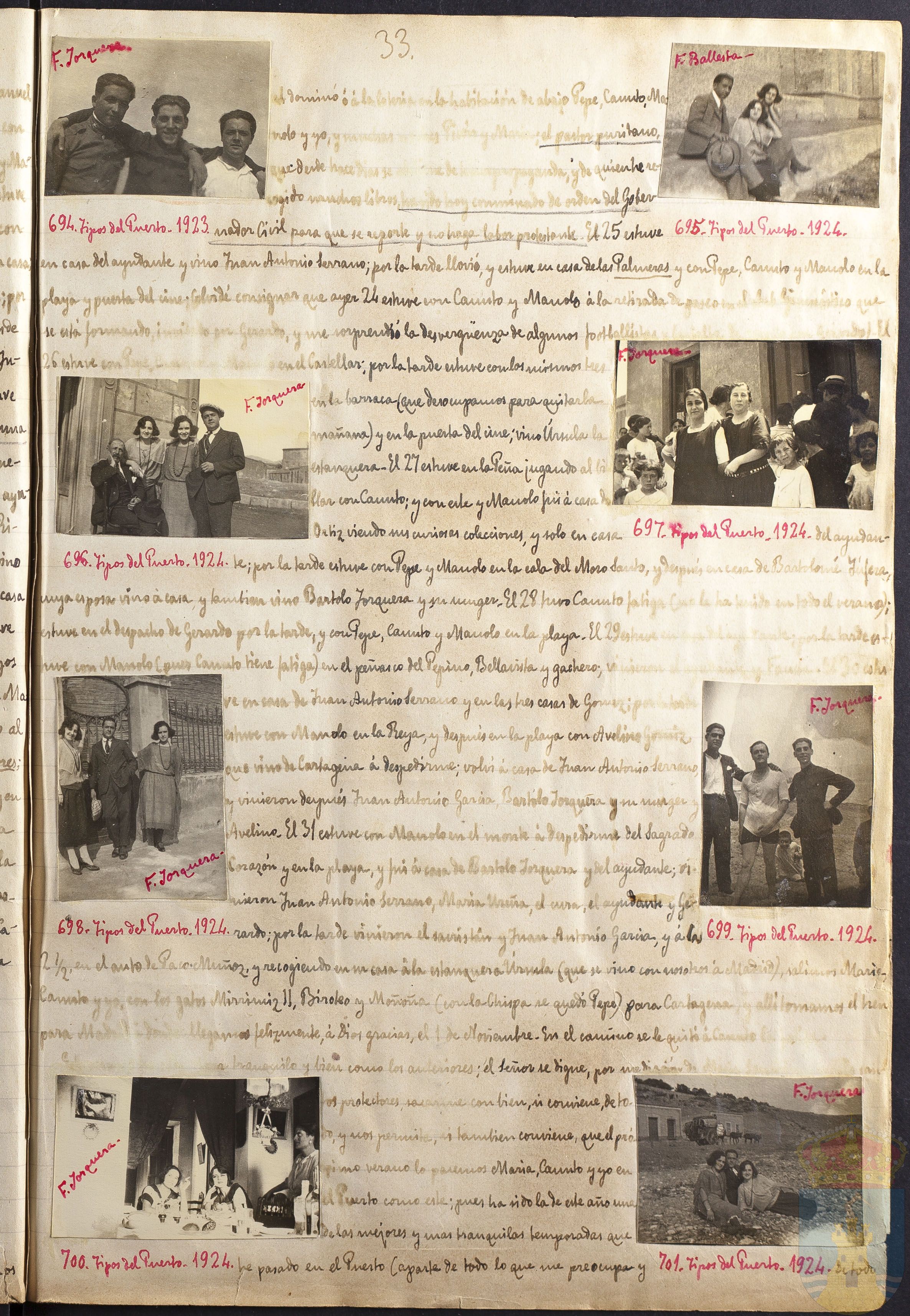 al dominó o la lotería... Pepe, Canuto, Manolo y yo...; el pastor puritano... del Gobernador Civil para que se reporte y no haga labor protestante. El 25 estuve en casa del ayudante y vino Juan Antonio Serrano; por la tarde llovió, y estuve en casa de las Palmeras y con Pepe, Canuto y Manolo en la playa y puerta del cine?. (olvidé consignar que ayer 24 estuve con Canuto y Manolo á la retirada de paseo... se está formando... y me sorprendió la desvergüenza de algunos... 26 estuve con Pepe... en el Castellar: por la tarde estuve con los mismos tres en la barraca (que desocupamos para quitarla mañana) y en la puerta del cine; vino Úrsula la estanquera. El 27 estuve en la Peña jugando al billar con Canuto; y con este y Manolo fuí á casa de Ortiz viendo sus curiosas colecciones y solo en casa del ayudante; por la tarde estuve con Pepe y Manolo en la cala del Moro Santo, y después en casa de Bartolomé Yúfera, cuya esposa vino a casa y también vino Bartolo Jorquera y su muger. El 28 tuvo Canuto fatiga (...el verano); estuve en el despacho de Gerardo por la tarde y con Pepe, Canuto y Manolo en la playa. El 29 estuve... con Manolo (pues Canuto tiene fatiga) en el peñasco del Pepino, Bellavista y gachero;... en casa de Juan Antonio Serrano y en las tres casas de Gómez...estuve con Manolo en la Reya, y después en la playa con Avelino... que vino de Cartagena á despedirme; volví á casa de Juan Antonio Serrano y vinieron después Juan Antonio García, Bartolo Jorquera y su muger y Avelino. El 31 estuve con Manolo en el... á despedirme del Sagrado Corazón y en la playa, y fuí á casa de Bartolo Jorquera y del ayudante; vinieron Juan Antonio Serrano, María Ureña, el cura, el ayudante y Gerardo; por la tarde vinieron el sacristán y Juan Antonio García, y á las 2 1/2 en el auto de Paco Muñoz, y recogiendo en su casa á la estanquera Úrsula (que se vino también con nosotros á Madrid) salimos María, Canuto y yo con los gatos Mirrimit II, Biroteo y Moñoña (con la Chispa se quedó Pepe) para Cartagena y allí tomamos el tren para Madrid. ...llegamos felizmente, á Dios gracias el 1 de Noviembre. En el camino se le quitó a Canuto... bien como los anteriores; el Señor se digne por mediación...protectores, si comience... así también conviene que el próximo verano lo pasemos María, Canuto y yo en el Puerto como este; pues ha sido la de este año una de las mejores y unas tranquilas temporadas que he pasado en el Puerto (aparte de todo lo que me preocupa y...