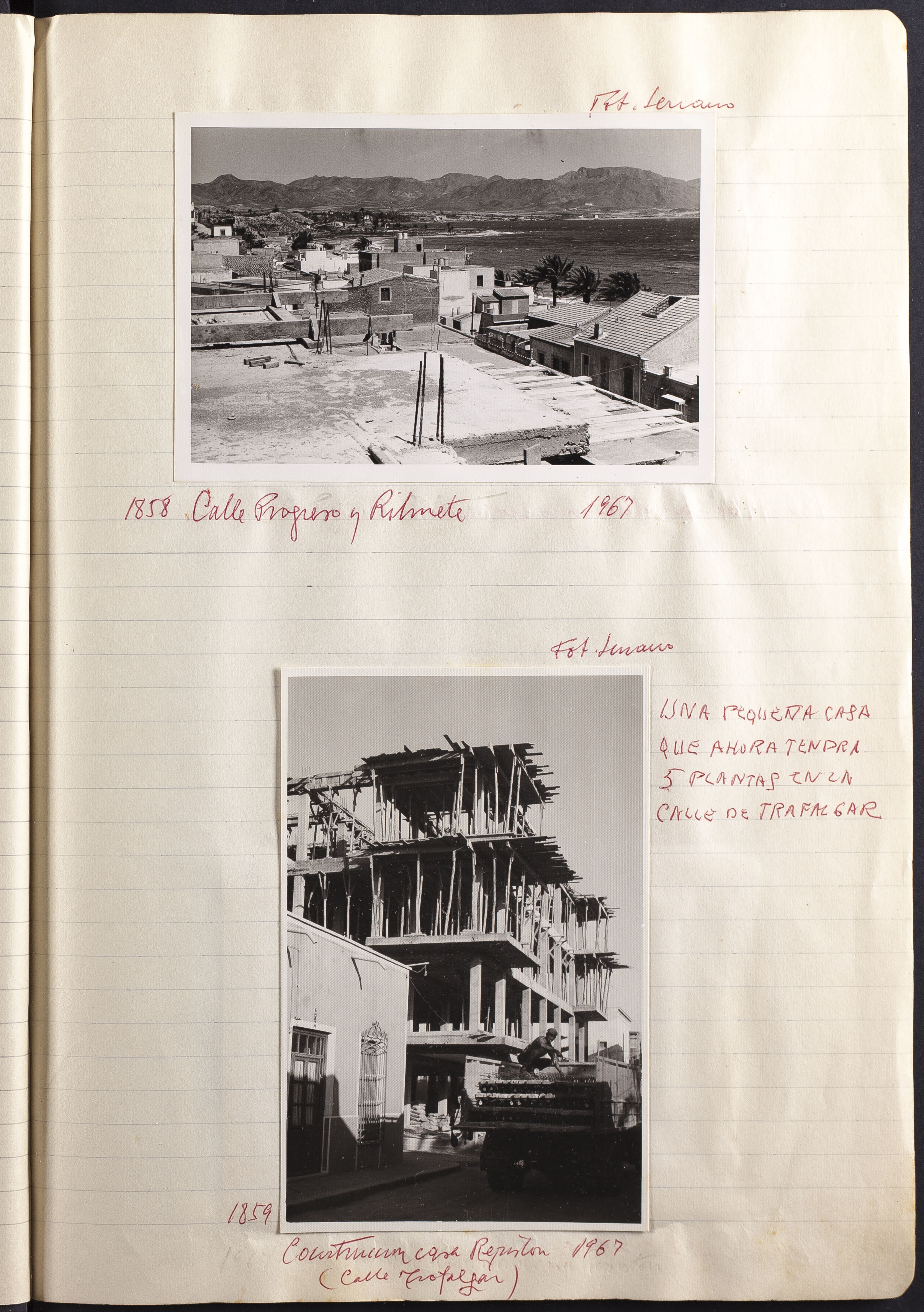Fotografía 1859: Construcción casa Repistón 1967 (Calle Trafalgar). Figura escrito a mano el origen de la fotografía: FOT. Serrano. Tamaño: 13,5 x 8,6 cm.