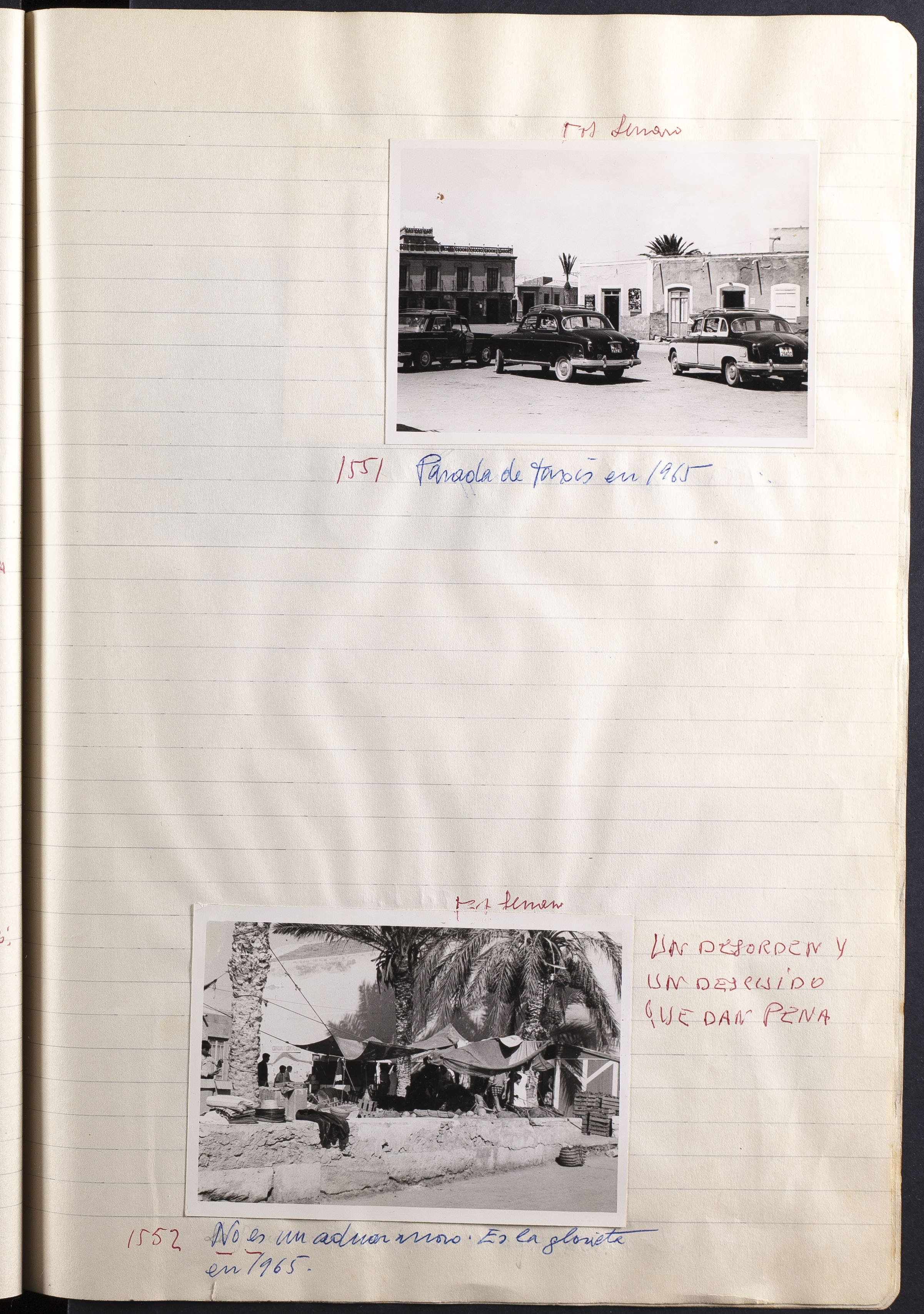 Papel con información manuscrita a bolígrafo tamaño 22 x31 cm. Incluye fotografías monocromas en diferentes tamaños que se especifican en el Alcance y contenido.