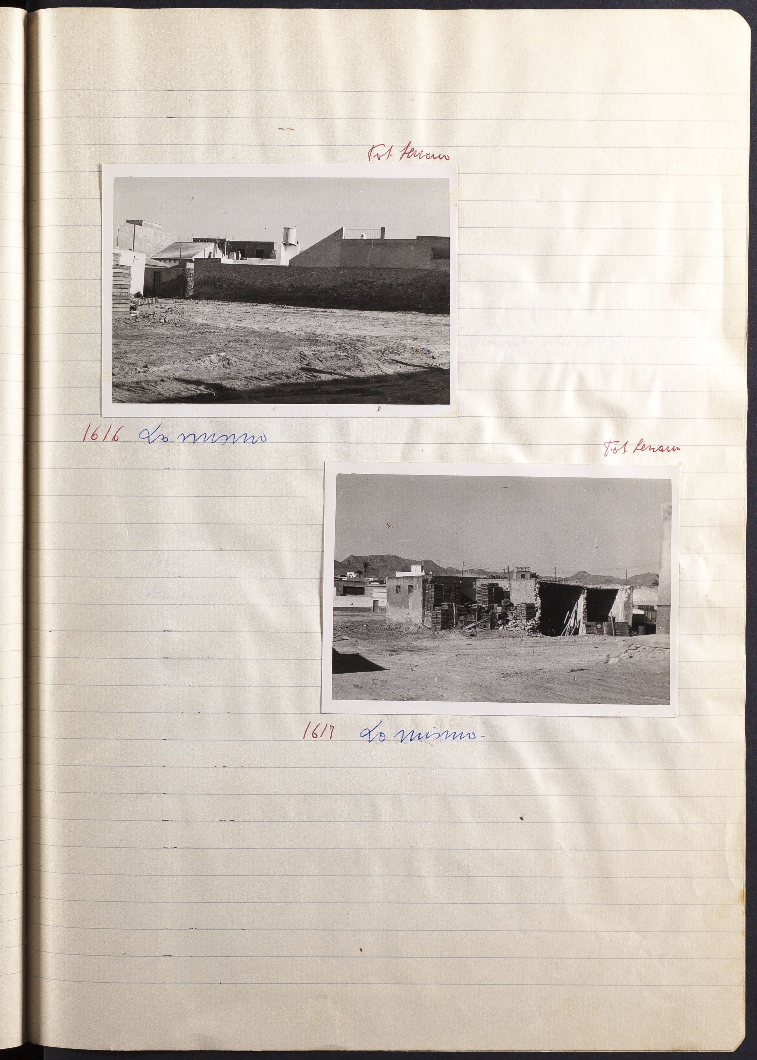 Papel con información manuscrita a bolígrafo tamaño 22 x31 cm. Incluye fotografías monocromas en diferentes tamaños que se especifican en el Alcance y contenido.