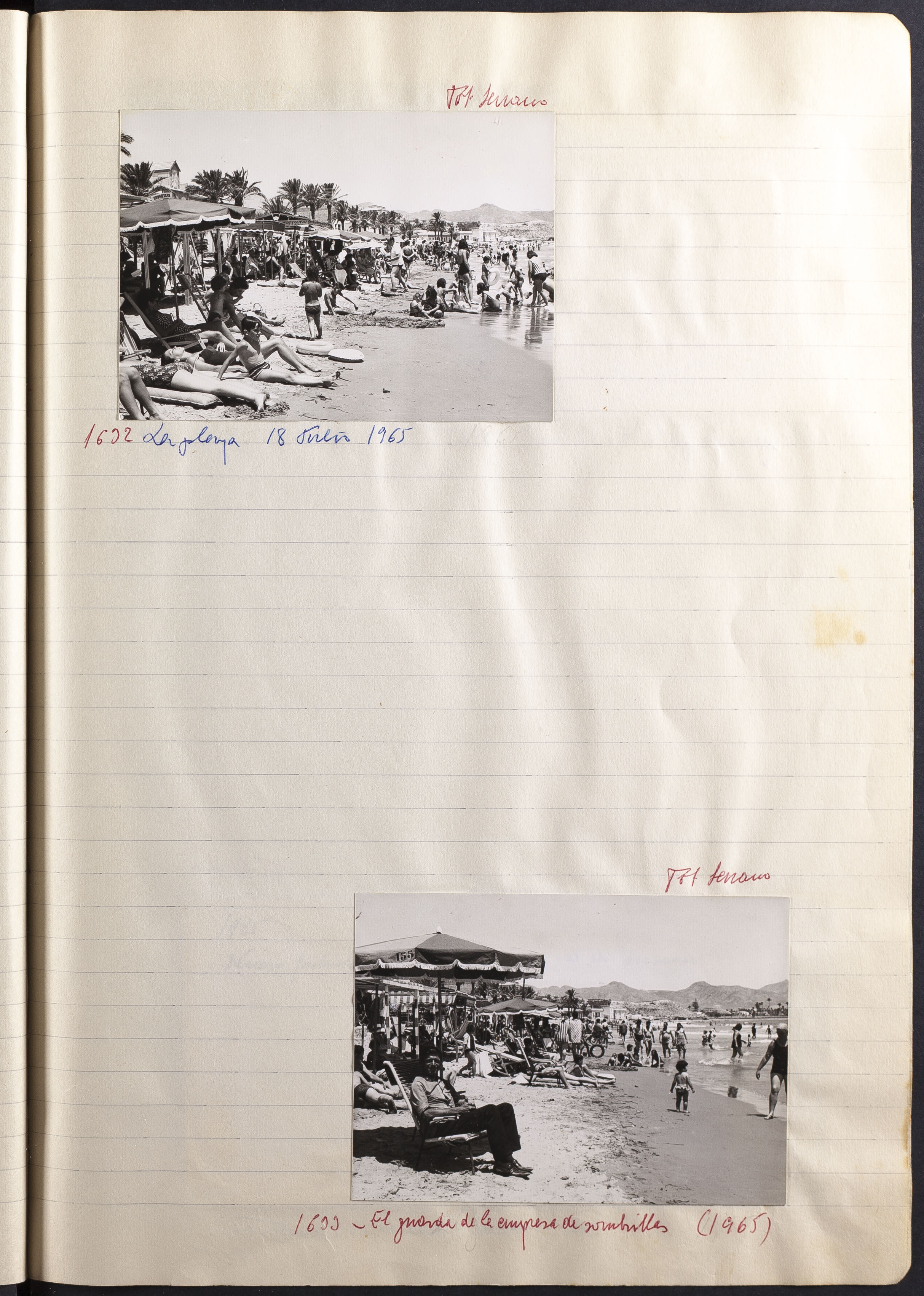 Fotografía 1633: El guarda de la empresa de sombrillas (1965). Figura escrito a mano el origen de la fotografía: FOT. Serrano. Tamaño: 7,5 x 10,5 cm