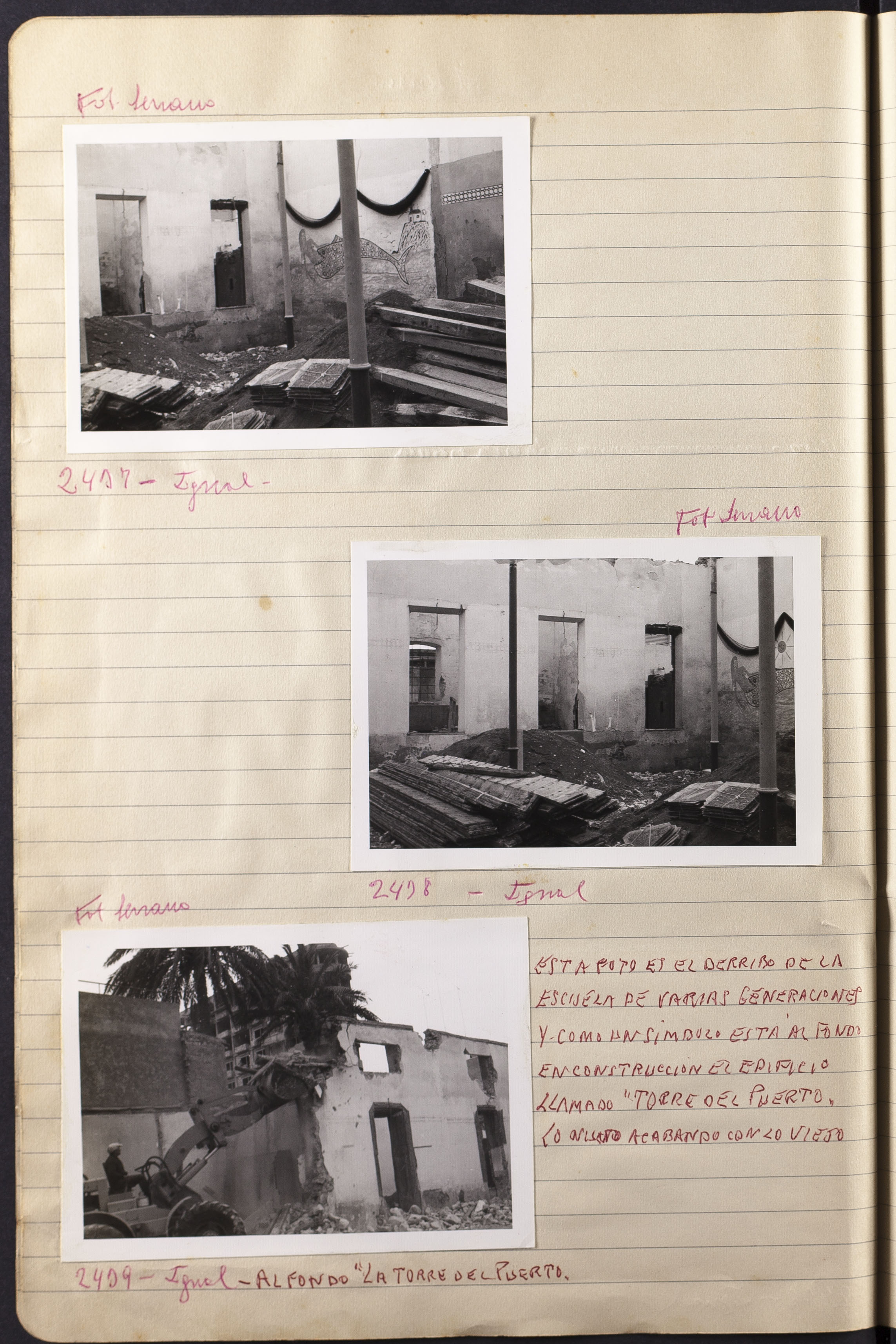 Comentario de la fotografía 2439: ESTA FOTO ES EL DERRIBO DE LA ESCUELA DE VARIAS GENERACIONES Y COMO UN SÍMBOLO ESTÁ AL FONDO EN CONSTRUCCIÓN EL EDIFICIO LLAMADO "TORRE DEL PUERTO" LO NUEVO ACABANDO CON LO VIEJO.