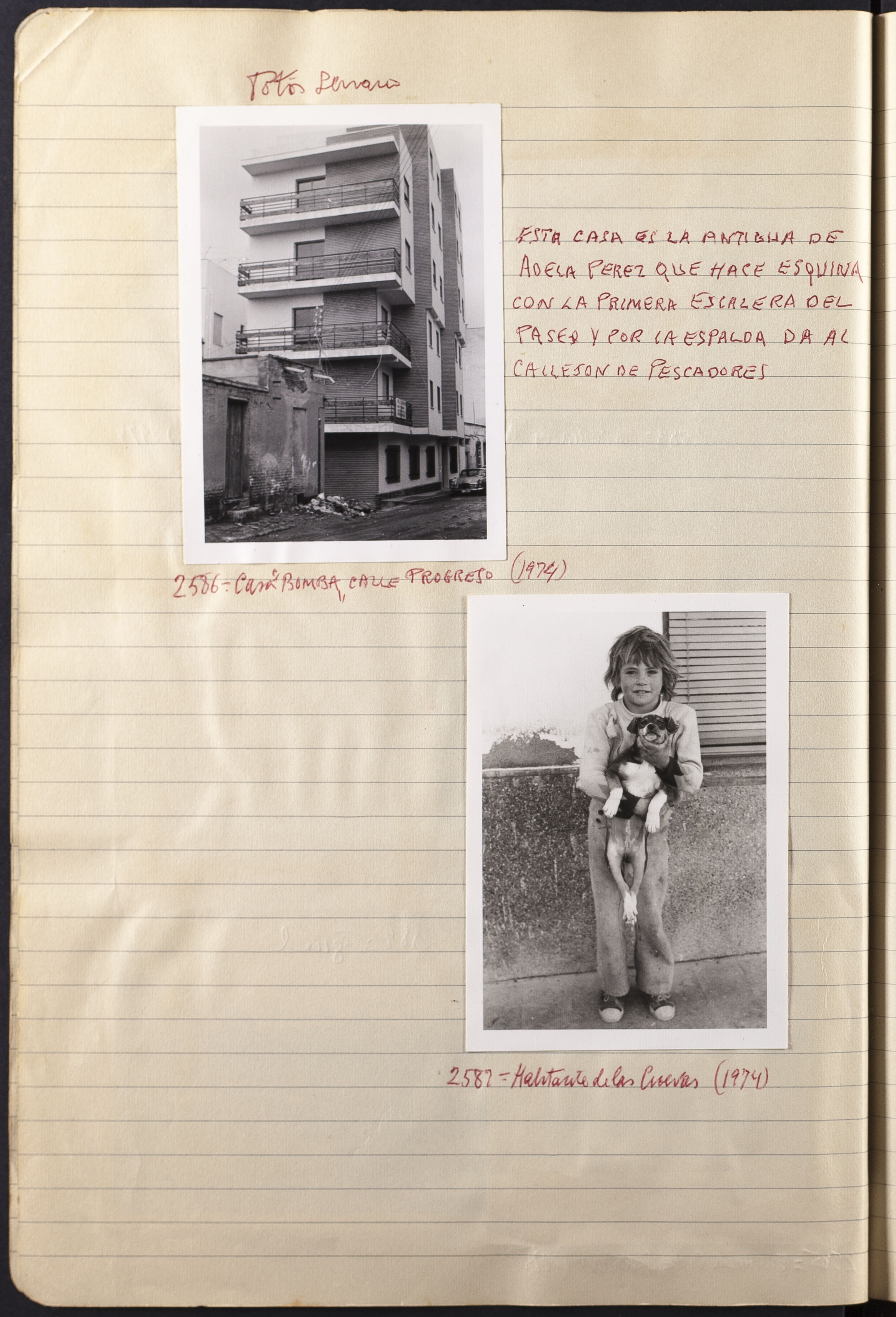 Papel con información manuscrita a bolígrafo tamaño 22 x31 cm. Incluye fotografías monocromas en diferentes tamaños que se especifican en el Alcance y contenido.
