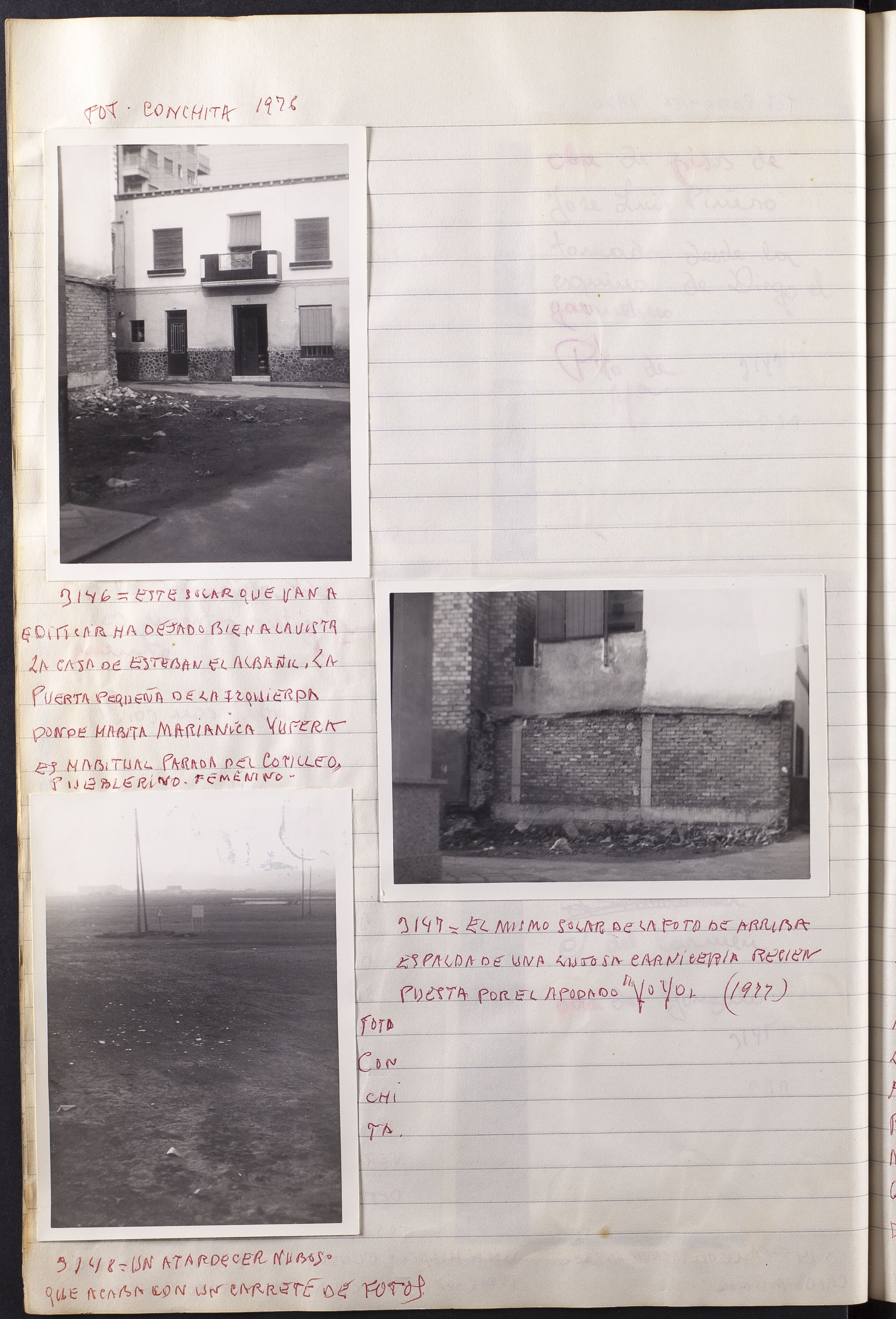 Papel con información manuscrita a bolígrafo tamaño 22 x31 cm. Incluye fotografías monocromas en diferentes tamaños que se especifican en el Alcance y contenido.