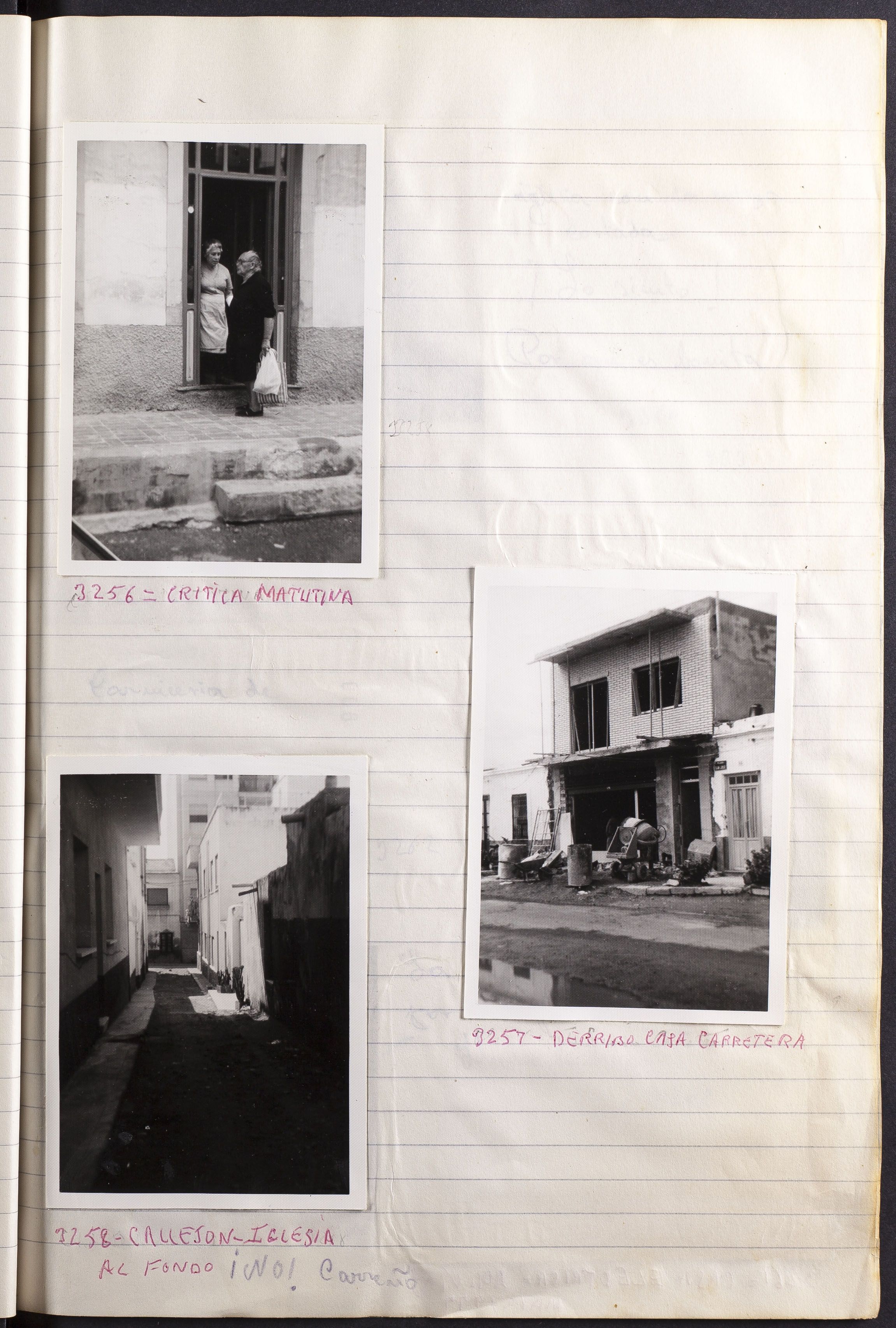 Papel con información manuscrita a bolígrafo tamaño 22 x31 cm. Incluye fotografías monocromas en diferentes tamaños que se especifican en el Alcance y contenido.