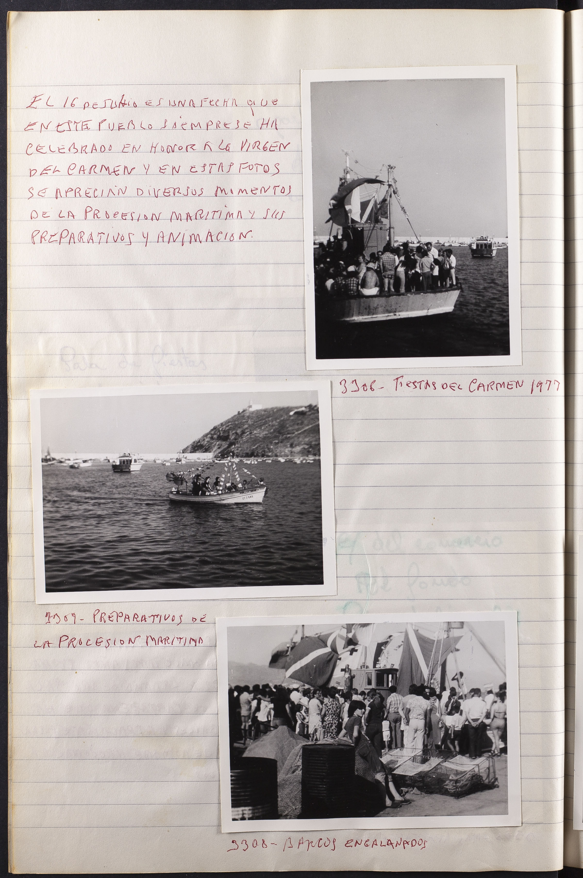 Comentario de las fotografías: EL 16 DE JULIO ES UNA FECHA QUE EN ESTE PUEBLO SIEMPRE SE HA CELEBRADO EN HONOR A LA VIRGEN DEL CARMEN Y EN ESTAS FOTOS SE APRECIAN DIVERSOS MOMENTOS DE LA PROCESIÓN MARÍTIMA Y SUS PREPARATIVOS Y ANIMACIÓN.