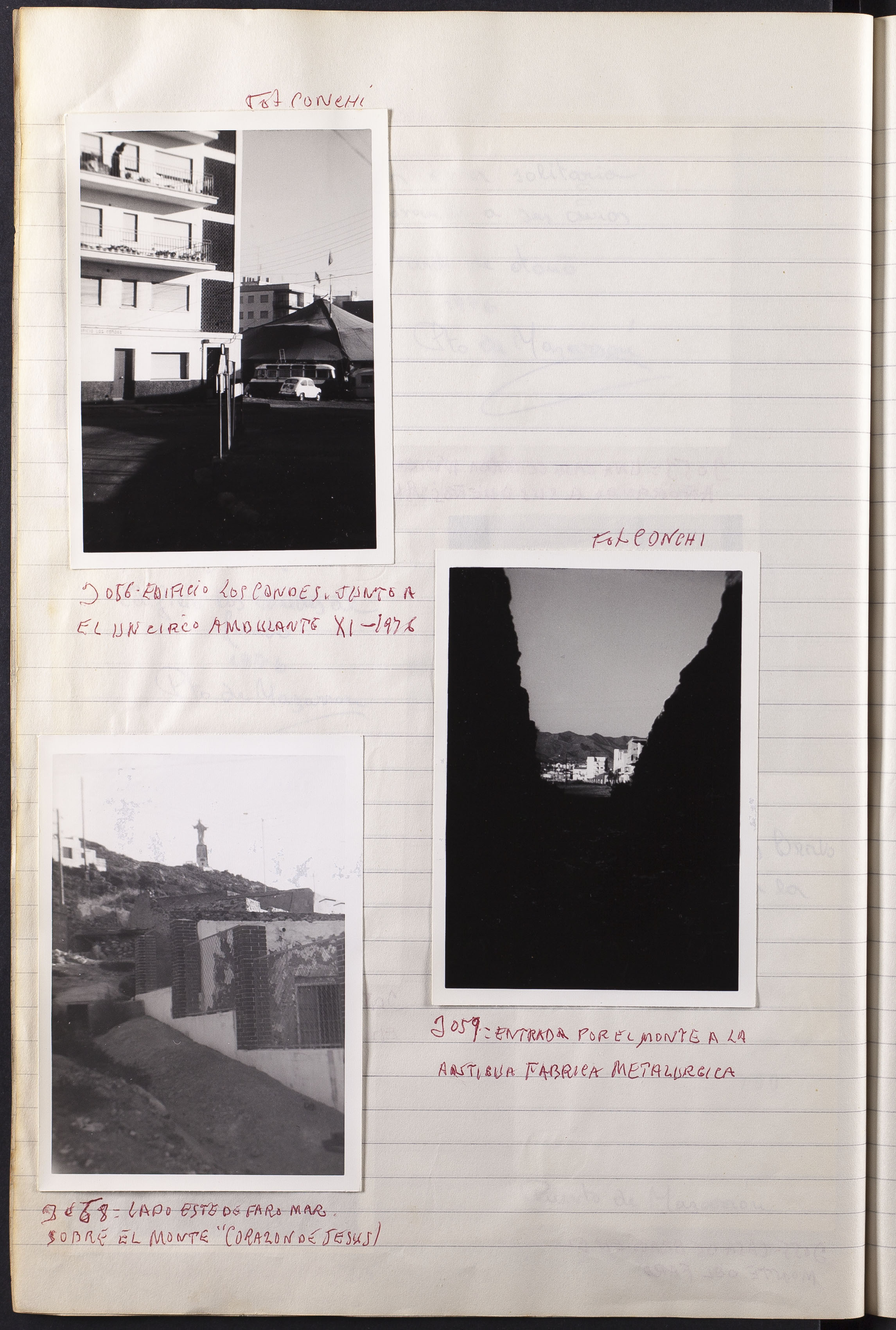 Papel con información manuscrita a bolígrafo tamaño 22 x31 cm. Incluye fotografías monocromas en diferentes tamaños que se especifican en el Alcance y contenido.