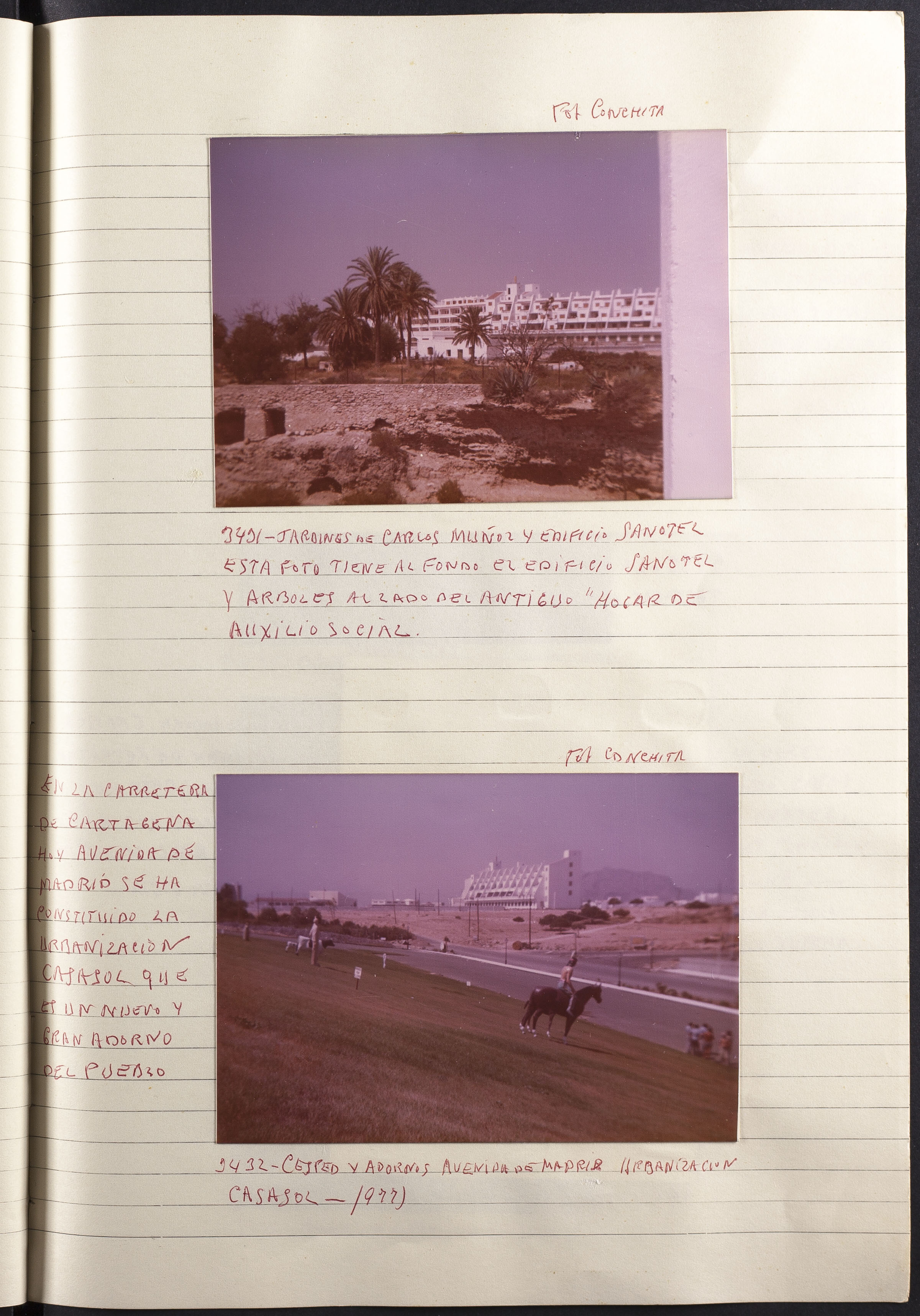Papel con información manuscrita a bolígrafo tamaño 22 x31 cm. Incluye fotografías policromas en diferentes tamaños que se especifican en el Alcance y contenido.