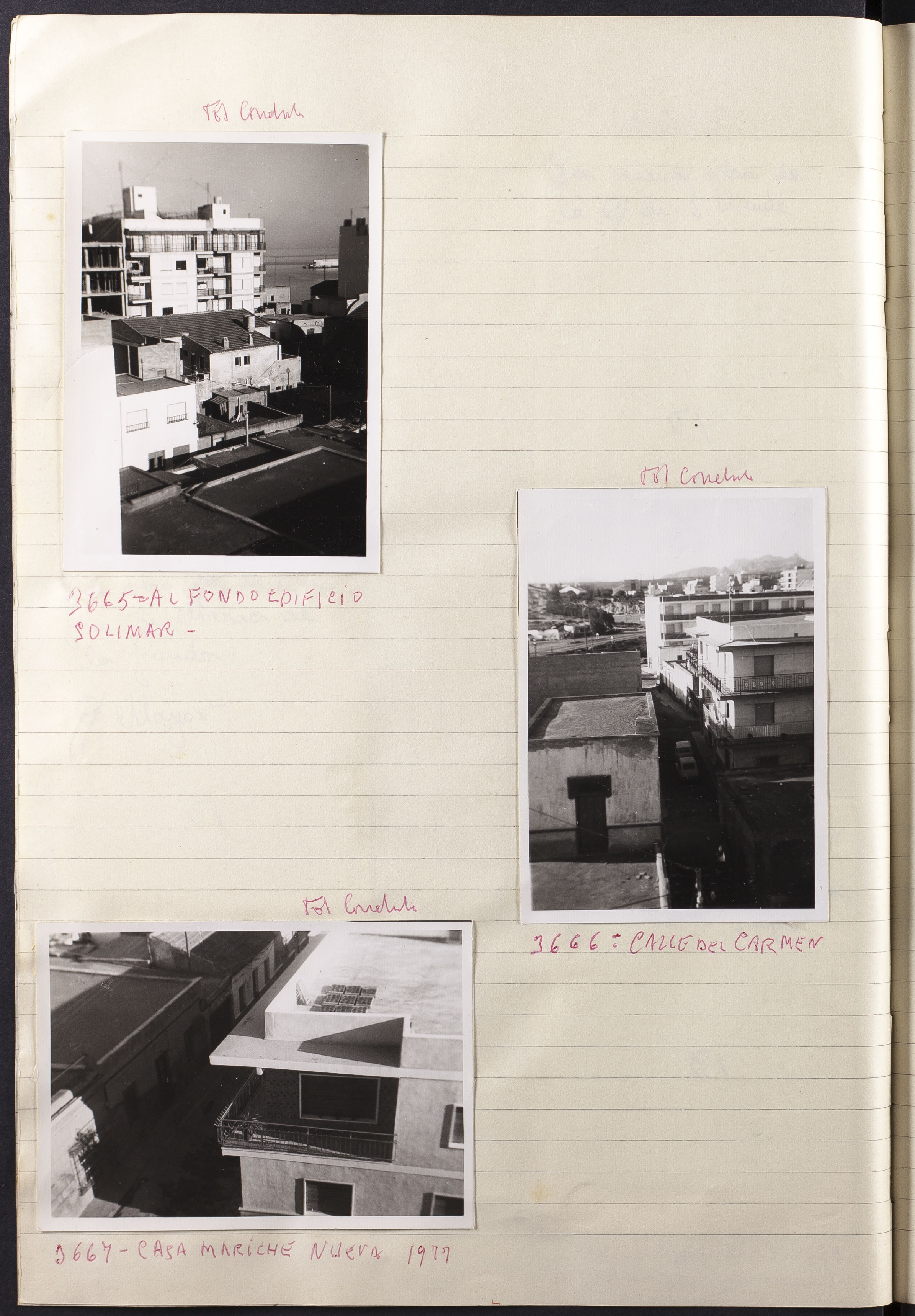 Papel con información manuscrita a bolígrafo tamaño 22 x31 cm. Incluye fotografías monocromas en diferentes tamaños que se especifican en el Alcance y contenido.