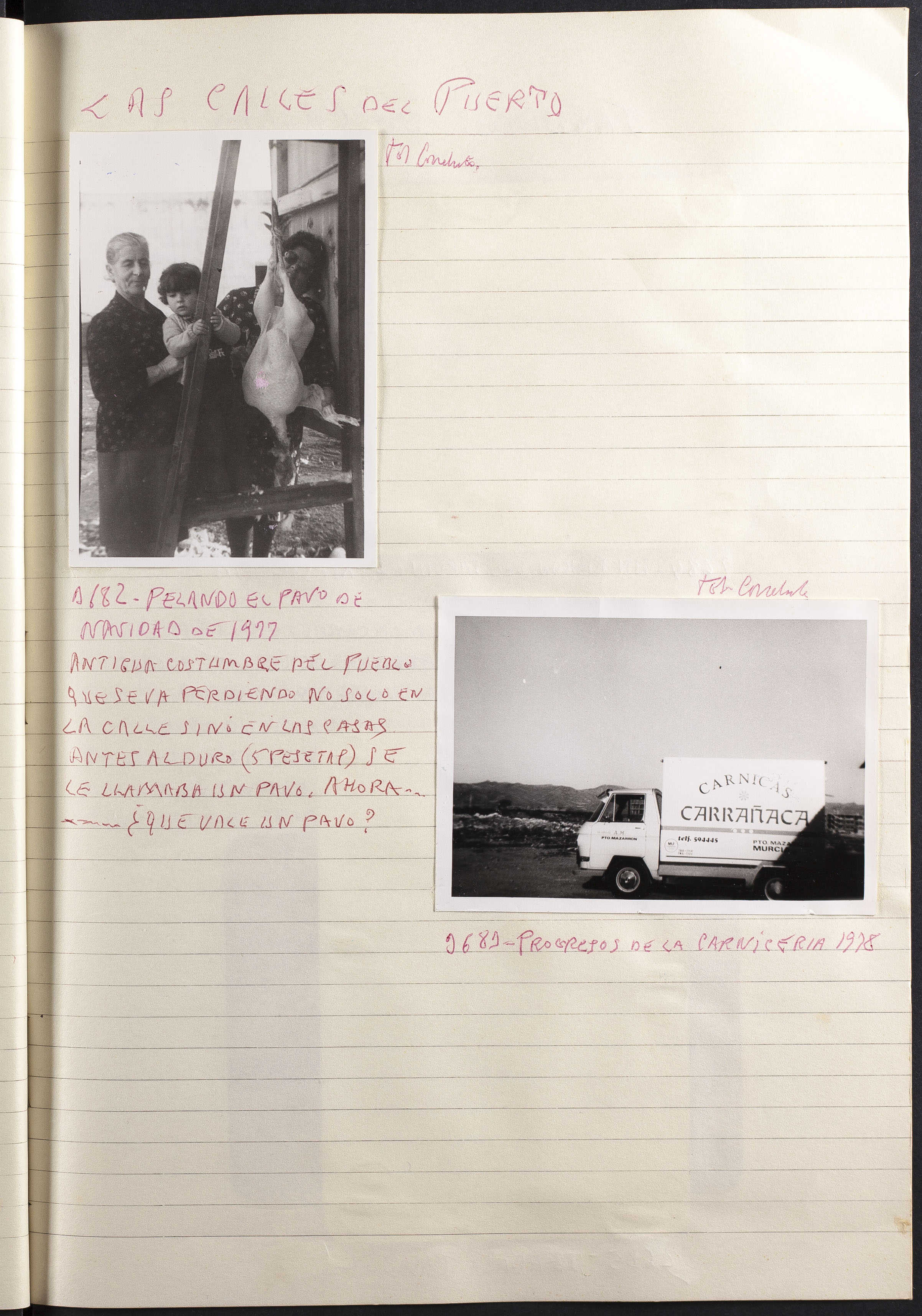 Papel con información manuscrita a bolígrafo tamaño 22 x31 cm. Incluye fotografías monocromas en diferentes tamaños que se especifican en el Alcance y contenido.