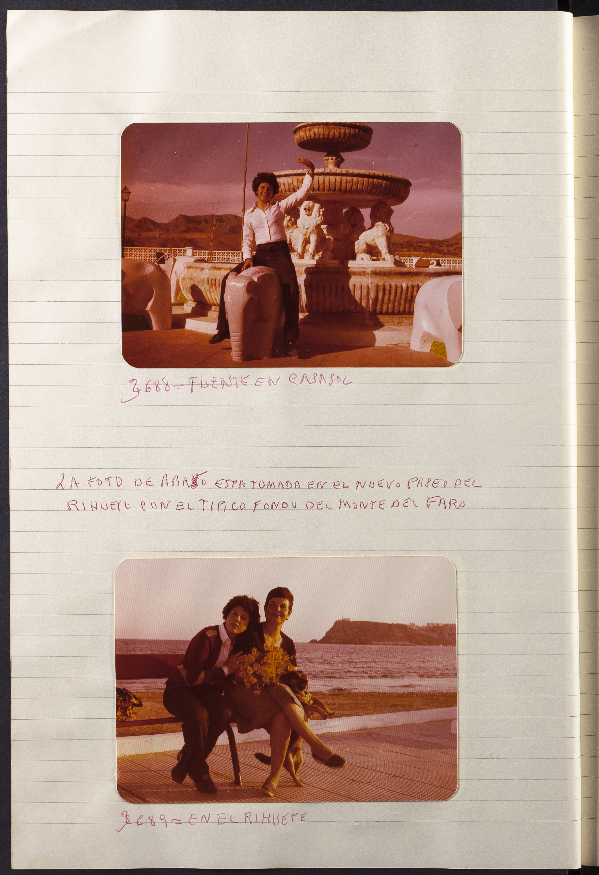 Papel con información manuscrita a bolígrafo tamaño 22 x31 cm. Incluye fotografías policromas en diferentes tamaños que se especifican en el Alcance y contenido.